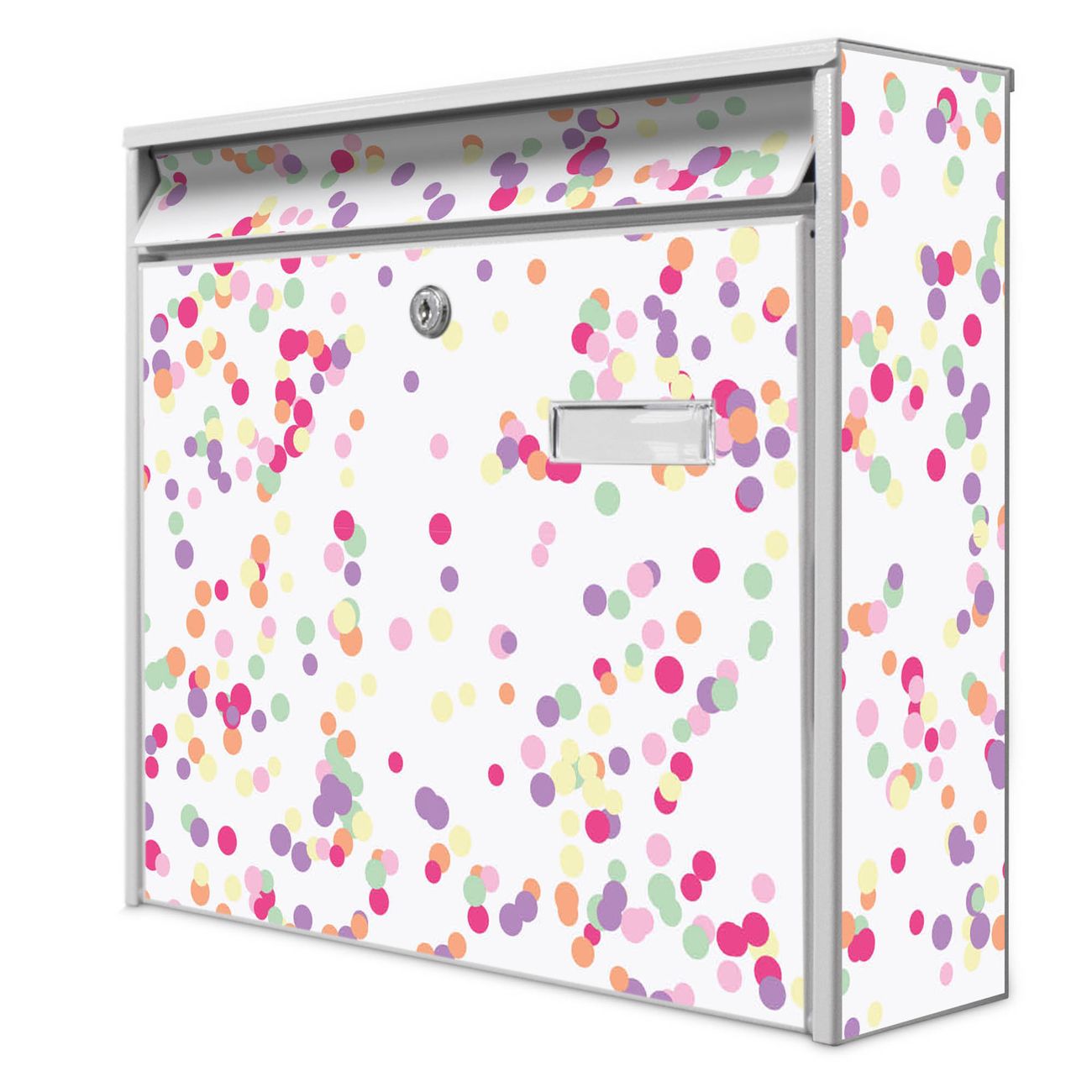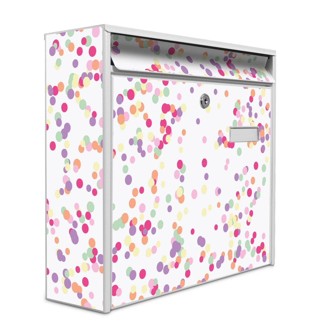 Der Burg Wächter Mail Briefkasten mit Motiv Konfettiregen bietet Ihnen mit seinem Fassungsvermögen genügend Platz auch für große A4 Sendungen. Auf Wunsch können Sie bei uns den passenden Standfuß kaufen und so aus dem Wandbriefkasten einen Standbriefkasten machen. Wir bieten Ihnen ebenfalls Namensschilder, bereits beschriftet oder frei zu beschriften, und verschiedene selbst gestaltete Bitte-Keine-Werbung-Aufkleber.