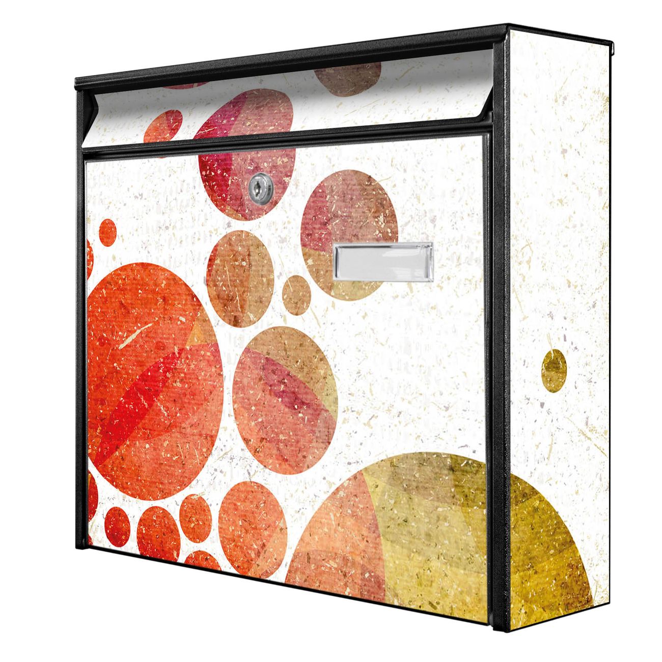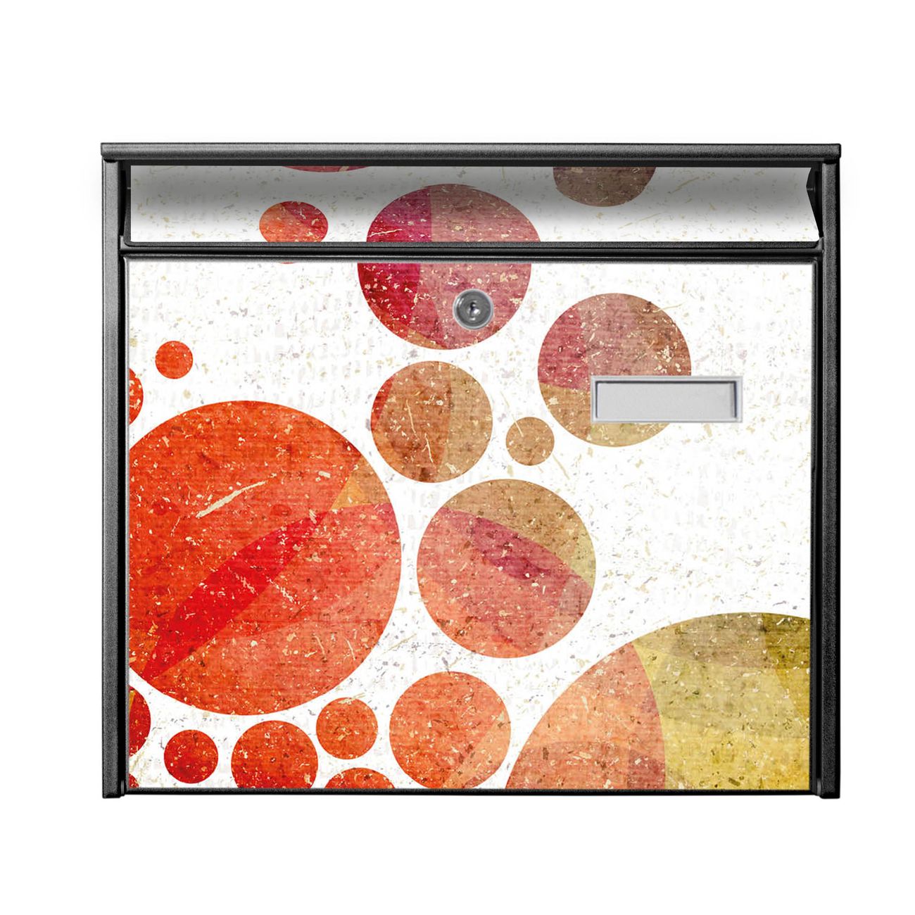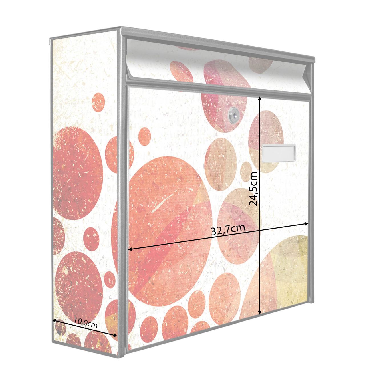 Der Postkasten mit Motiv Kreise hat ein sehr ansprechendes und zeitloses Design. Heben Sie Sich von der tristen grauen Masse ab, ohne auf Funktionalität zu verzichten. Die weite Öffnung ohne scharfe Kanten ermöglicht eine einfache Handhabung beim Entnehmen der Post. Die Größe bietet genügend Platz für Sendungen aller Art, der Einwurf fasst auch größere A4 Sendungen. Ihr Burg-Wächter Motivbriefkasten wird in Sachsen in einer kleinen Manufaktur von Hand veredelt. Die Motivfolie ist lösungsmittelfrei und schutzlaminiert, dies sorgt für einen langen Halt. Wir legen großen Wert auf die Verbindung von Funktionalität und Design.