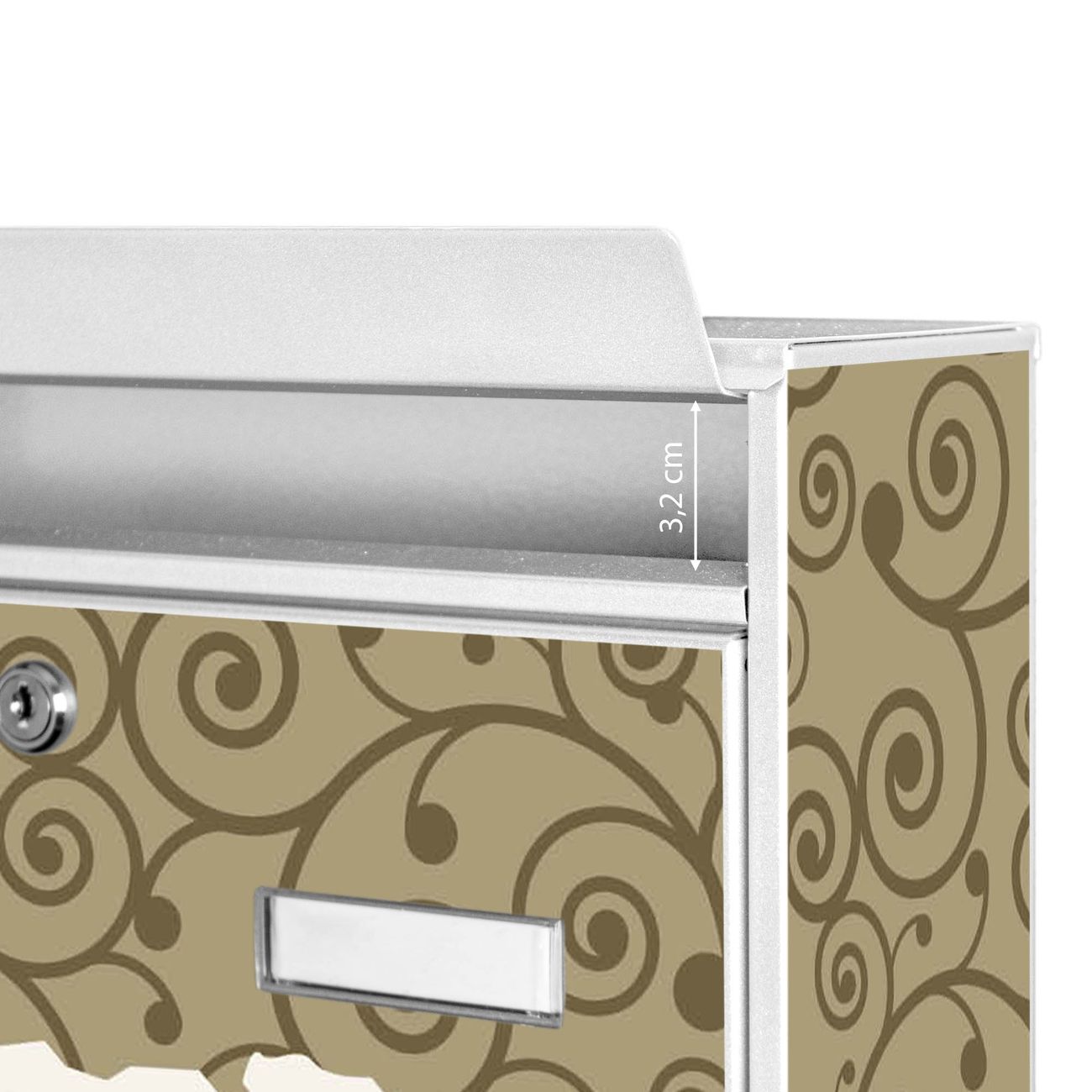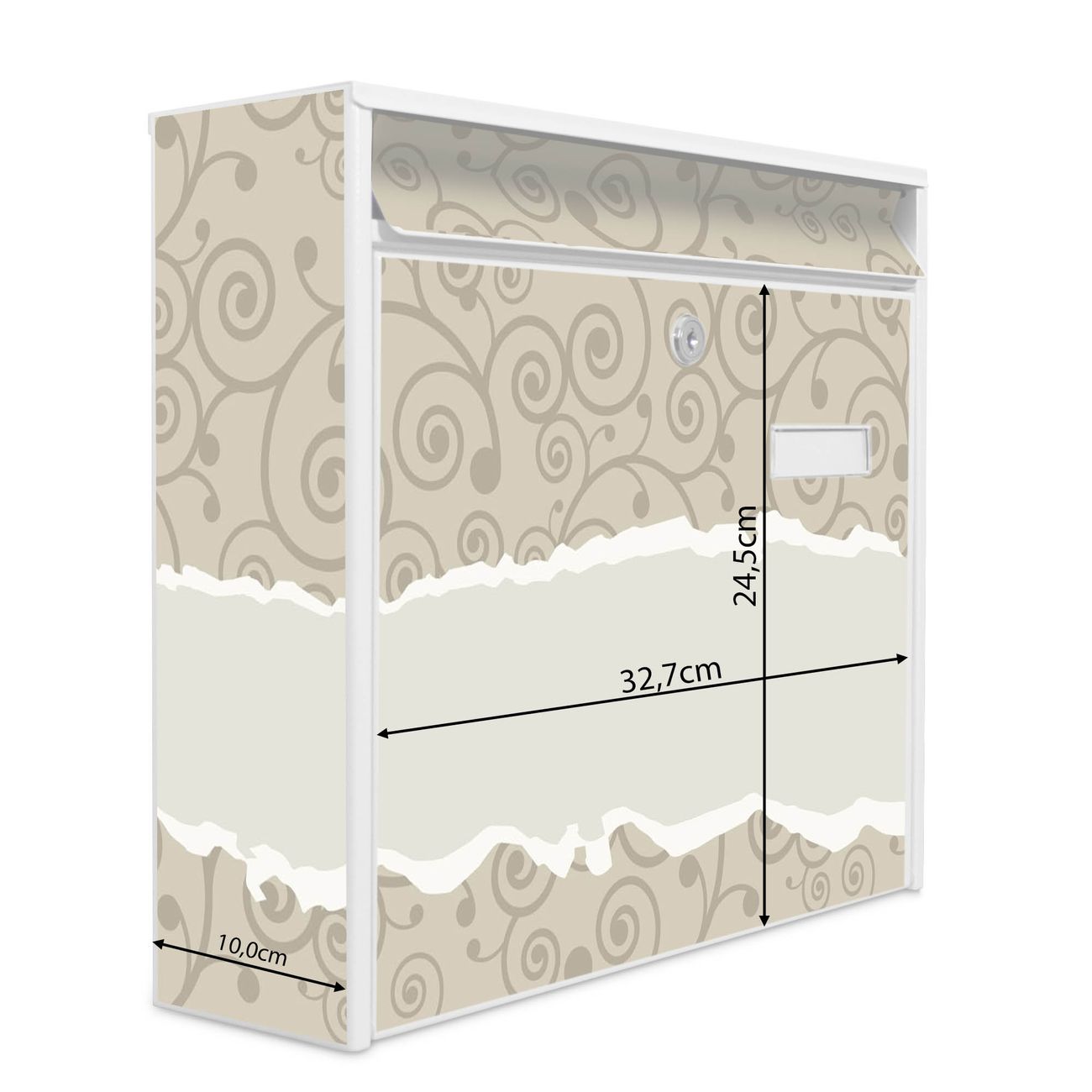 Die Größe des Briefkastens ist 36 x 32 x 10cm (BxHxT) groß. Das Motiv besteht aus einer wetter- und UV-festen Folie, die mit einem Schutzlaminat überzogen ist und Ihren Briefkasten zusätzlich vor Kratzern schützt. Sie erhalten 2 Schlüssel sowie das Montagematerial.