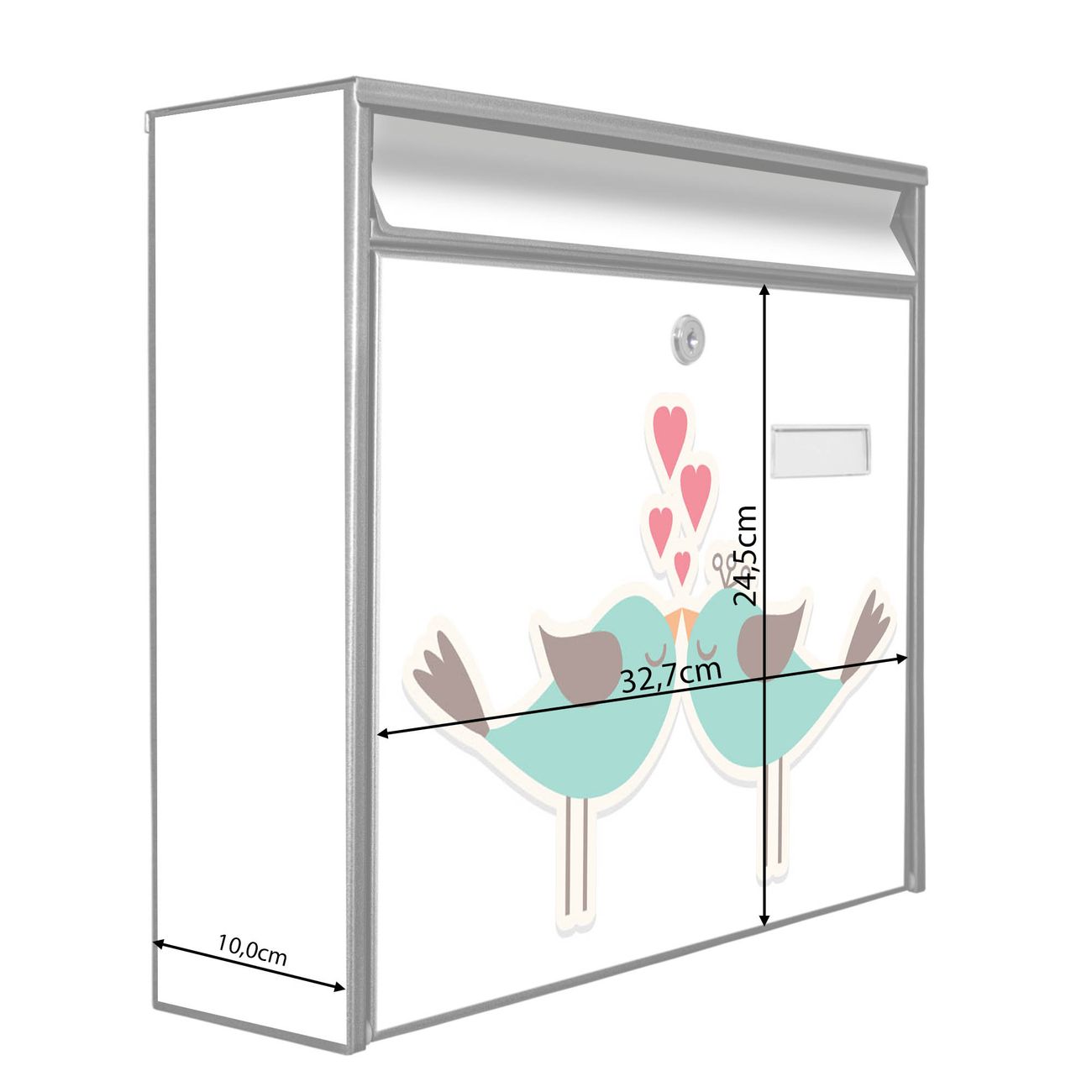 Die Größe des Briefkastens ist 36 x 32 x 10cm (BxHxT) groß. Das Motiv besteht aus einer wetter- und UV-festen Folie, die mit einem Schutzlaminat überzogen ist und Ihren Briefkasten zusätzlich vor Kratzern schützt. Sie erhalten 2 Schlüssel sowie das Montagematerial.