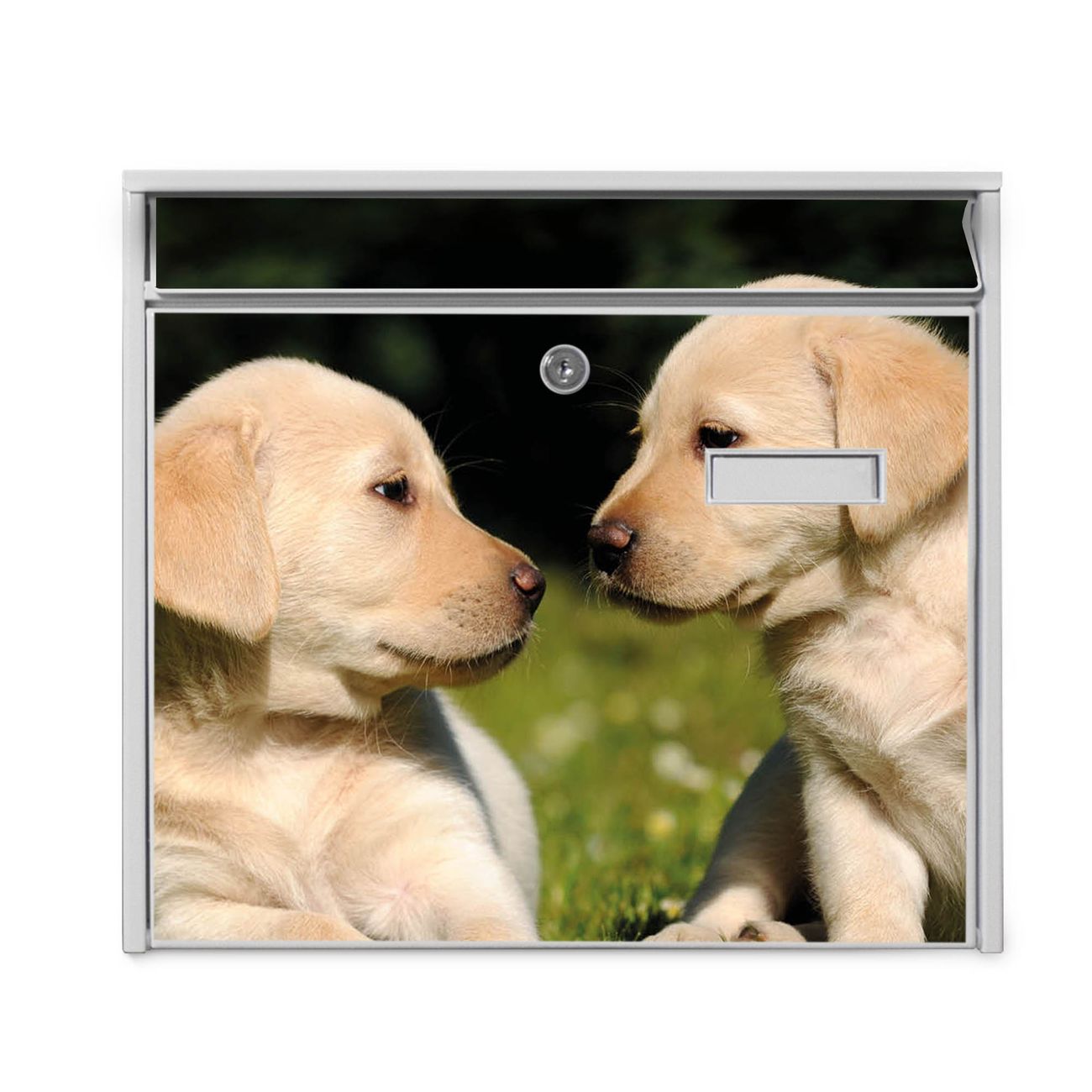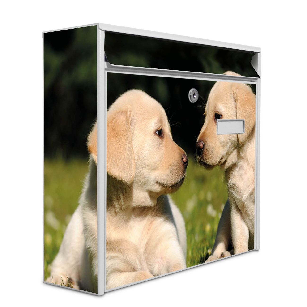 Der Burg Wächter Mail Briefkasten mit Motiv Labrador bietet Ihnen mit seinem Fassungsvermögen genügend Platz auch für große A4 Sendungen. Auf Wunsch können Sie bei uns den passenden Standfuß kaufen und so aus dem Wandbriefkasten einen Standbriefkasten machen. Wir bieten Ihnen ebenfalls Namensschilder, bereits beschriftet oder frei zu beschriften, und verschiedene selbst gestaltete Bitte-Keine-Werbung-Aufkleber.