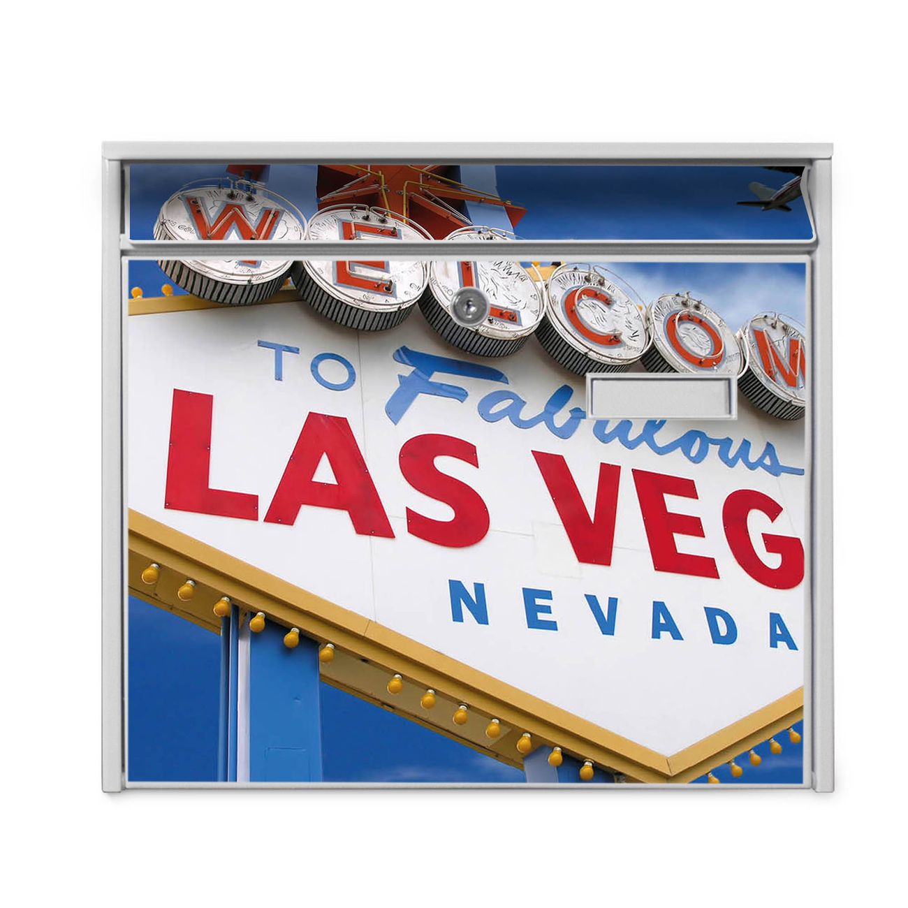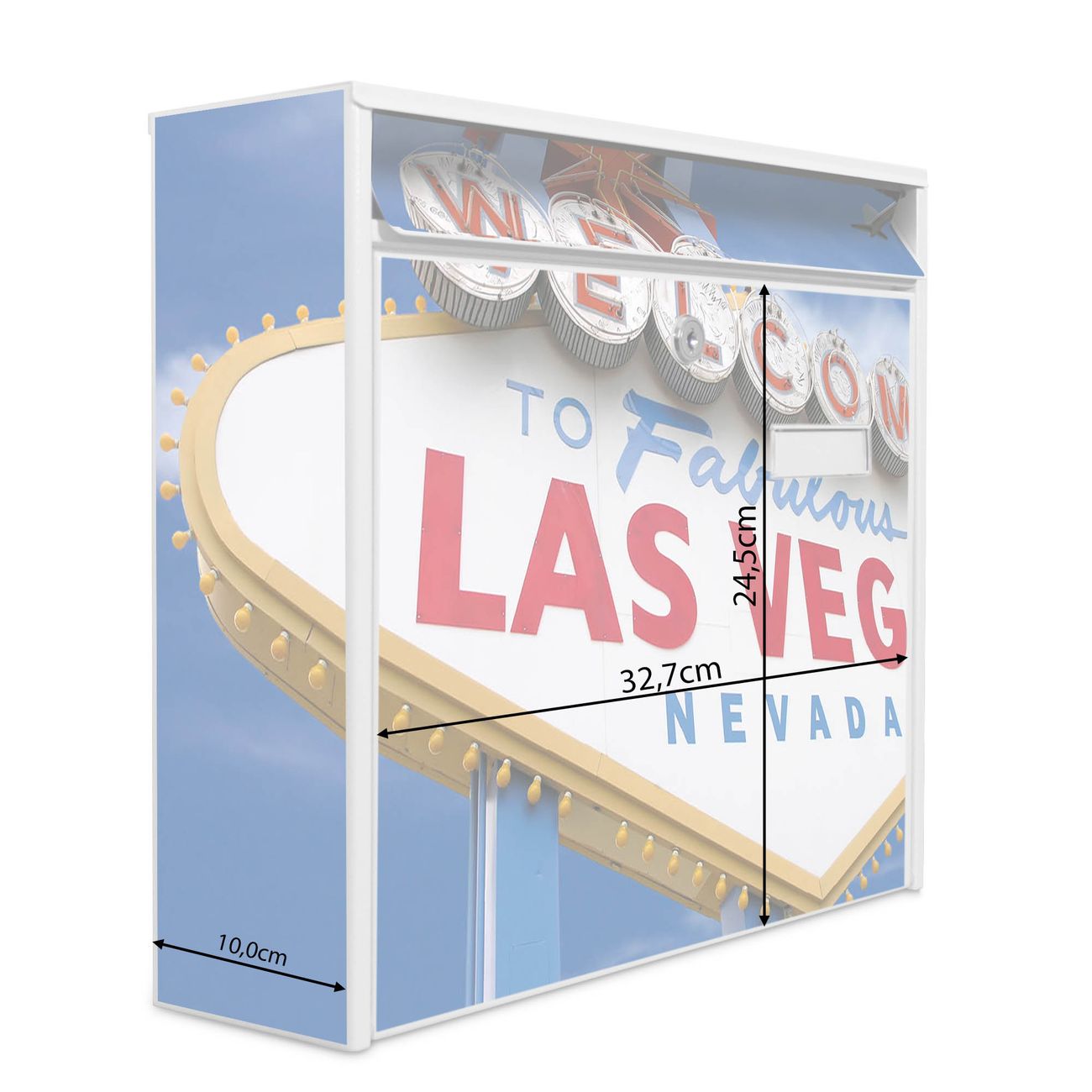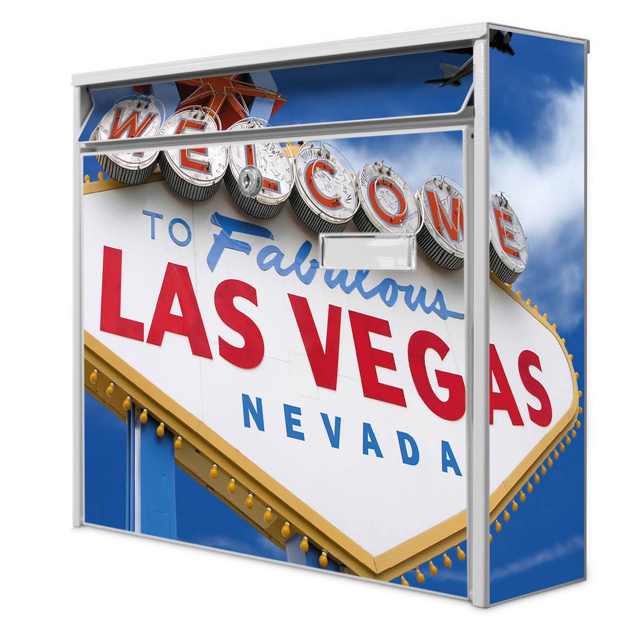 Der Burg Wächter Mail Briefkasten mit Motiv Las Vegas bietet Ihnen mit seinem Fassungsvermögen genügend Platz auch für große A4 Sendungen. Auf Wunsch können Sie bei uns den passenden Standfuß kaufen und so aus dem Wandbriefkasten einen Standbriefkasten machen. Wir bieten Ihnen ebenfalls Namensschilder, bereits beschriftet oder frei zu beschriften, und verschiedene selbst gestaltete Bitte-Keine-Werbung-Aufkleber.