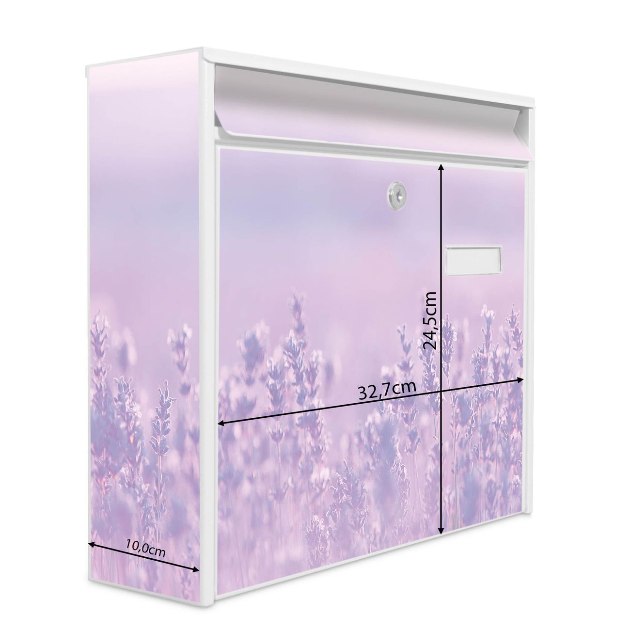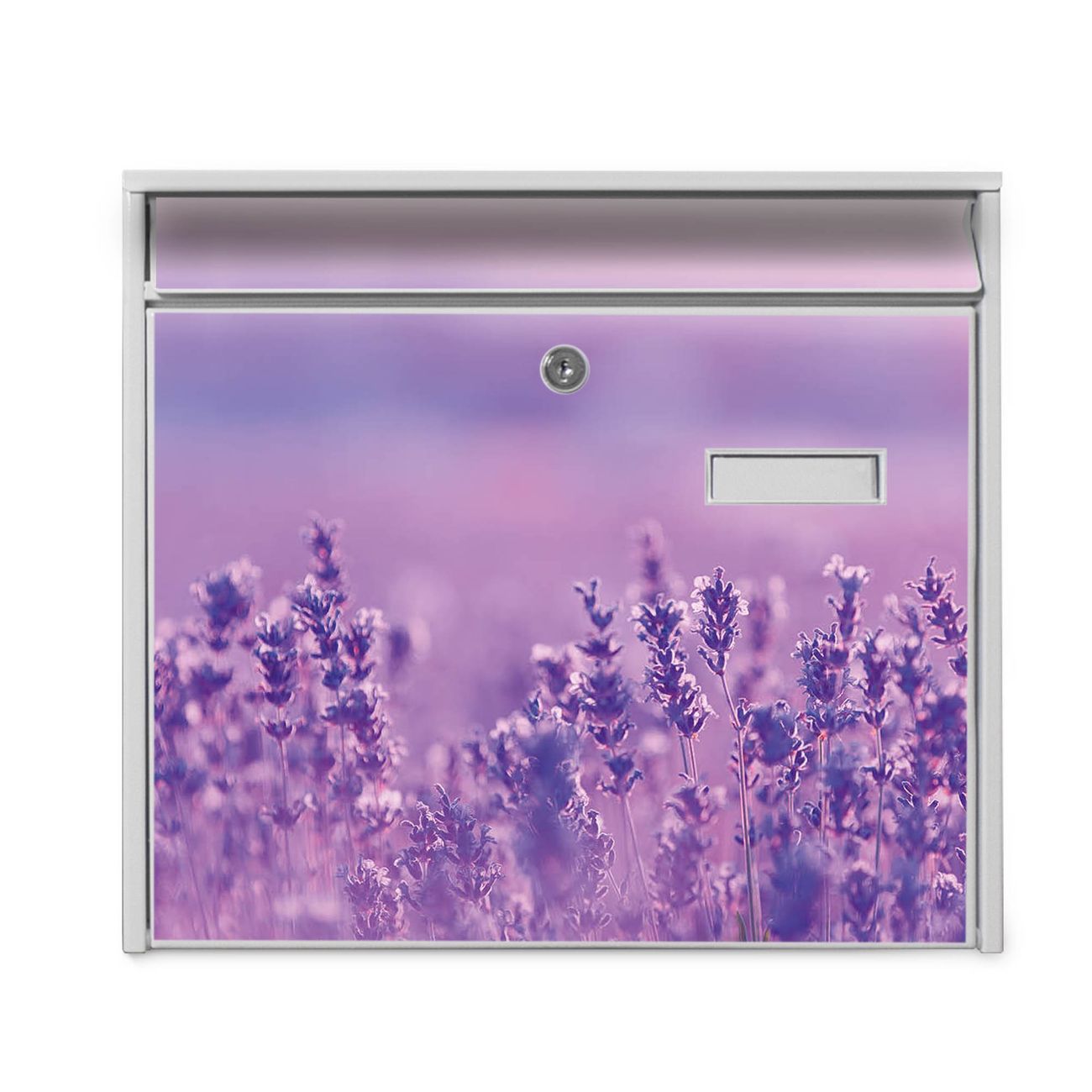Der Burg Wächter Mail Briefkasten mit Motiv Lavendelmeer bietet Ihnen mit seinem Fassungsvermögen genügend Platz auch für große A4 Sendungen. Auf Wunsch können Sie bei uns den passenden Standfuß kaufen und so aus dem Wandbriefkasten einen Standbriefkasten machen. Wir bieten Ihnen ebenfalls Namensschilder, bereits beschriftet oder frei zu beschriften, und verschiedene selbst gestaltete Bitte-Keine-Werbung-Aufkleber.