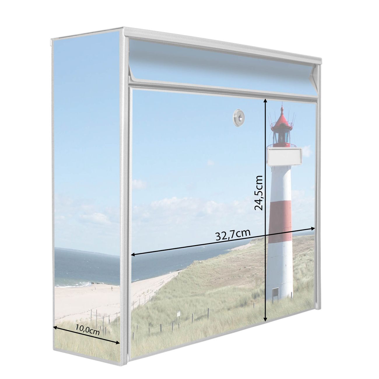 Der Postkasten mit Motiv Leuchtturm hat ein sehr ansprechendes und zeitloses Design. Heben Sie Sich von der tristen grauen Masse ab, ohne auf Funktionalität zu verzichten. Die weite Öffnung ohne scharfe Kanten ermöglicht eine einfache Handhabung beim Entnehmen der Post. Die Größe bietet genügend Platz für Sendungen aller Art, der Einwurf fasst auch größere A4 Sendungen. Ihr Burg-Wächter Motivbriefkasten wird in Sachsen in einer kleinen Manufaktur von Hand veredelt. Die Motivfolie ist lösungsmittelfrei und schutzlaminiert, dies sorgt für einen langen Halt. Wir legen großen Wert auf die Verbindung von Funktionalität und Design.