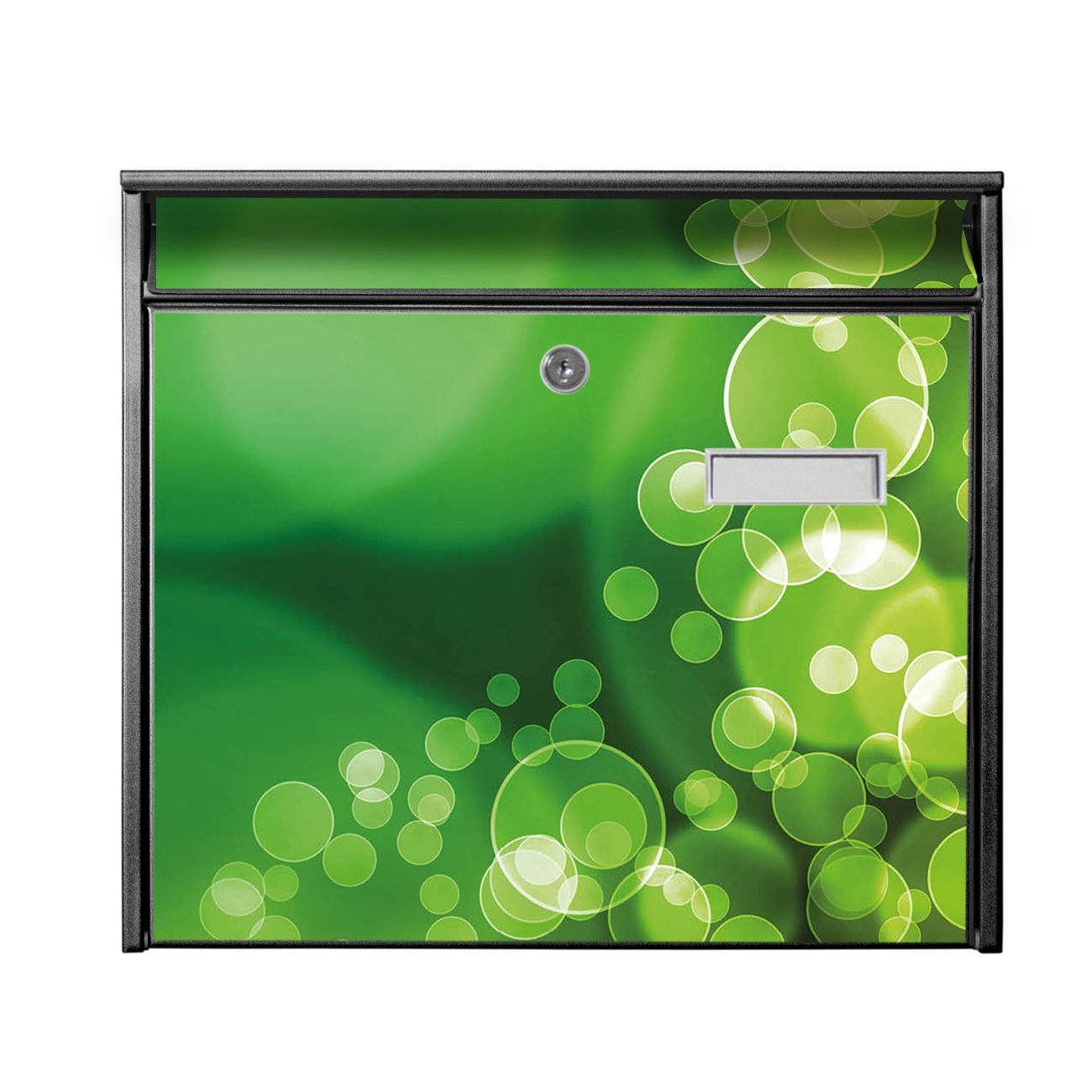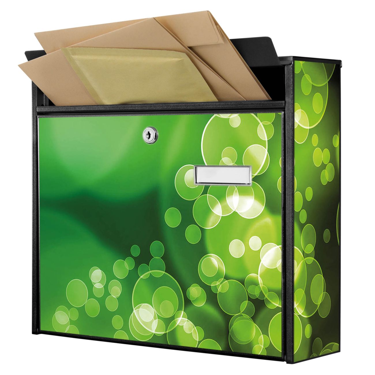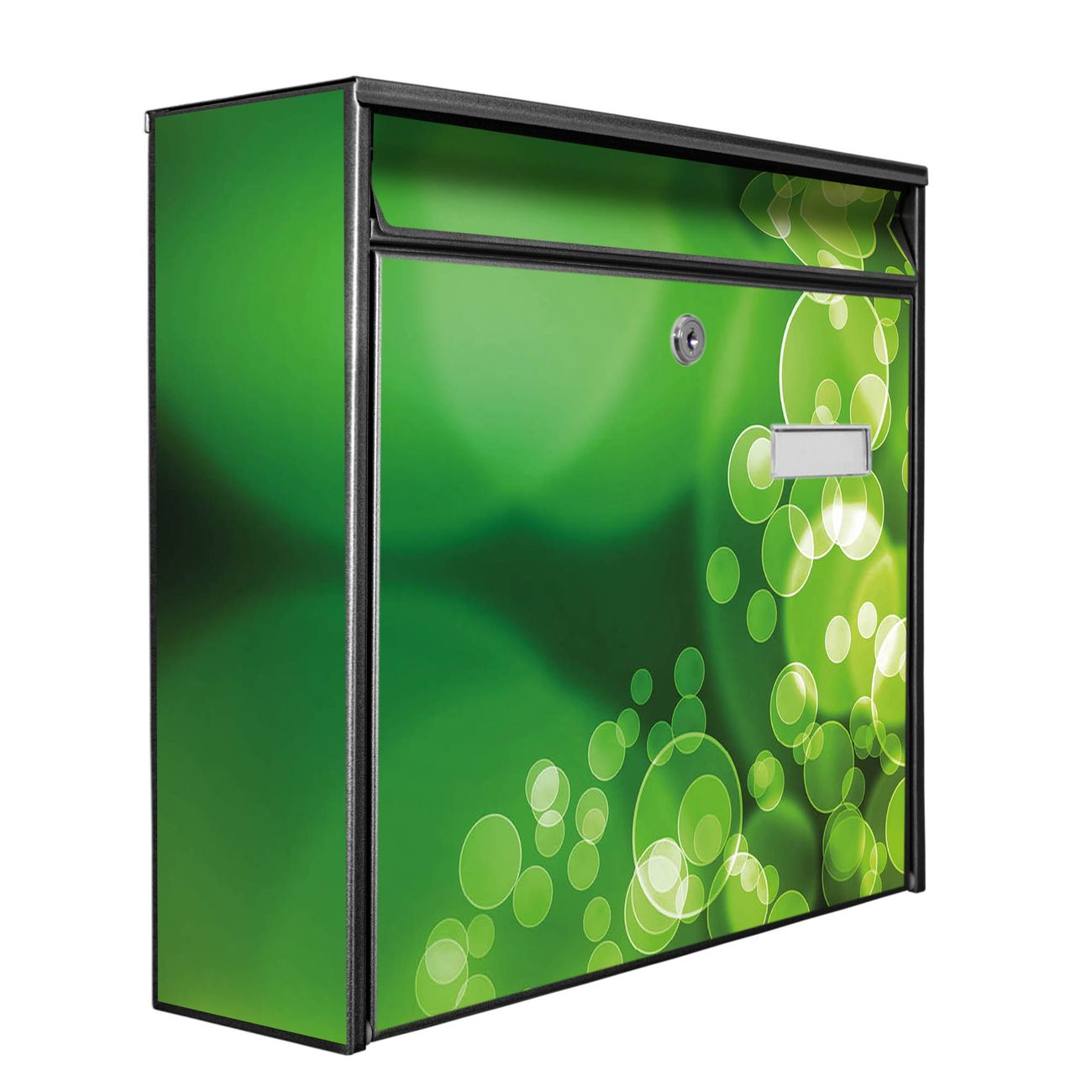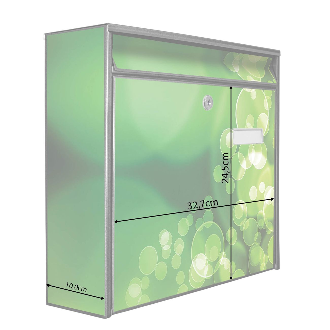 Die Größe des Briefkastens ist 36 x 32 x 10cm (BxHxT) groß. Das Motiv besteht aus einer wetter- und UV-festen Folie, die mit einem Schutzlaminat überzogen ist und Ihren Briefkasten zusätzlich vor Kratzern schützt. Sie erhalten 2 Schlüssel sowie das Montagematerial.