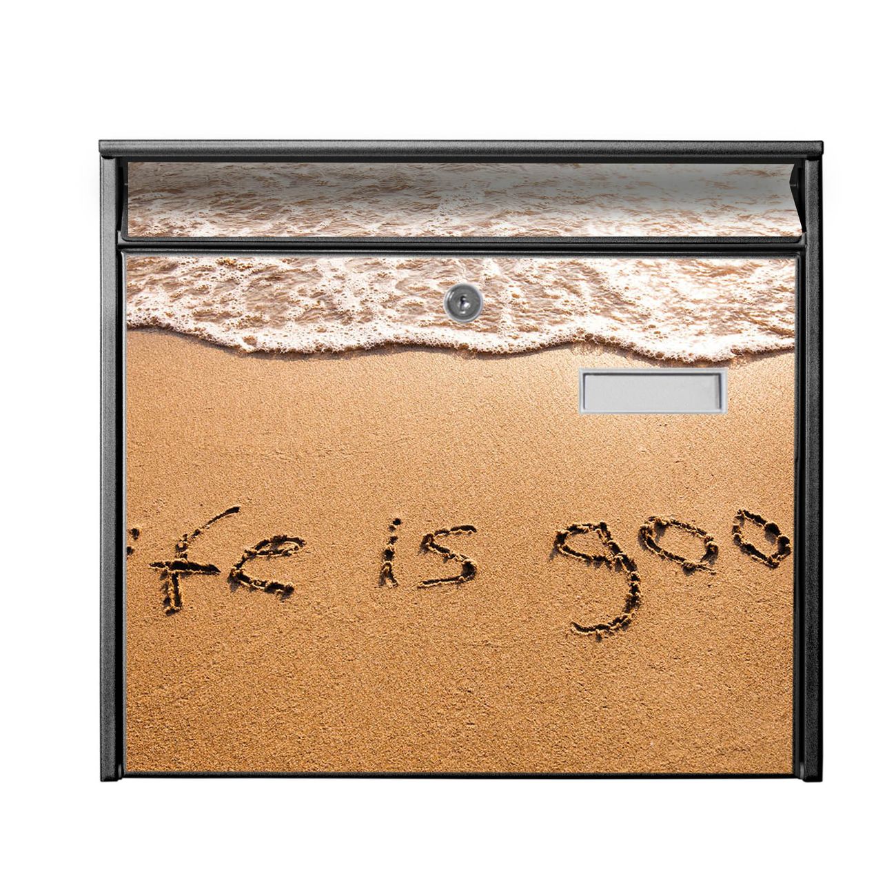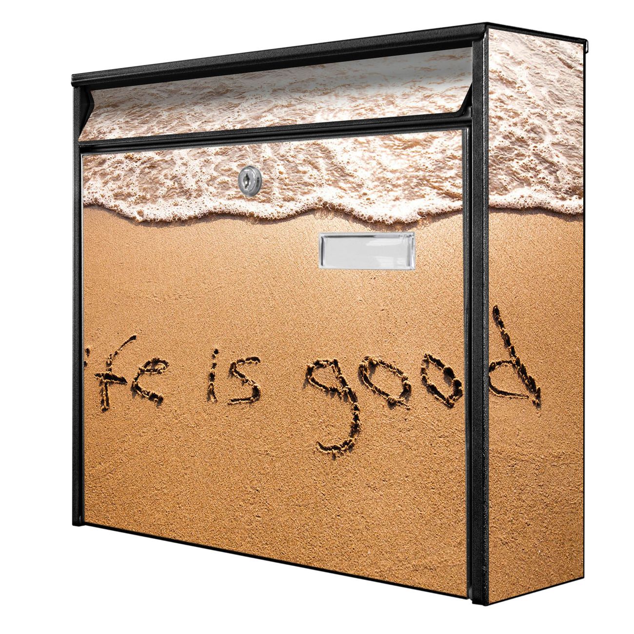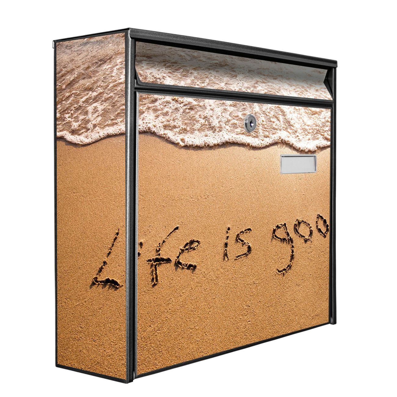 Der Postkasten mit Motiv Life Is Good hat ein sehr ansprechendes und zeitloses Design. Heben Sie Sich von der tristen grauen Masse ab, ohne auf Funktionalität zu verzichten. Die weite Öffnung ohne scharfe Kanten ermöglicht eine einfache Handhabung beim Entnehmen der Post. Die Größe bietet genügend Platz für Sendungen aller Art, der Einwurf fasst auch größere A4 Sendungen. Ihr Burg-Wächter Motivbriefkasten wird in Sachsen in einer kleinen Manufaktur von Hand veredelt. Die Motivfolie ist lösungsmittelfrei und schutzlaminiert, dies sorgt für einen langen Halt. Wir legen großen Wert auf die Verbindung von Funktionalität und Design.