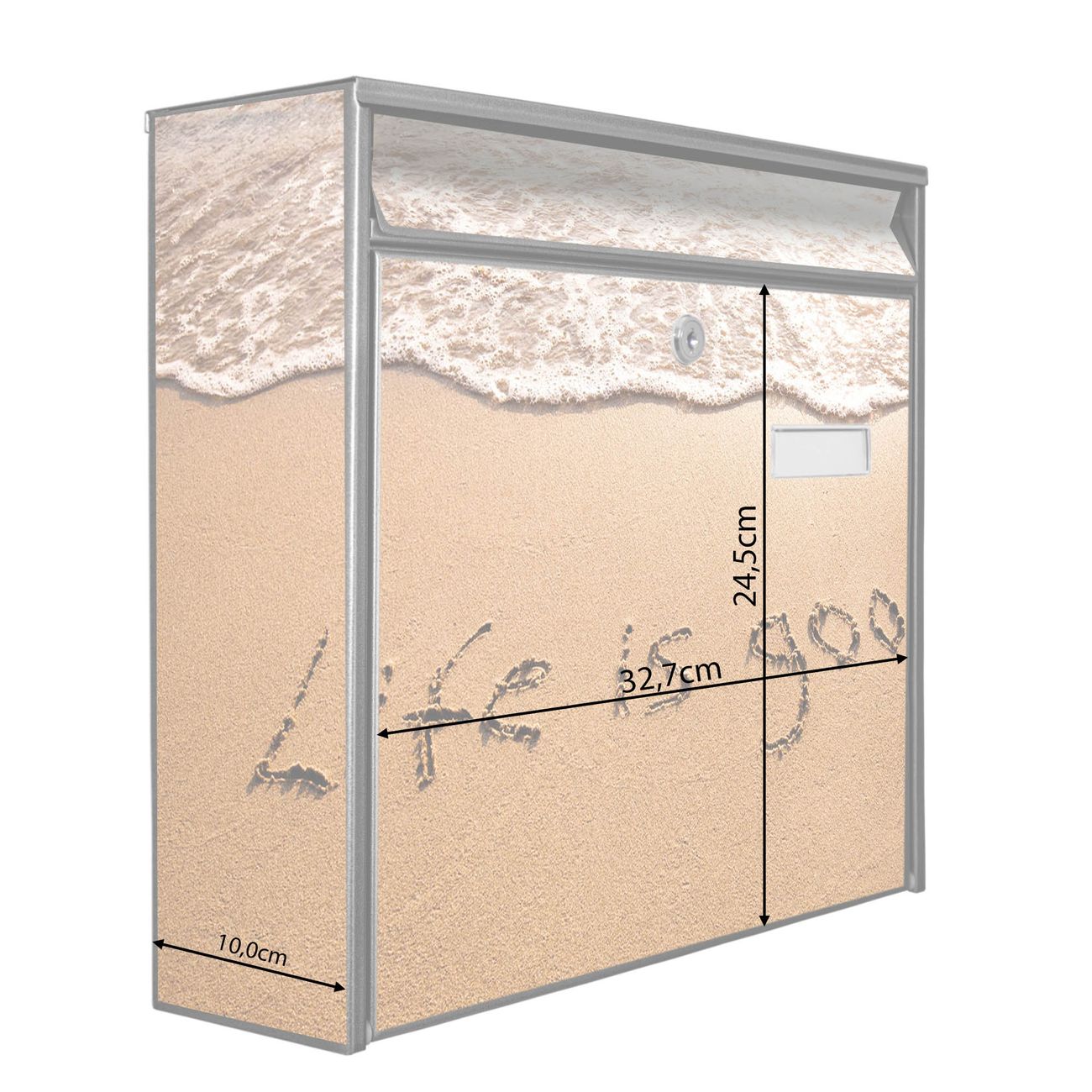 Die Größe des Briefkastens ist 36 x 32 x 10cm (BxHxT) groß. Das Motiv besteht aus einer wetter- und UV-festen Folie, die mit einem Schutzlaminat überzogen ist und Ihren Briefkasten zusätzlich vor Kratzern schützt. Sie erhalten 2 Schlüssel sowie das Montagematerial.