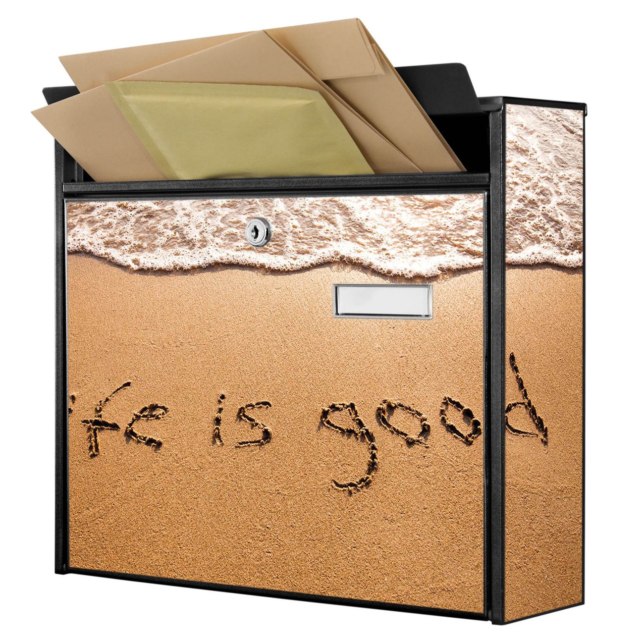 Der Burg Wächter Mail Briefkasten mit Motiv Life Is Good bietet Ihnen mit seinem Fassungsvermögen genügend Platz auch für große A4 Sendungen. Auf Wunsch können Sie bei uns den passenden Standfuß kaufen und so aus dem Wandbriefkasten einen Standbriefkasten machen. Wir bieten Ihnen ebenfalls Namensschilder, bereits beschriftet oder frei zu beschriften, und verschiedene selbst gestaltete Bitte-Keine-Werbung-Aufkleber.