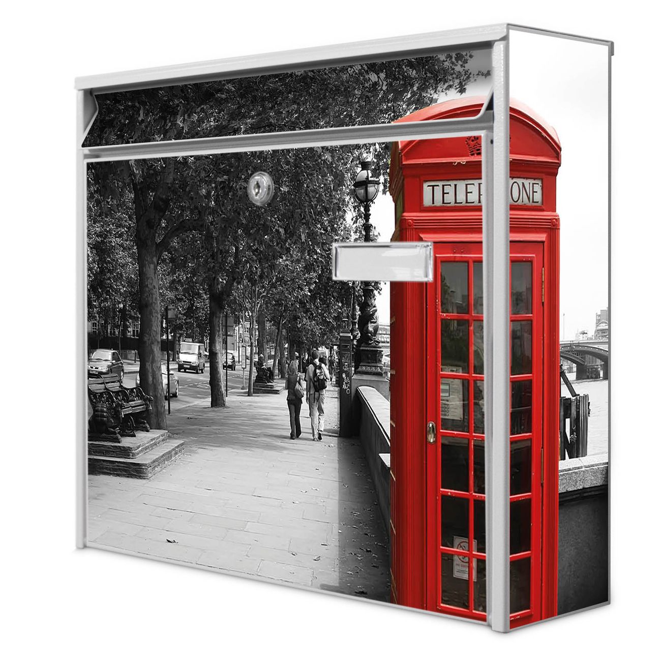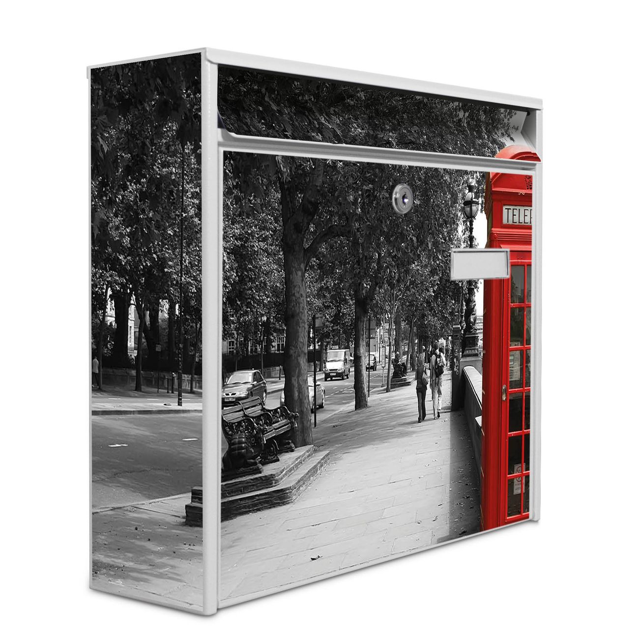 Der Postkasten mit Motiv London Red Telephone hat ein sehr ansprechendes und zeitloses Design. Heben Sie Sich von der tristen grauen Masse ab, ohne auf Funktionalität zu verzichten. Die weite Öffnung ohne scharfe Kanten ermöglicht eine einfache Handhabung beim Entnehmen der Post. Die Größe bietet genügend Platz für Sendungen aller Art, der Einwurf fasst auch größere A4 Sendungen. Ihr Burg-Wächter Motivbriefkasten wird in Sachsen in einer kleinen Manufaktur von Hand veredelt. Die Motivfolie ist lösungsmittelfrei und schutzlaminiert, dies sorgt für einen langen Halt. Wir legen großen Wert auf die Verbindung von Funktionalität und Design.