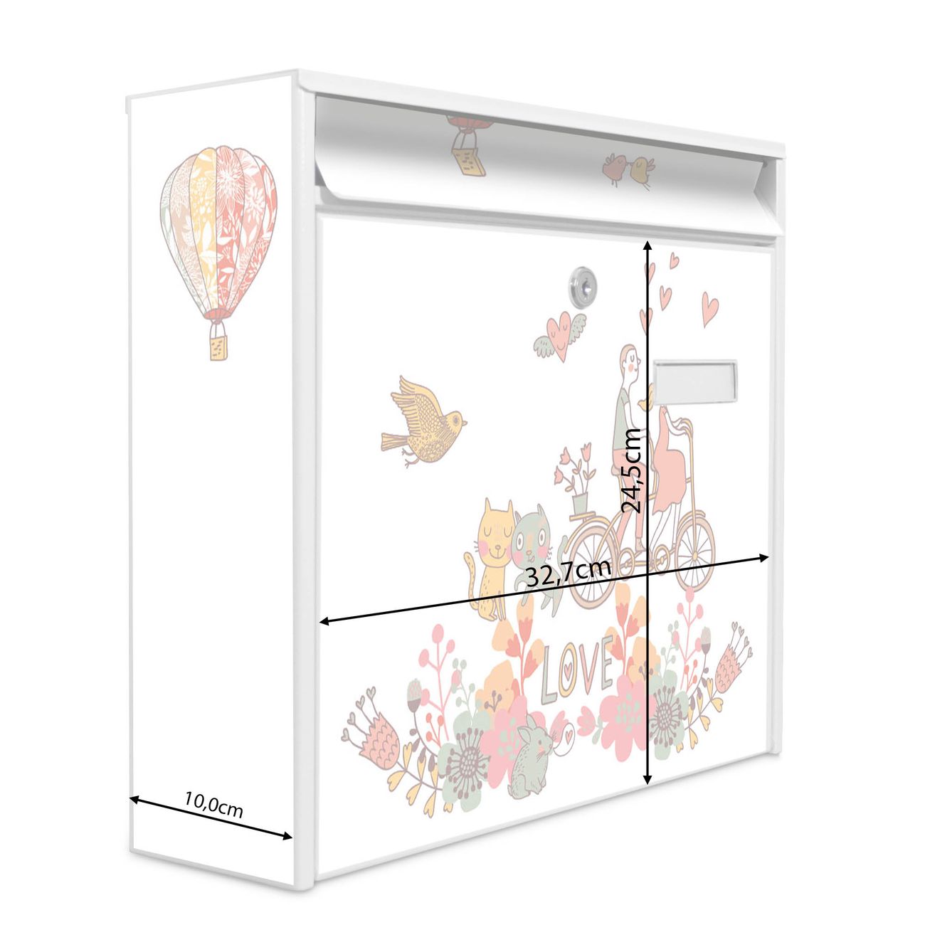 Die Größe des Briefkastens ist 36 x 32 x 10cm (BxHxT) groß. Das Motiv besteht aus einer wetter- und UV-festen Folie, die mit einem Schutzlaminat überzogen ist und Ihren Briefkasten zusätzlich vor Kratzern schützt. Sie erhalten 2 Schlüssel sowie das Montagematerial.