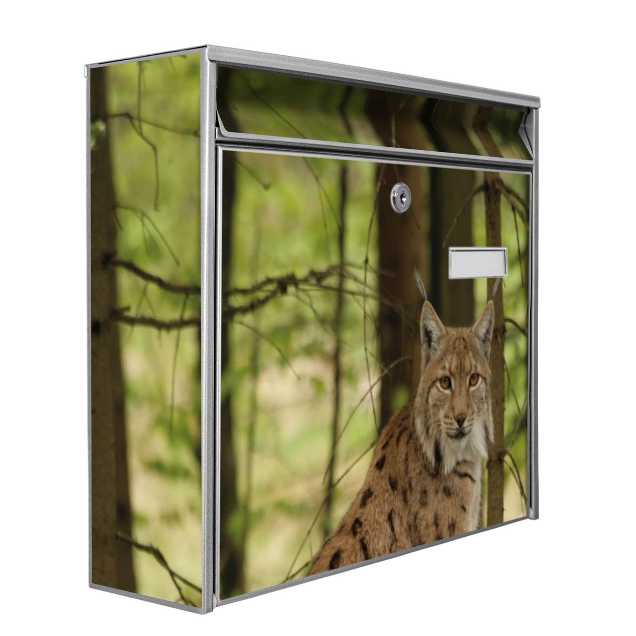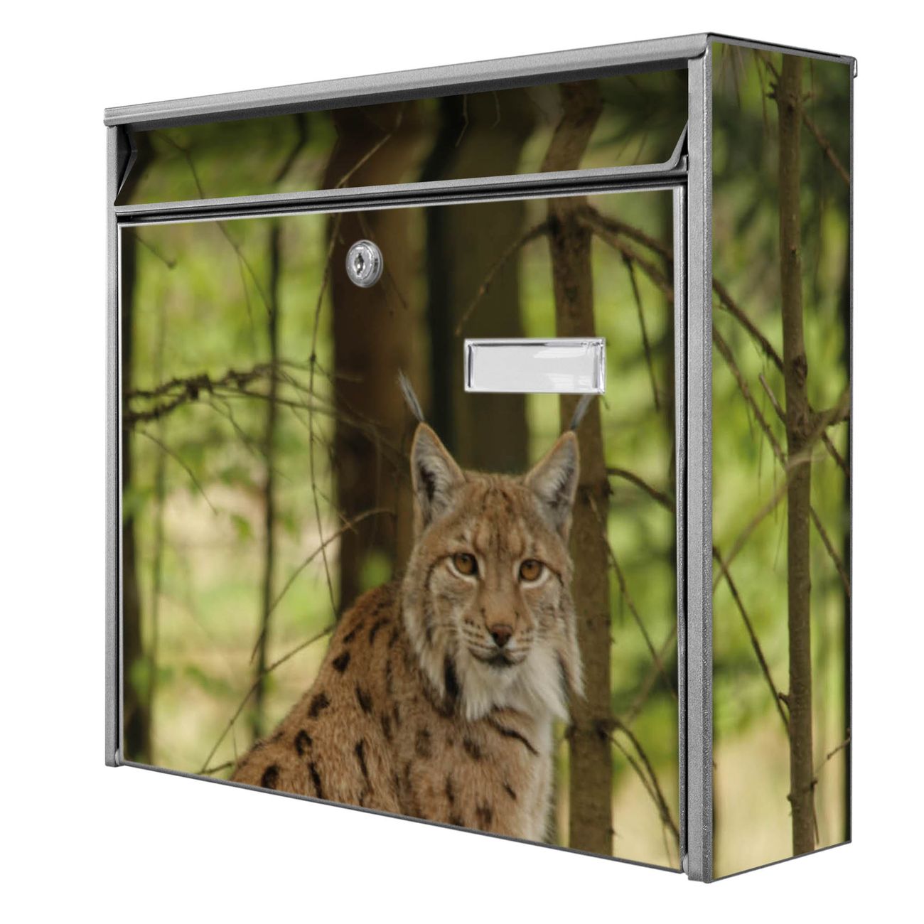 Der Burg Wächter Mail Briefkasten mit Motiv Luchs bietet Ihnen mit seinem Fassungsvermögen genügend Platz auch für große A4 Sendungen. Auf Wunsch können Sie bei uns den passenden Standfuß kaufen und so aus dem Wandbriefkasten einen Standbriefkasten machen. Wir bieten Ihnen ebenfalls Namensschilder, bereits beschriftet oder frei zu beschriften, und verschiedene selbst gestaltete Bitte-Keine-Werbung-Aufkleber.