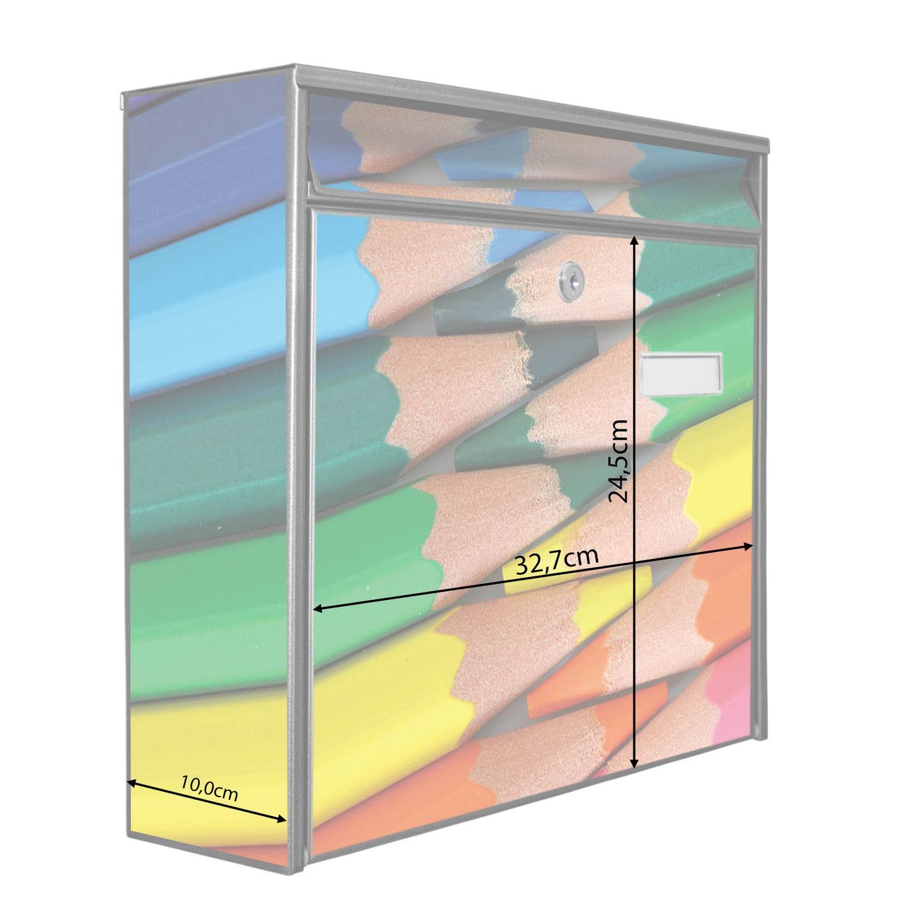 Der Burg Wächter Mail Briefkasten mit Motiv Malstifte bietet Ihnen mit seinem Fassungsvermögen genügend Platz auch für große A4 Sendungen. Auf Wunsch können Sie bei uns den passenden Standfuß kaufen und so aus dem Wandbriefkasten einen Standbriefkasten machen. Wir bieten Ihnen ebenfalls Namensschilder, bereits beschriftet oder frei zu beschriften, und verschiedene selbst gestaltete Bitte-Keine-Werbung-Aufkleber.