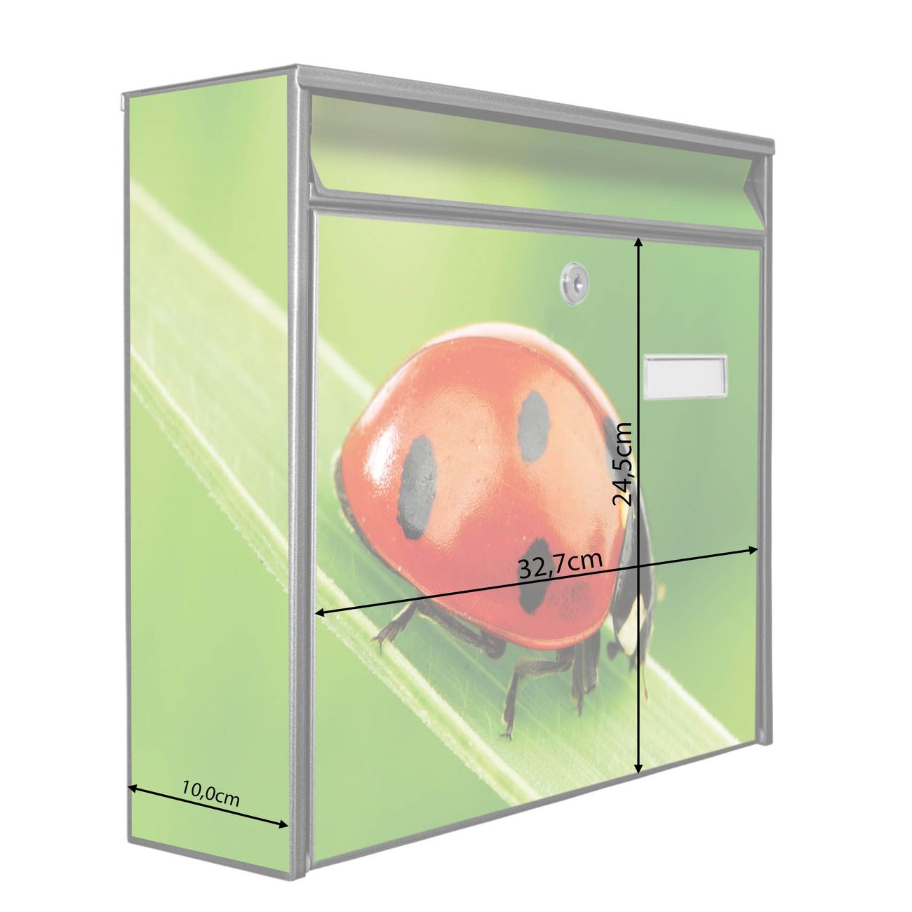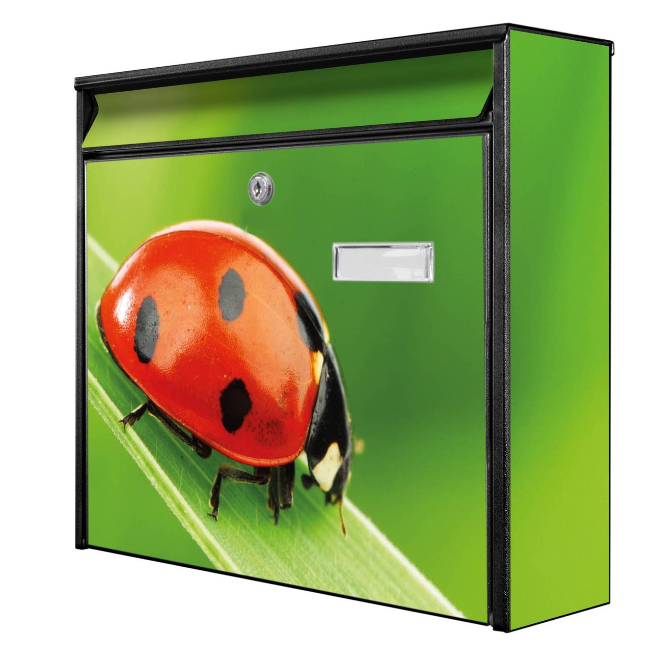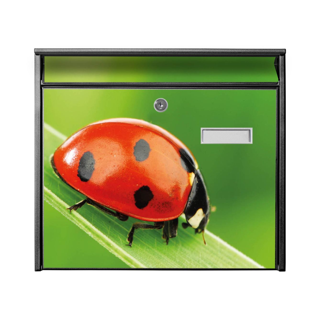 Der Burg Wächter Mail Briefkasten mit Motiv Marienkäfer bietet Ihnen mit seinem Fassungsvermögen genügend Platz auch für große A4 Sendungen. Auf Wunsch können Sie bei uns den passenden Standfuß kaufen und so aus dem Wandbriefkasten einen Standbriefkasten machen. Wir bieten Ihnen ebenfalls Namensschilder, bereits beschriftet oder frei zu beschriften, und verschiedene selbst gestaltete Bitte-Keine-Werbung-Aufkleber.