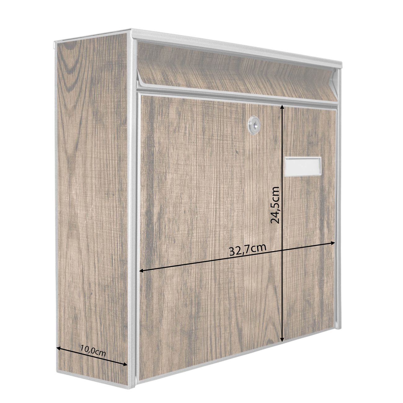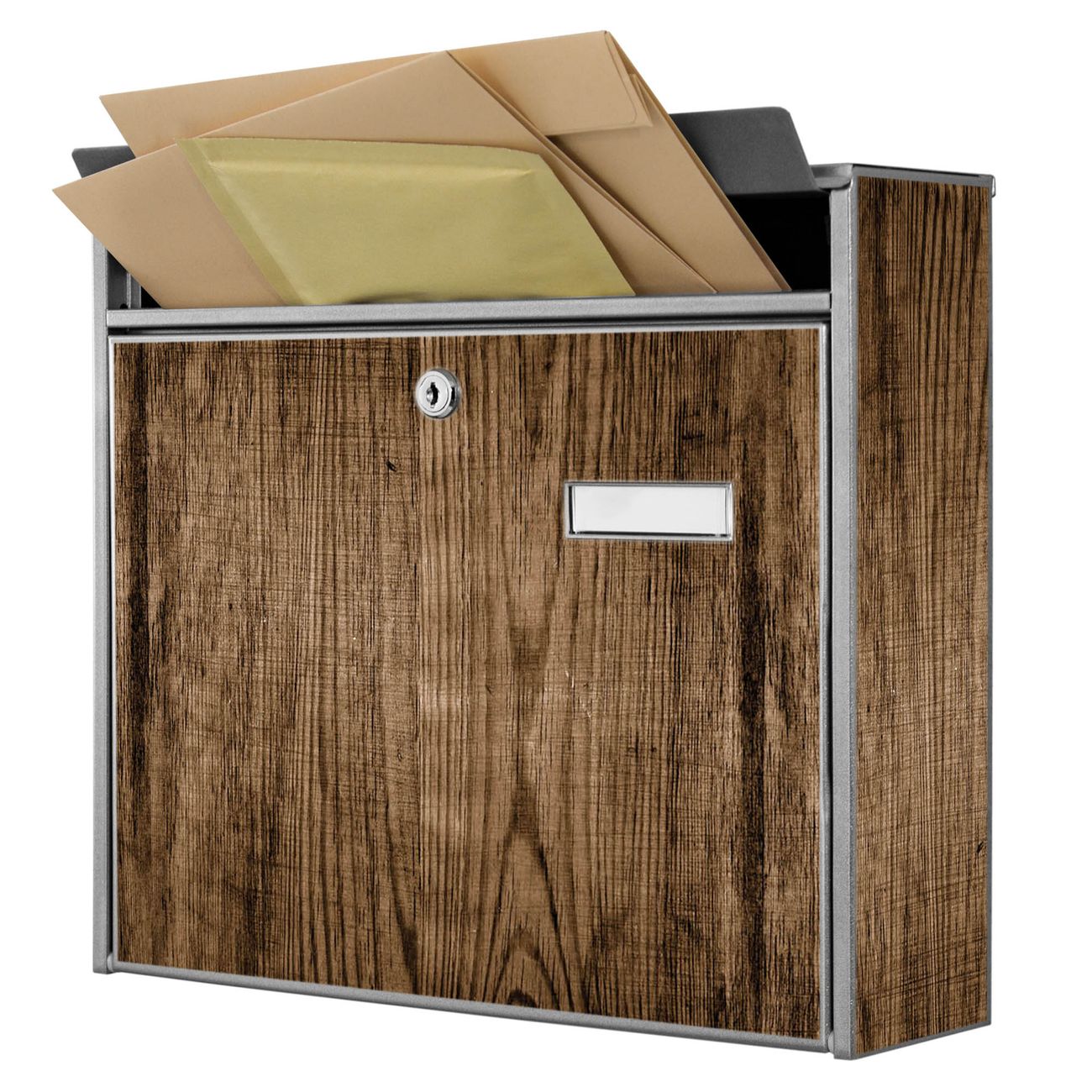 Der Burg Wächter Mail Briefkasten mit Motiv Maserung Dunkel bietet Ihnen mit seinem Fassungsvermögen genügend Platz auch für große A4 Sendungen. Auf Wunsch können Sie bei uns den passenden Standfuß kaufen und so aus dem Wandbriefkasten einen Standbriefkasten machen. Wir bieten Ihnen ebenfalls Namensschilder, bereits beschriftet oder frei zu beschriften, und verschiedene selbst gestaltete Bitte-Keine-Werbung-Aufkleber.