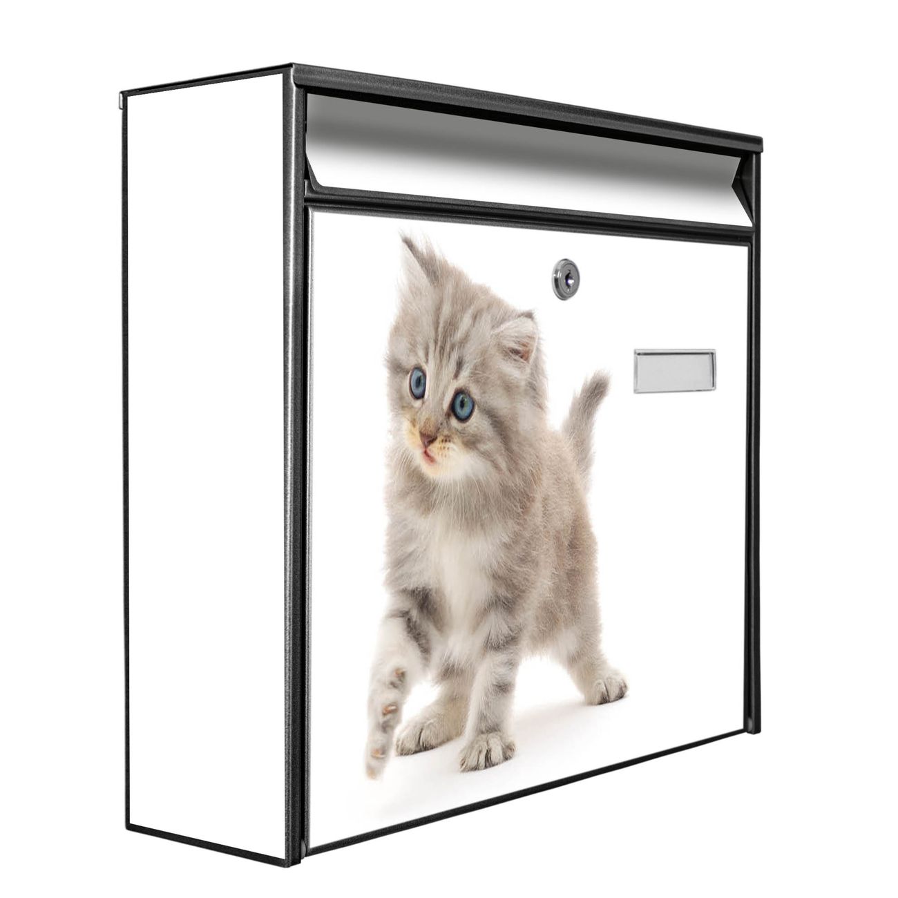 Der Burg Wächter Mail Briefkasten mit Motiv Miau bietet Ihnen mit seinem Fassungsvermögen genügend Platz auch für große A4 Sendungen. Auf Wunsch können Sie bei uns den passenden Standfuß kaufen und so aus dem Wandbriefkasten einen Standbriefkasten machen. Wir bieten Ihnen ebenfalls Namensschilder, bereits beschriftet oder frei zu beschriften, und verschiedene selbst gestaltete Bitte-Keine-Werbung-Aufkleber.