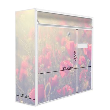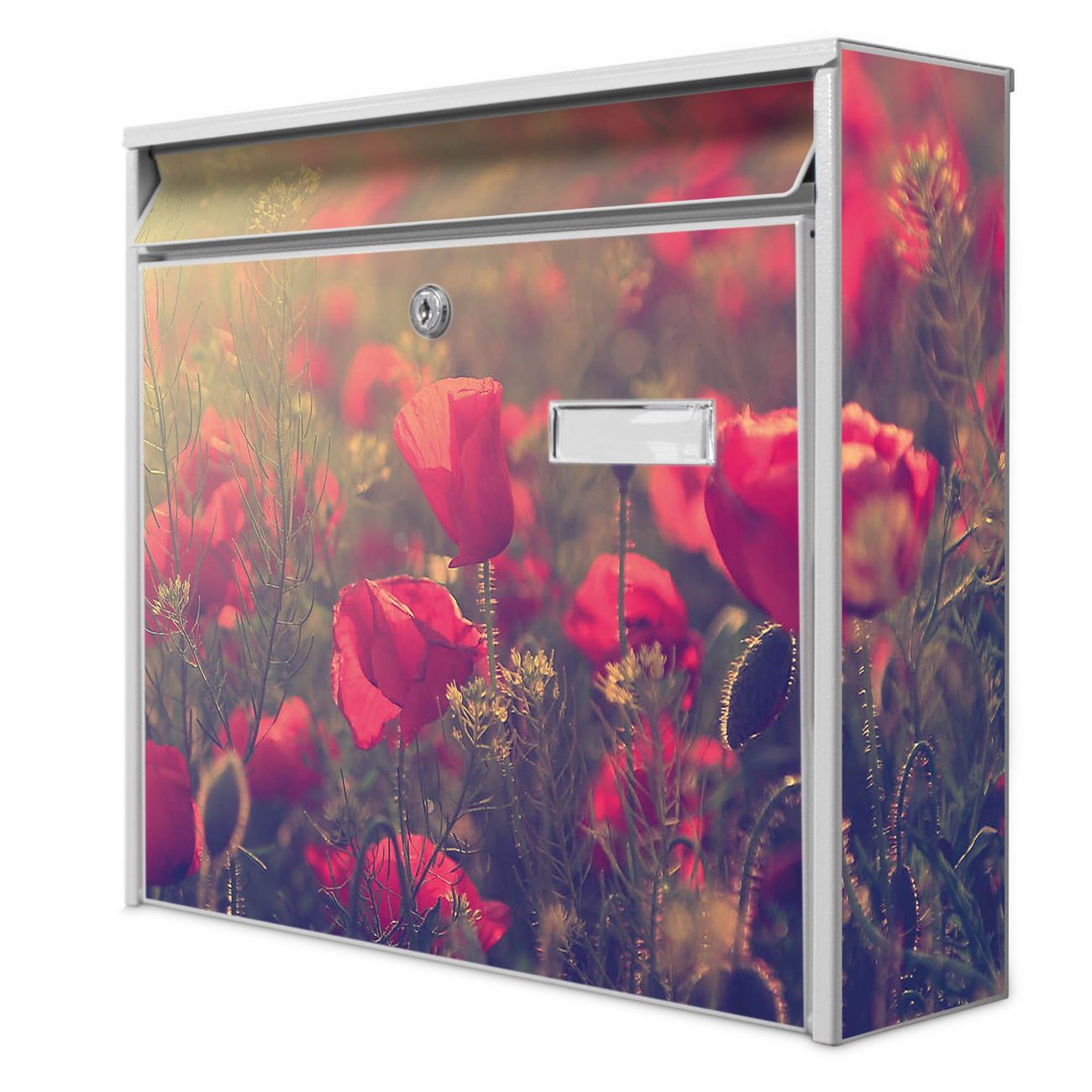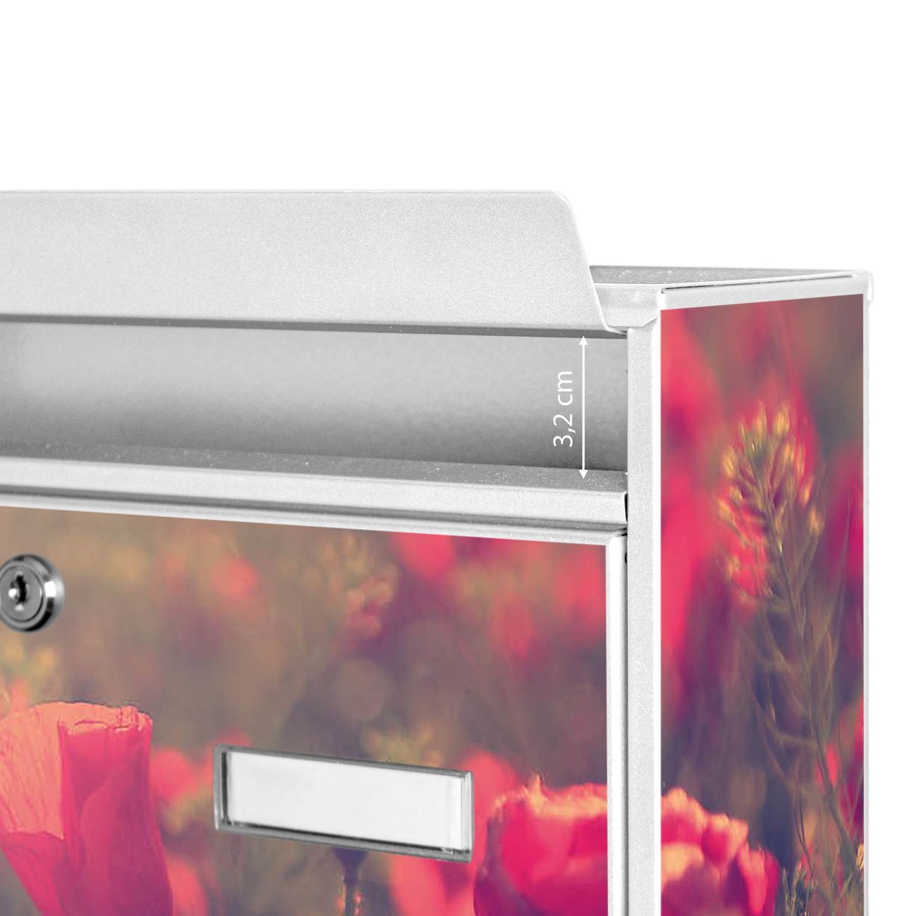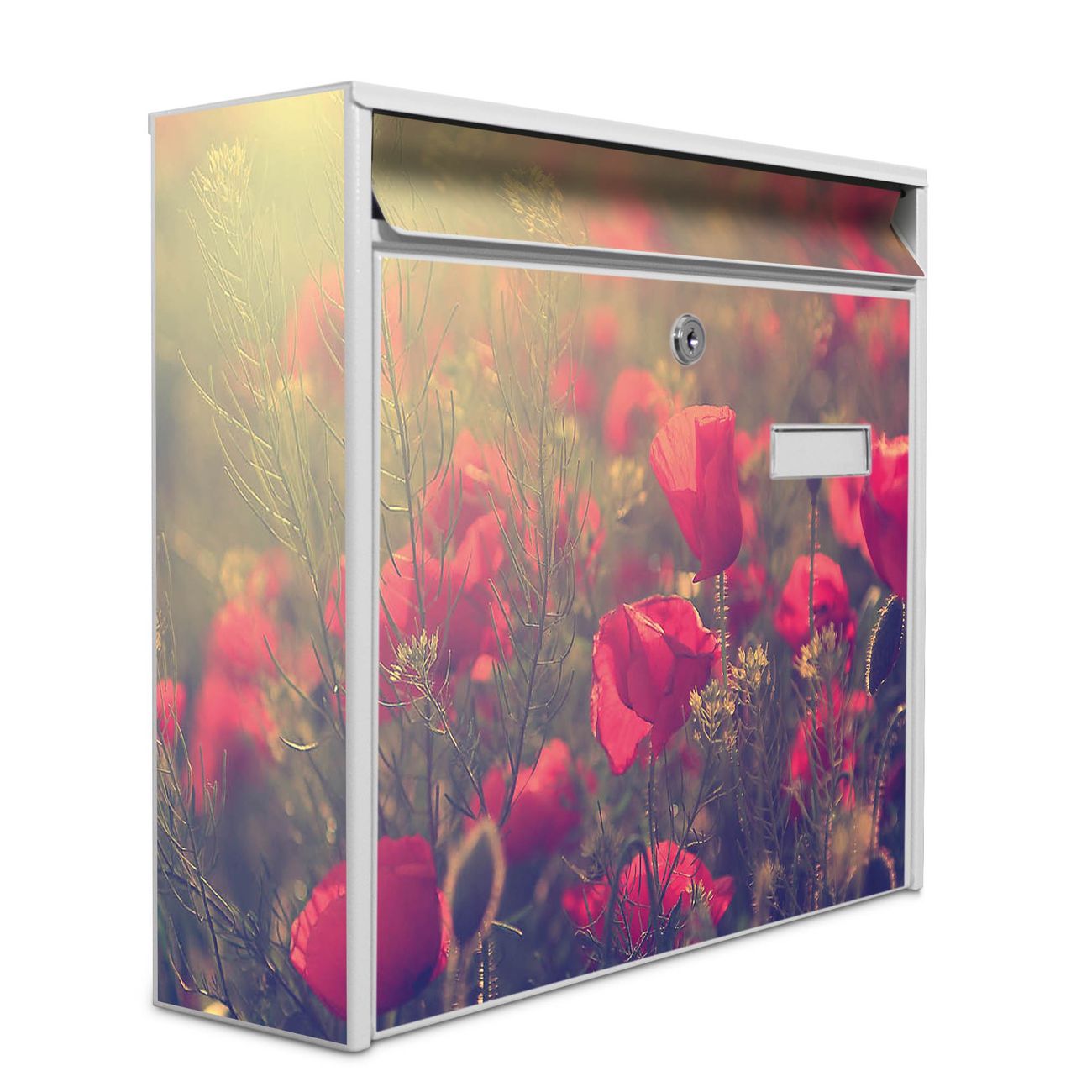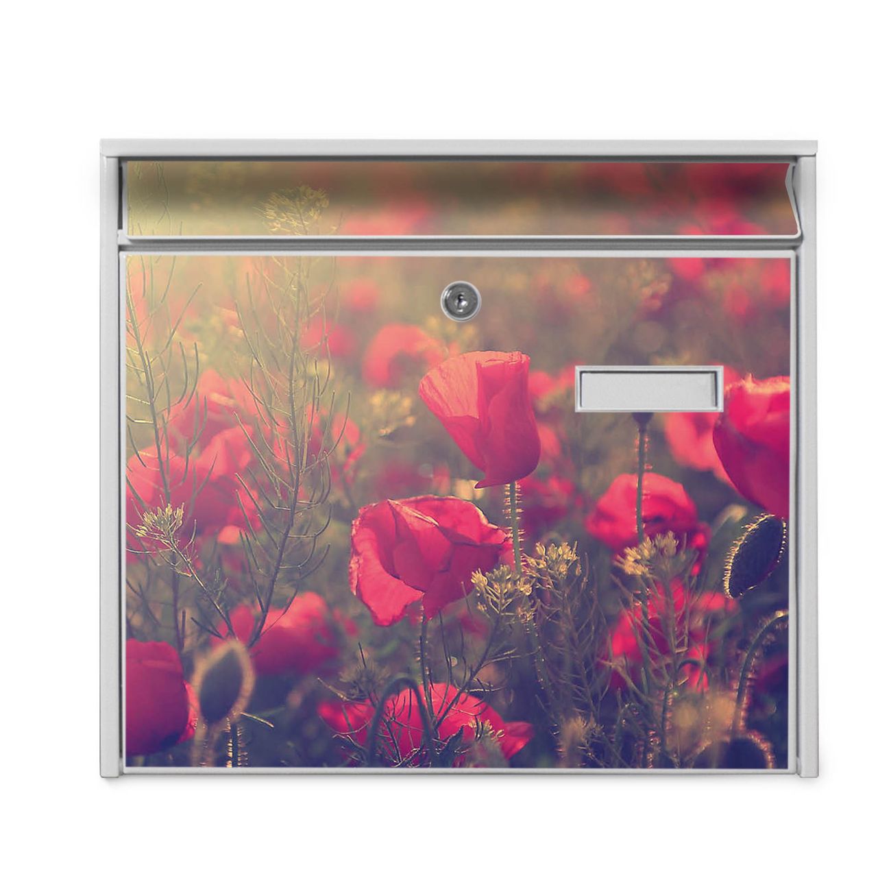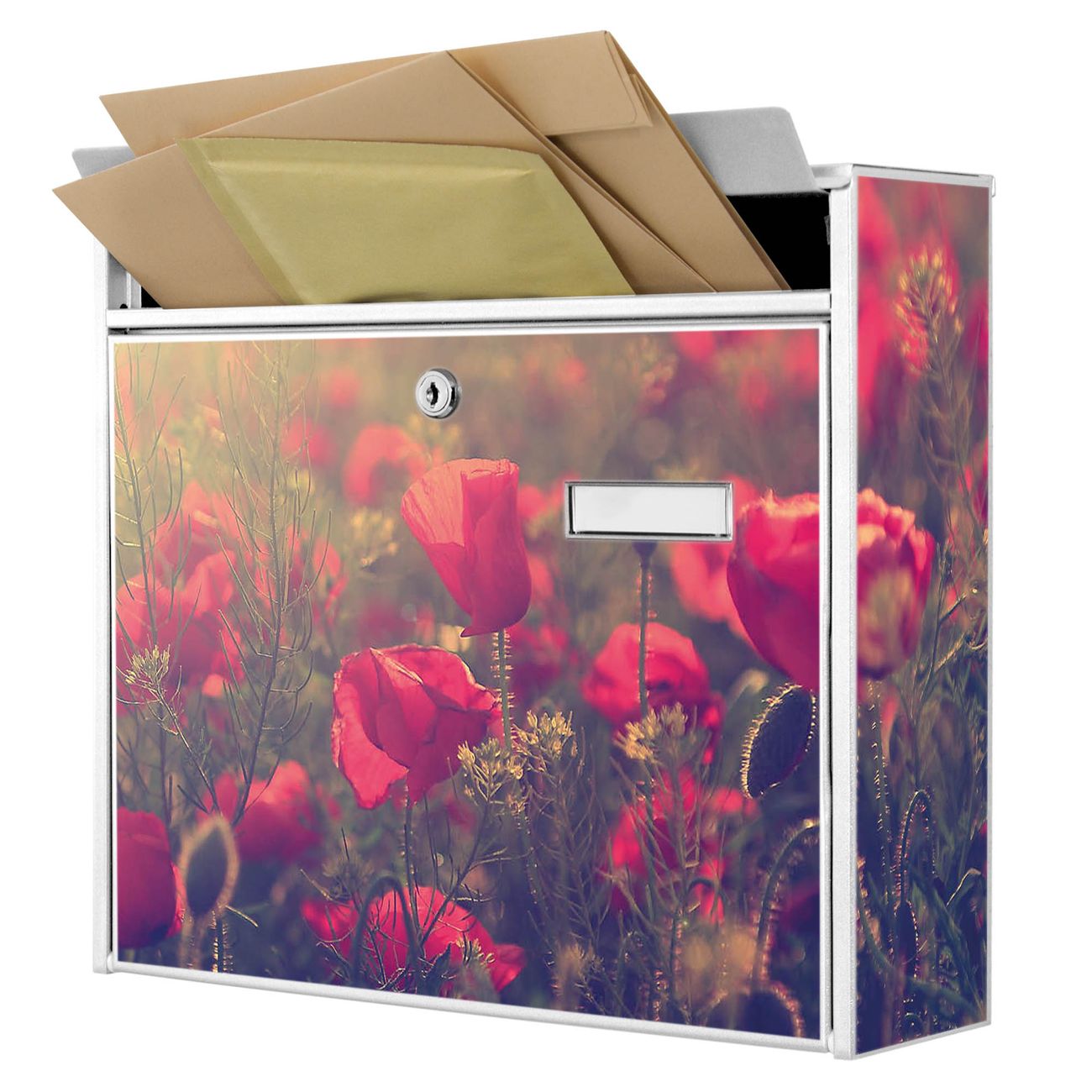 Der Burg Wächter Mail Briefkasten mit Motiv Mohn bietet Ihnen mit seinem Fassungsvermögen genügend Platz auch für große A4 Sendungen. Auf Wunsch können Sie bei uns den passenden Standfuß kaufen und so aus dem Wandbriefkasten einen Standbriefkasten machen. Wir bieten Ihnen ebenfalls Namensschilder, bereits beschriftet oder frei zu beschriften, und verschiedene selbst gestaltete Bitte-Keine-Werbung-Aufkleber.