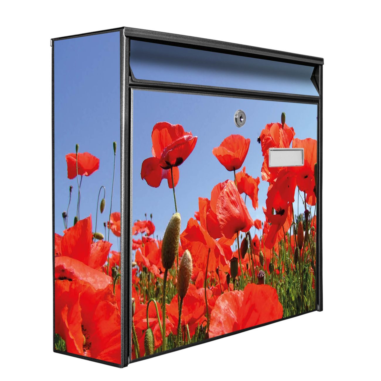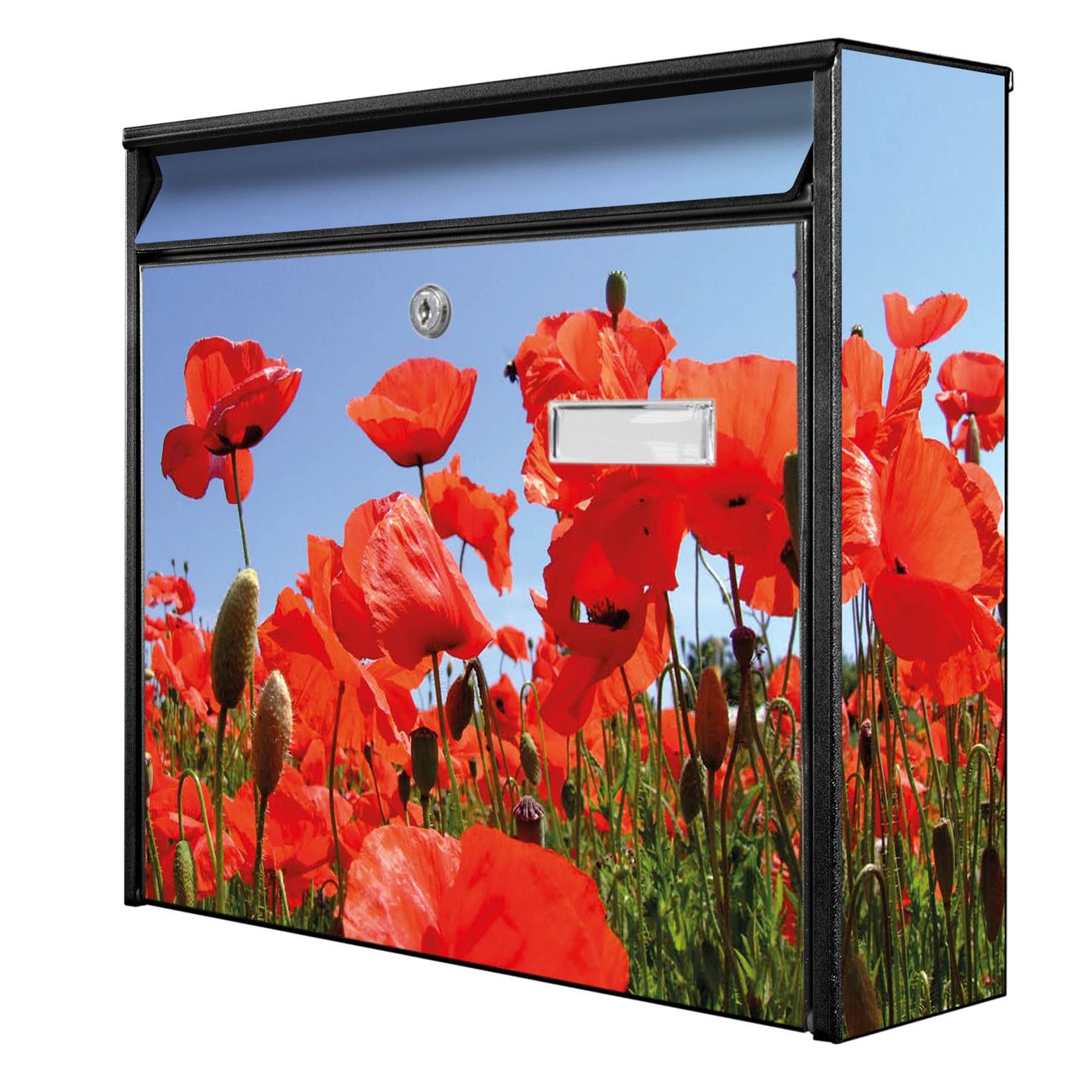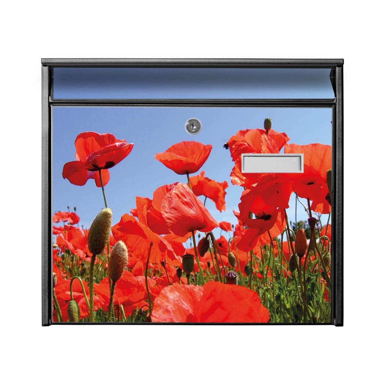Der Burg Wächter Mail Briefkasten mit Motiv Mohnblumen bietet Ihnen mit seinem Fassungsvermögen genügend Platz auch für große A4 Sendungen. Auf Wunsch können Sie bei uns den passenden Standfuß kaufen und so aus dem Wandbriefkasten einen Standbriefkasten machen. Wir bieten Ihnen ebenfalls Namensschilder, bereits beschriftet oder frei zu beschriften, und verschiedene selbst gestaltete Bitte-Keine-Werbung-Aufkleber.