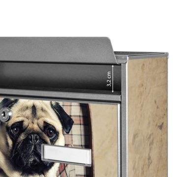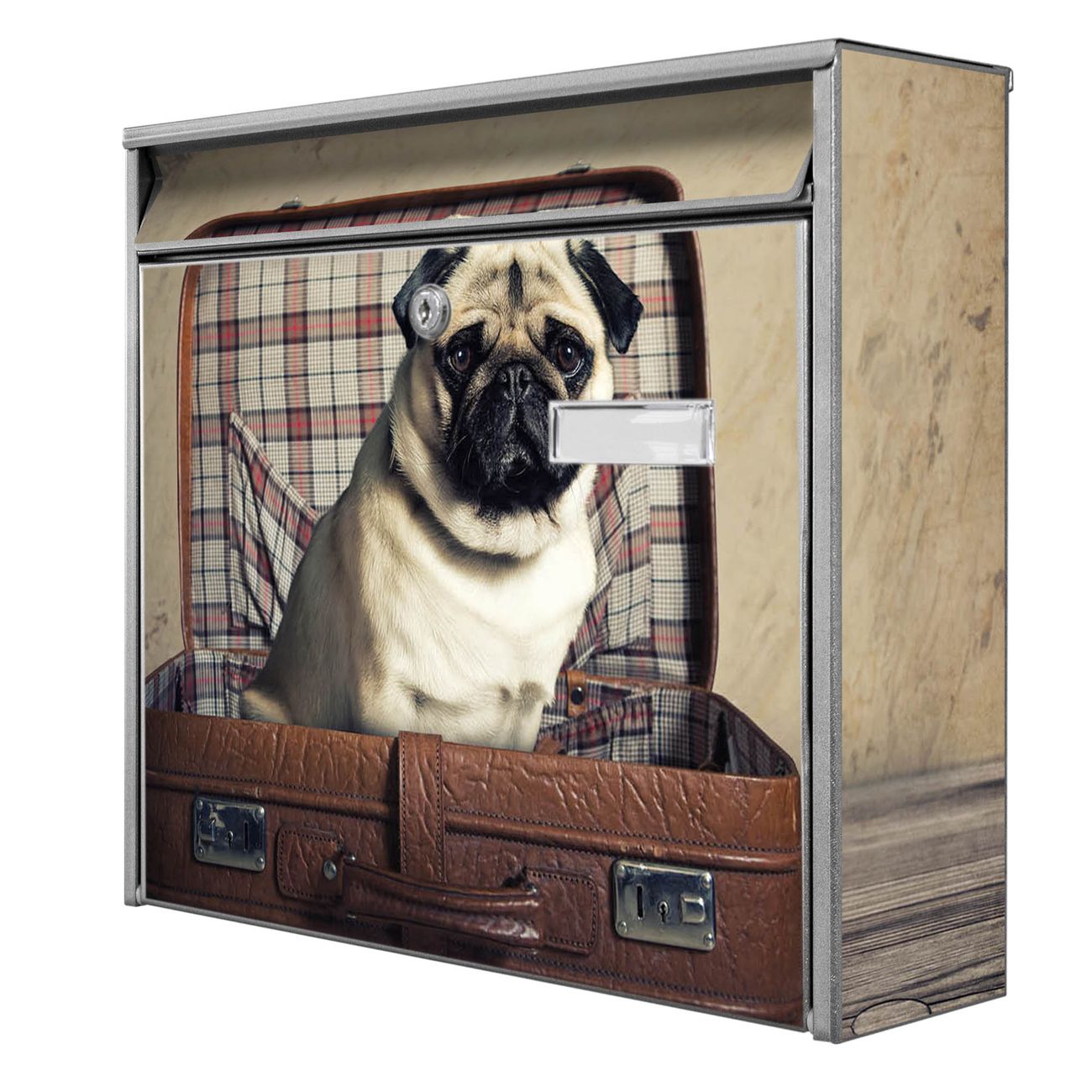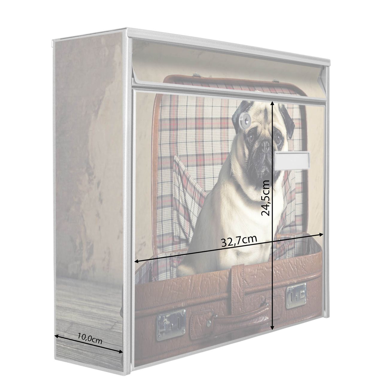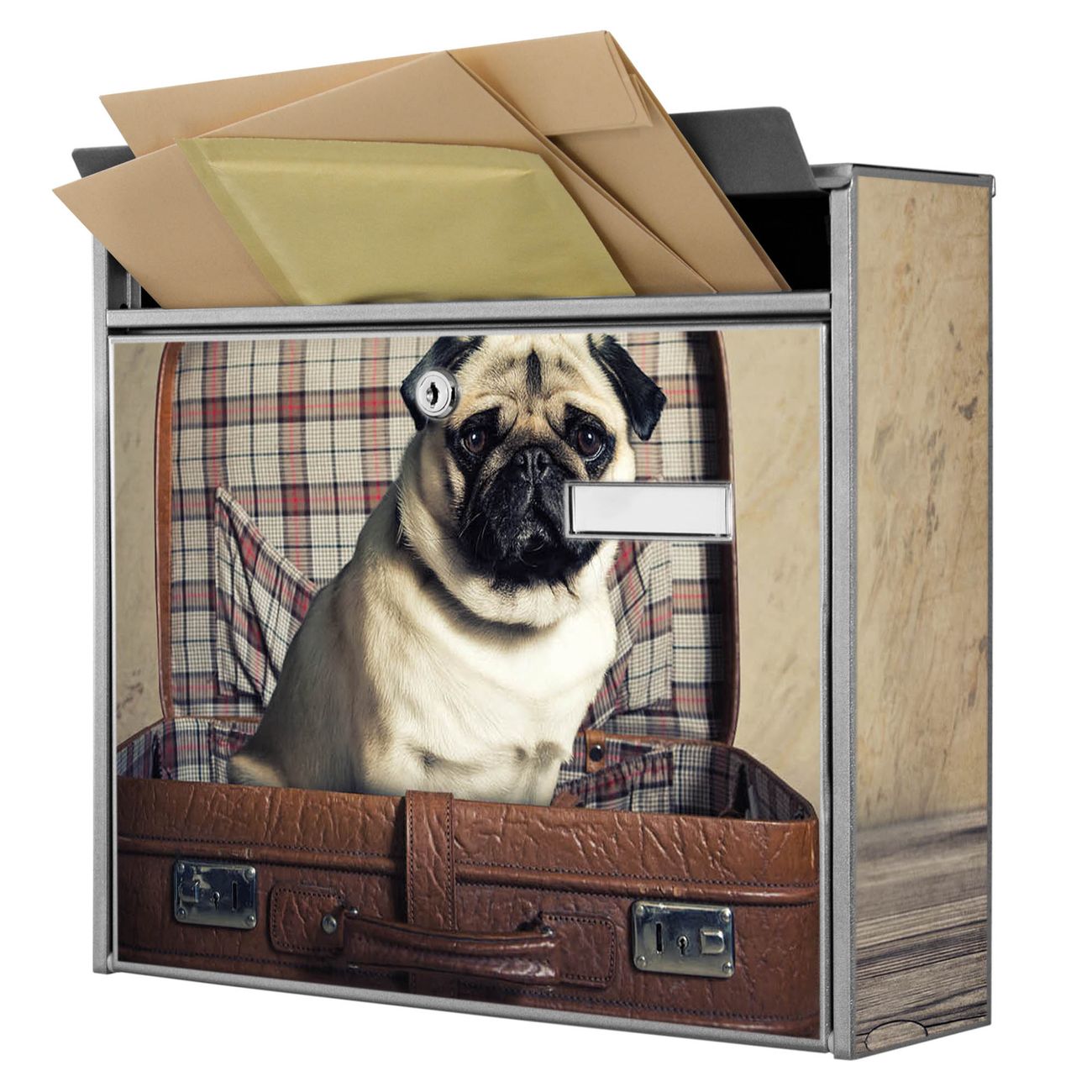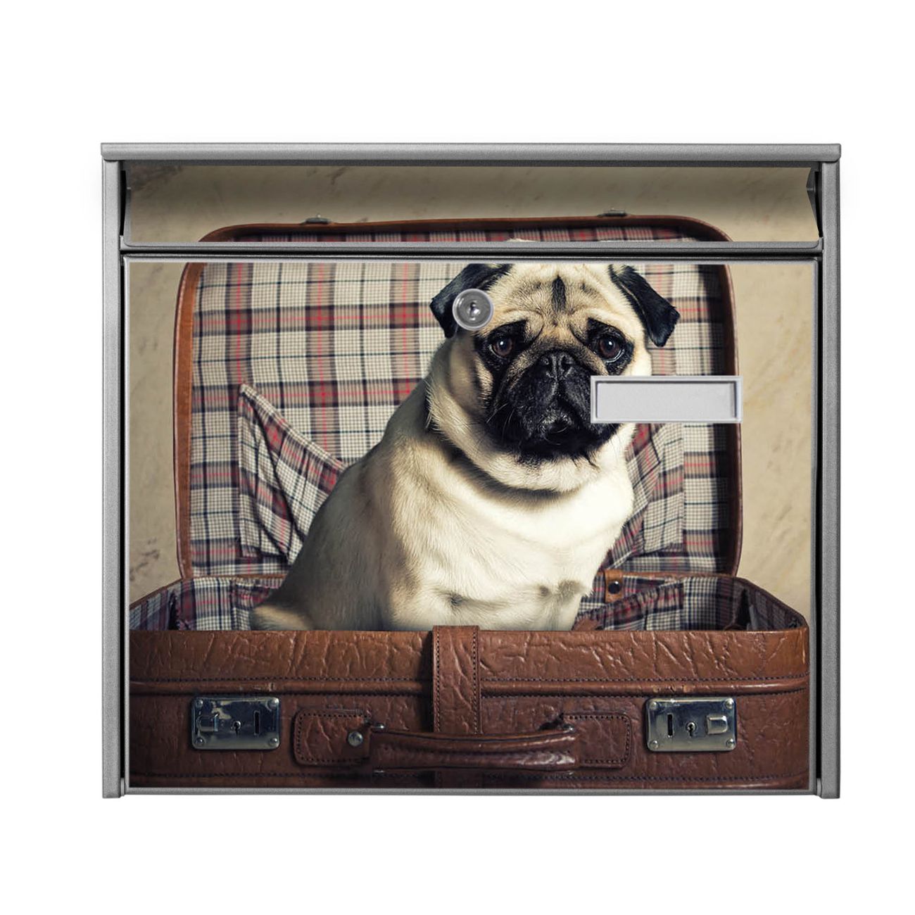 Der Burg Wächter Mail Briefkasten mit Motiv Mops im Koffer bietet Ihnen mit seinem Fassungsvermögen genügend Platz auch für große A4 Sendungen. Auf Wunsch können Sie bei uns den passenden Standfuß kaufen und so aus dem Wandbriefkasten einen Standbriefkasten machen. Wir bieten Ihnen ebenfalls Namensschilder, bereits beschriftet oder frei zu beschriften, und verschiedene selbst gestaltete Bitte-Keine-Werbung-Aufkleber.