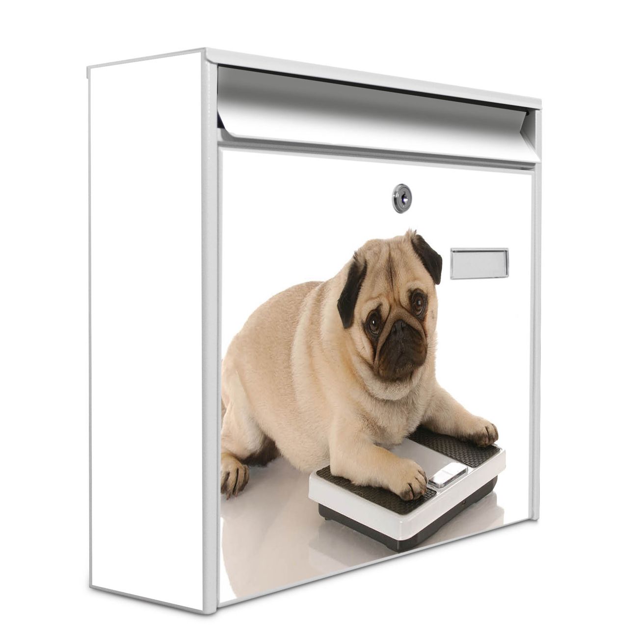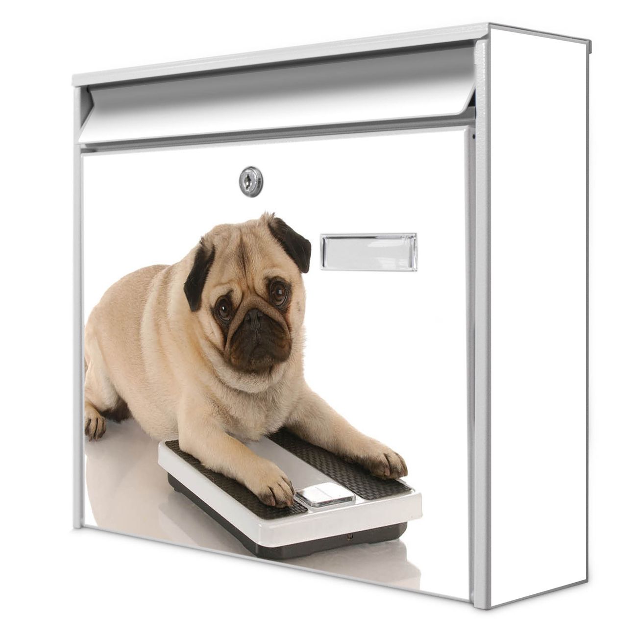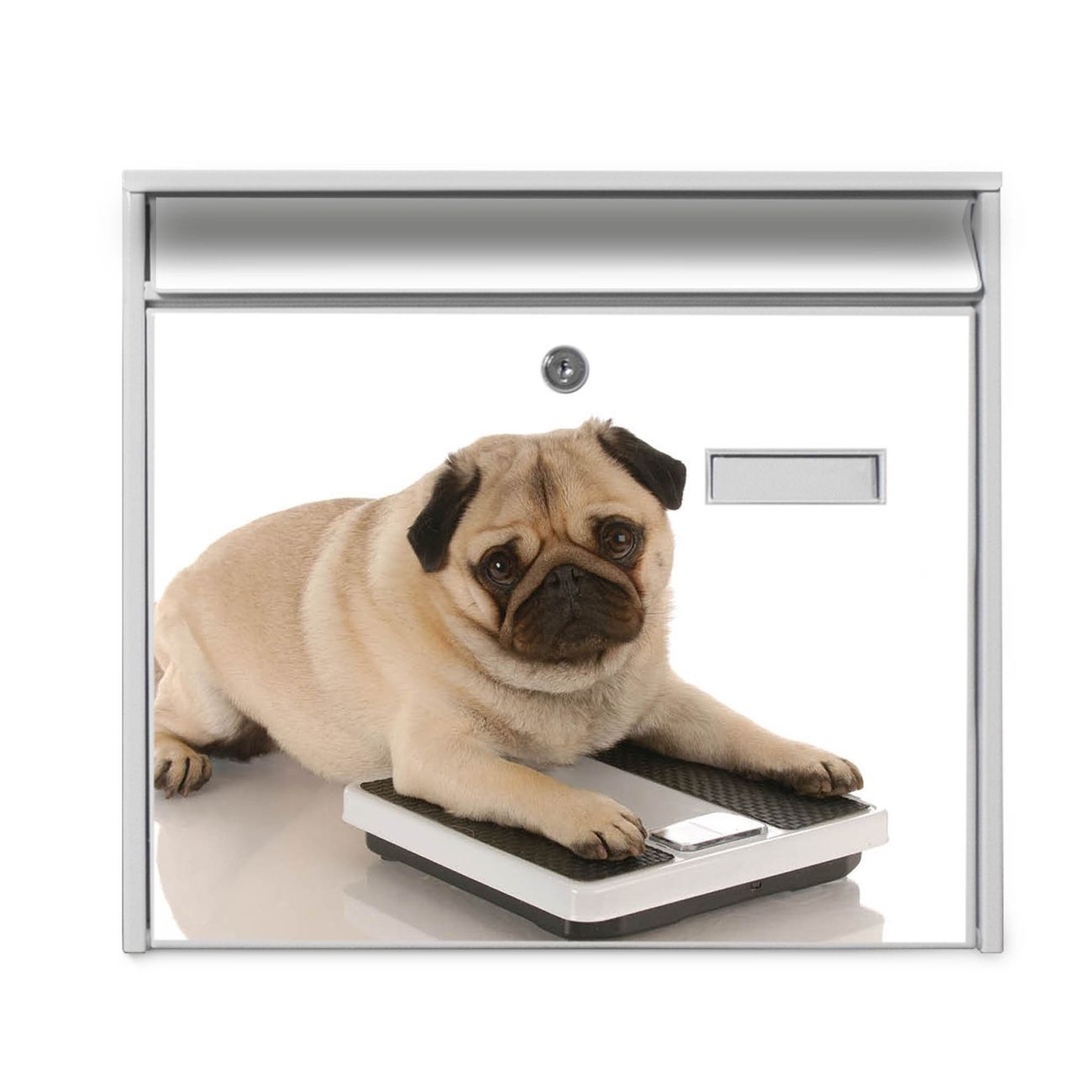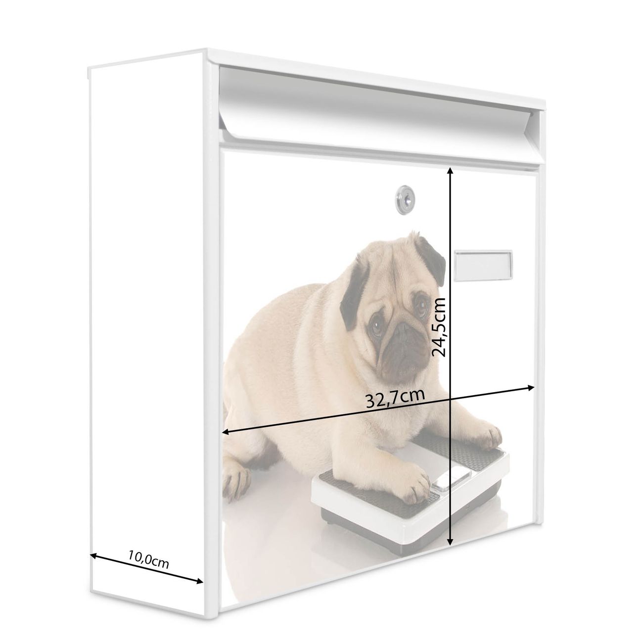 Der Burg Wächter Mail Briefkasten mit Motiv Mops bietet Ihnen mit seinem Fassungsvermögen genügend Platz auch für große A4 Sendungen. Auf Wunsch können Sie bei uns den passenden Standfuß kaufen und so aus dem Wandbriefkasten einen Standbriefkasten machen. Wir bieten Ihnen ebenfalls Namensschilder, bereits beschriftet oder frei zu beschriften, und verschiedene selbst gestaltete Bitte-Keine-Werbung-Aufkleber.
