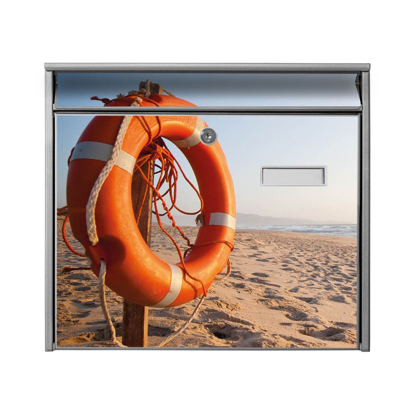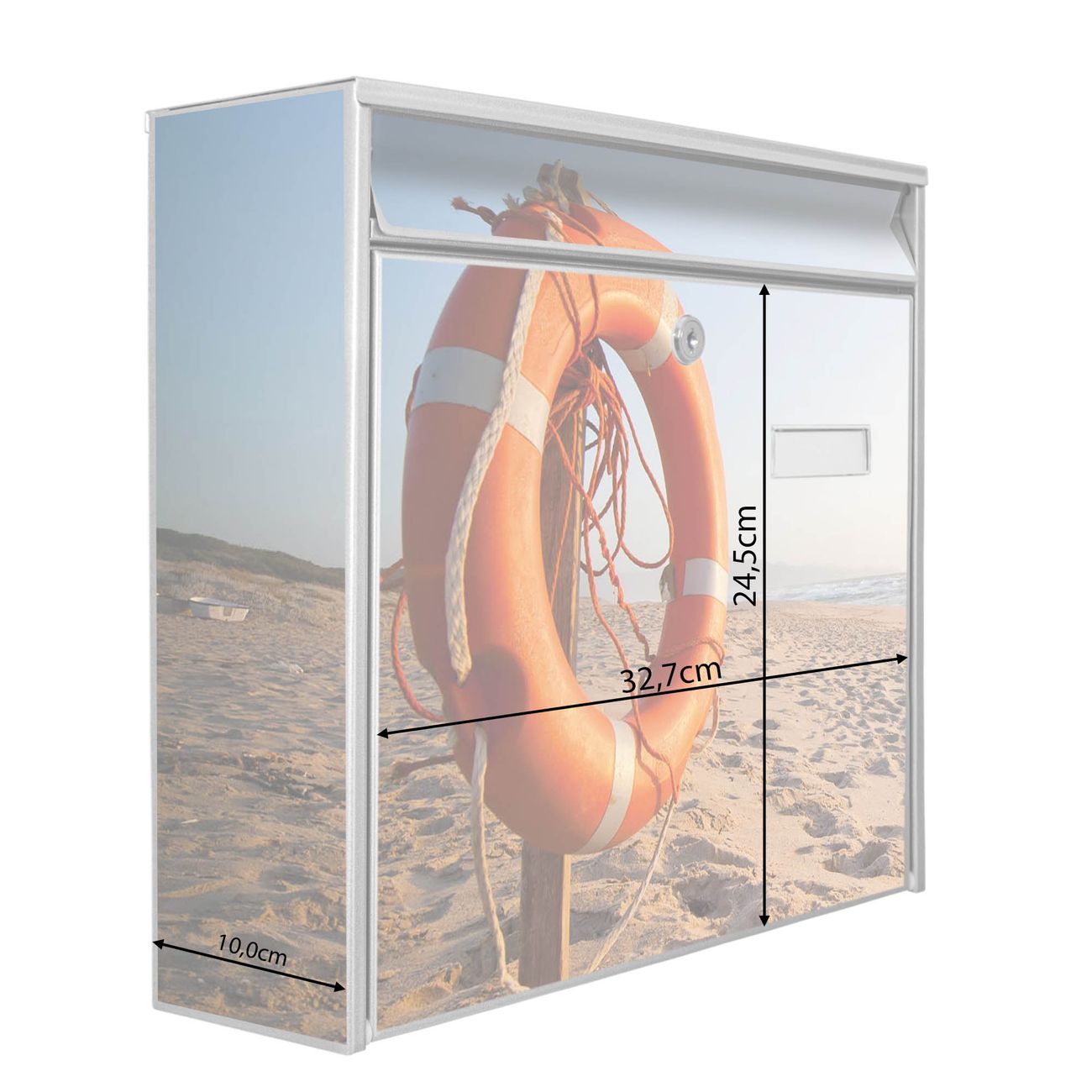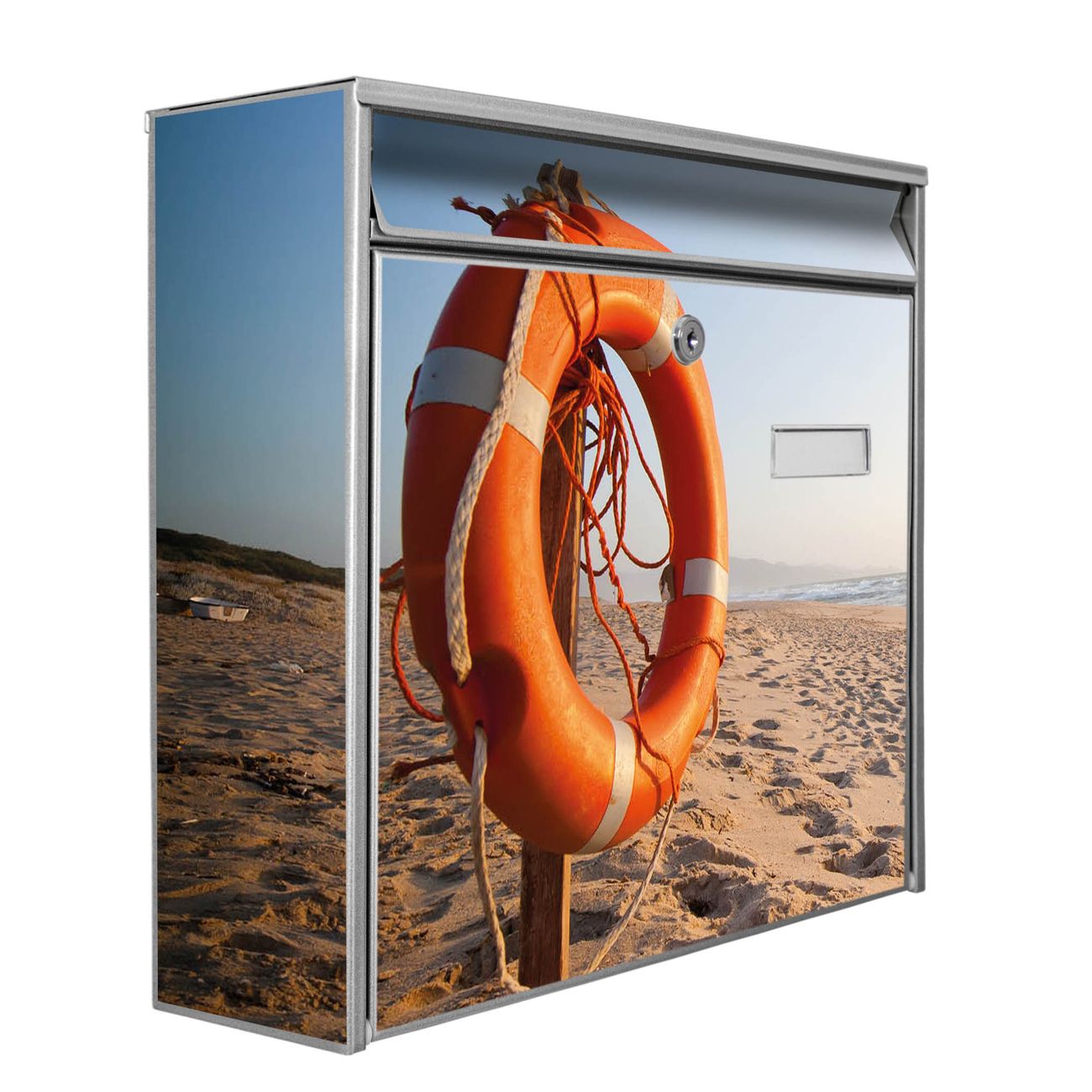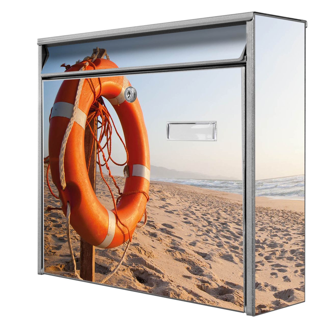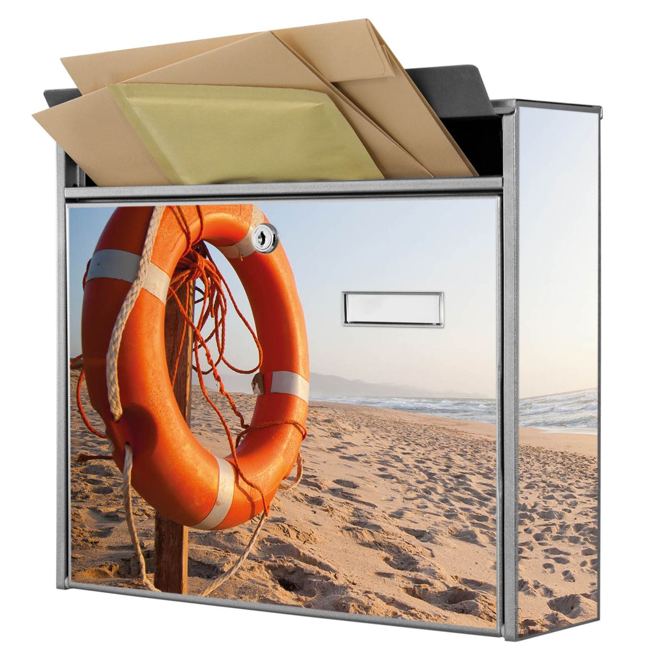 Der Burg Wächter Mail Briefkasten mit Motiv Morgens Am Strand bietet Ihnen mit seinem Fassungsvermögen genügend Platz auch für große A4 Sendungen. Auf Wunsch können Sie bei uns den passenden Standfuß kaufen und so aus dem Wandbriefkasten einen Standbriefkasten machen. Wir bieten Ihnen ebenfalls Namensschilder, bereits beschriftet oder frei zu beschriften, und verschiedene selbst gestaltete Bitte-Keine-Werbung-Aufkleber.