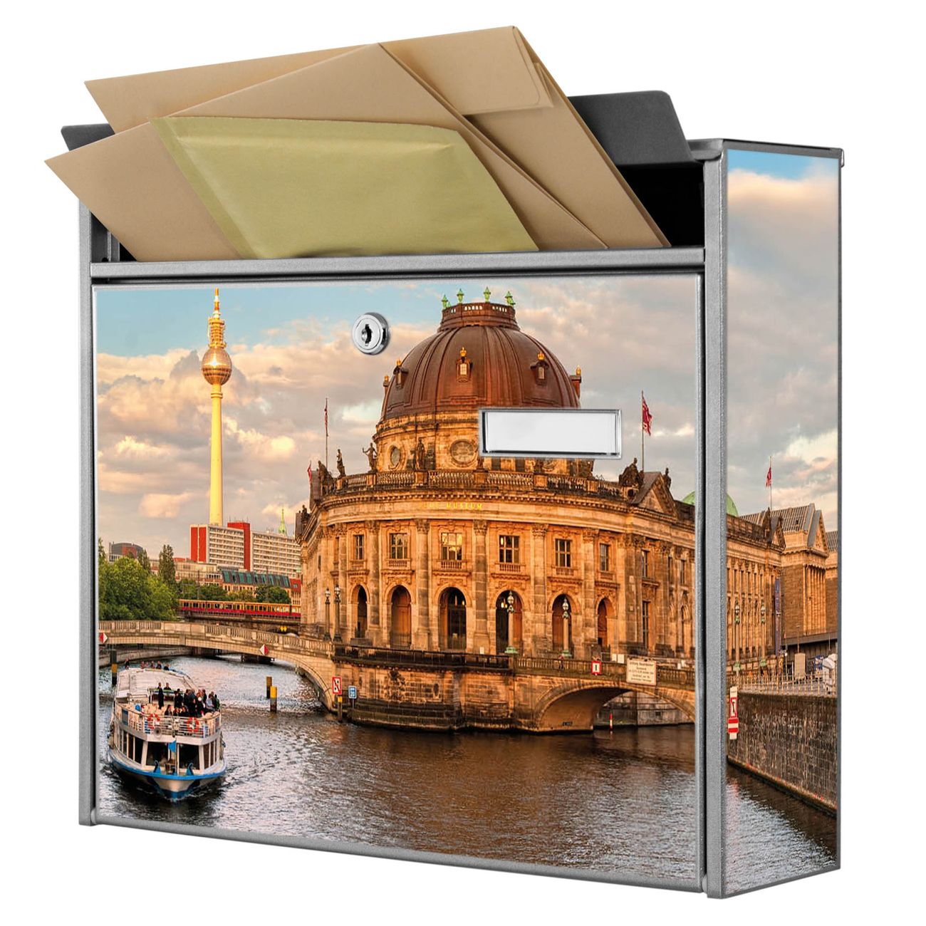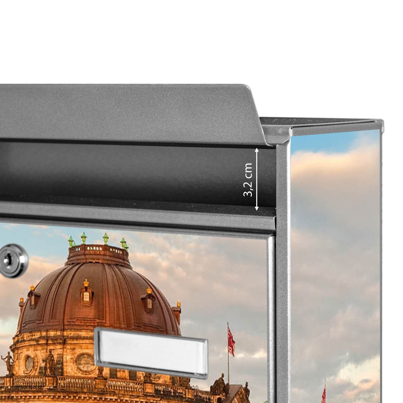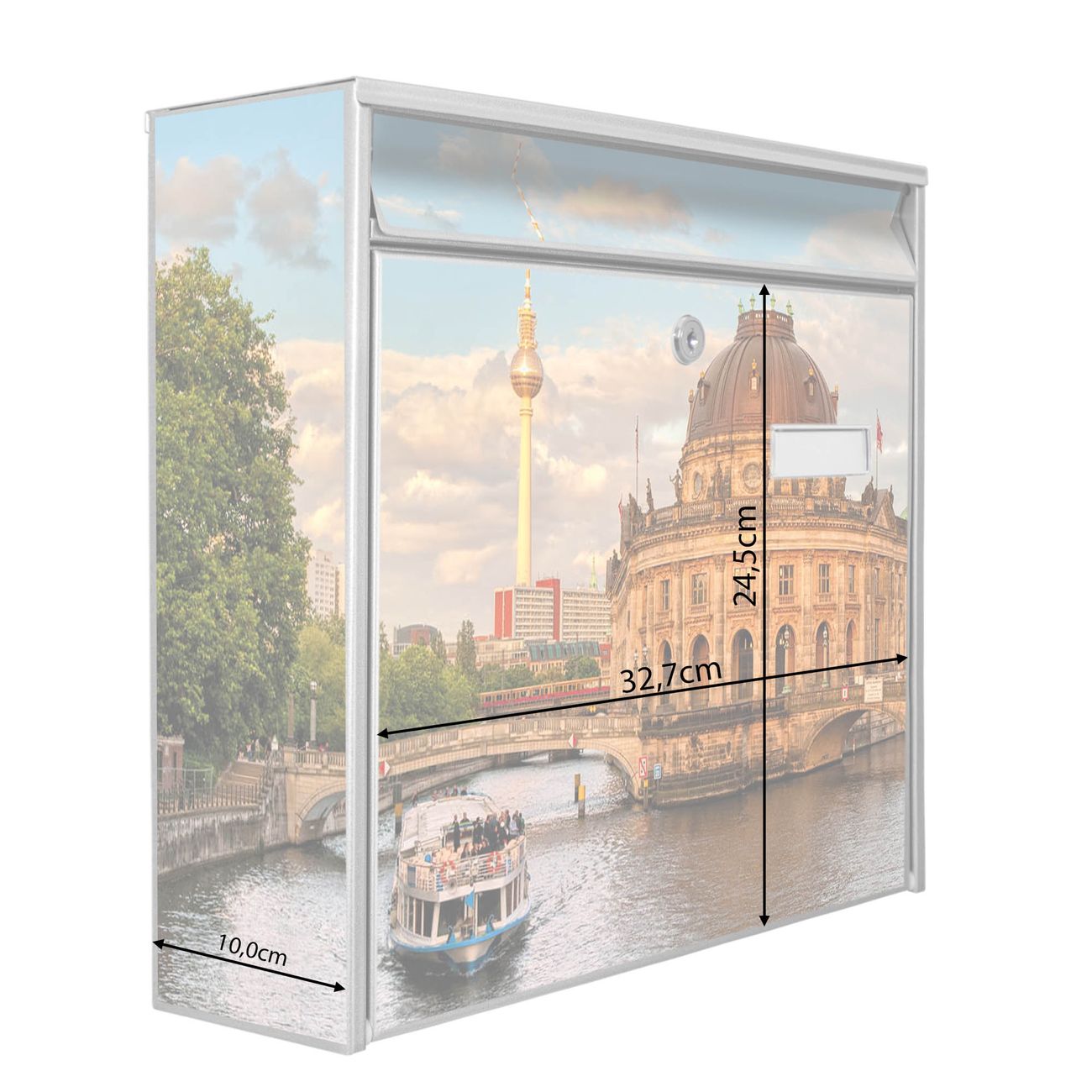 Der Burg Wächter Mail Briefkasten mit Motiv Museumsinsel bietet Ihnen mit seinem Fassungsvermögen genügend Platz auch für große A4 Sendungen. Auf Wunsch können Sie bei uns den passenden Standfuß kaufen und so aus dem Wandbriefkasten einen Standbriefkasten machen. Wir bieten Ihnen ebenfalls Namensschilder, bereits beschriftet oder frei zu beschriften, und verschiedene selbst gestaltete Bitte-Keine-Werbung-Aufkleber.