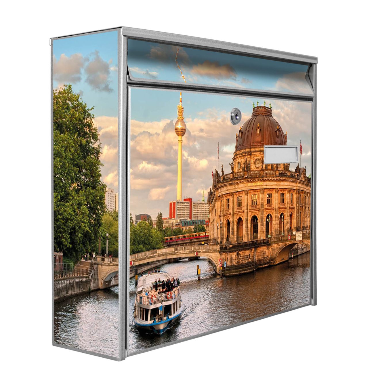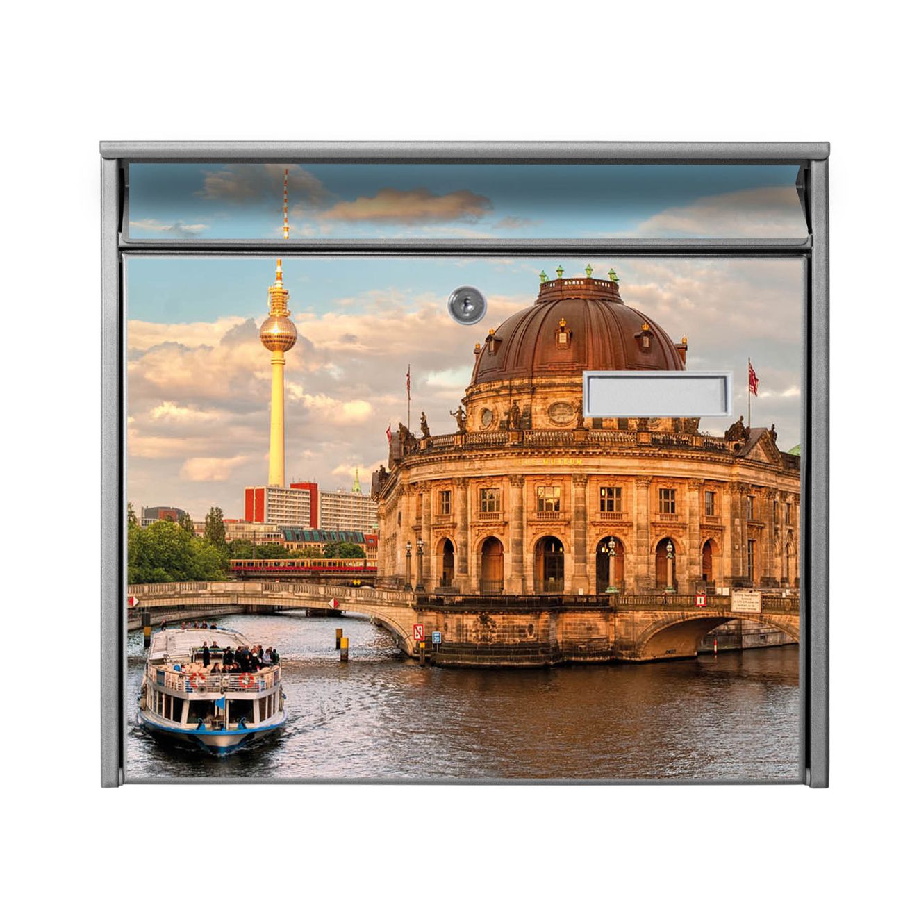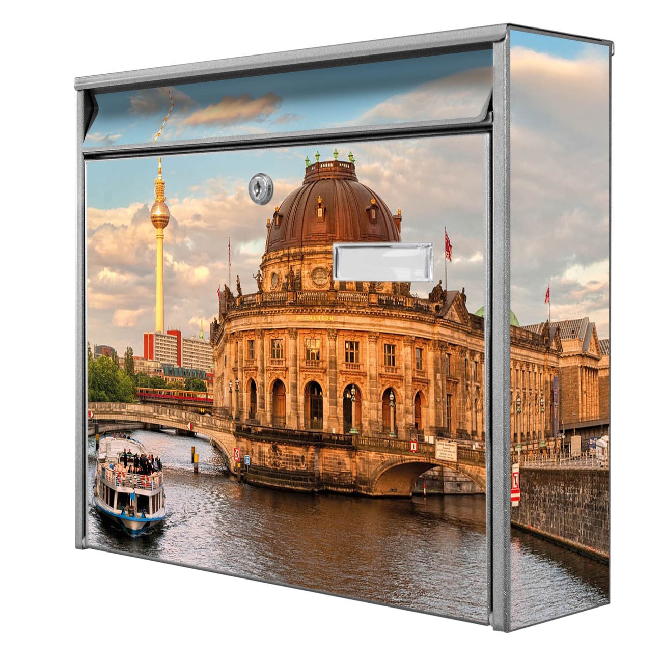 Der Burg Wächter Mail Briefkasten mit Motiv Museumsinsel bietet Ihnen mit seinem Fassungsvermögen genügend Platz auch für große A4 Sendungen. Auf Wunsch können Sie bei uns den passenden Standfuß kaufen und so aus dem Wandbriefkasten einen Standbriefkasten machen. Wir bieten Ihnen ebenfalls Namensschilder, bereits beschriftet oder frei zu beschriften, und verschiedene selbst gestaltete Bitte-Keine-Werbung-Aufkleber.