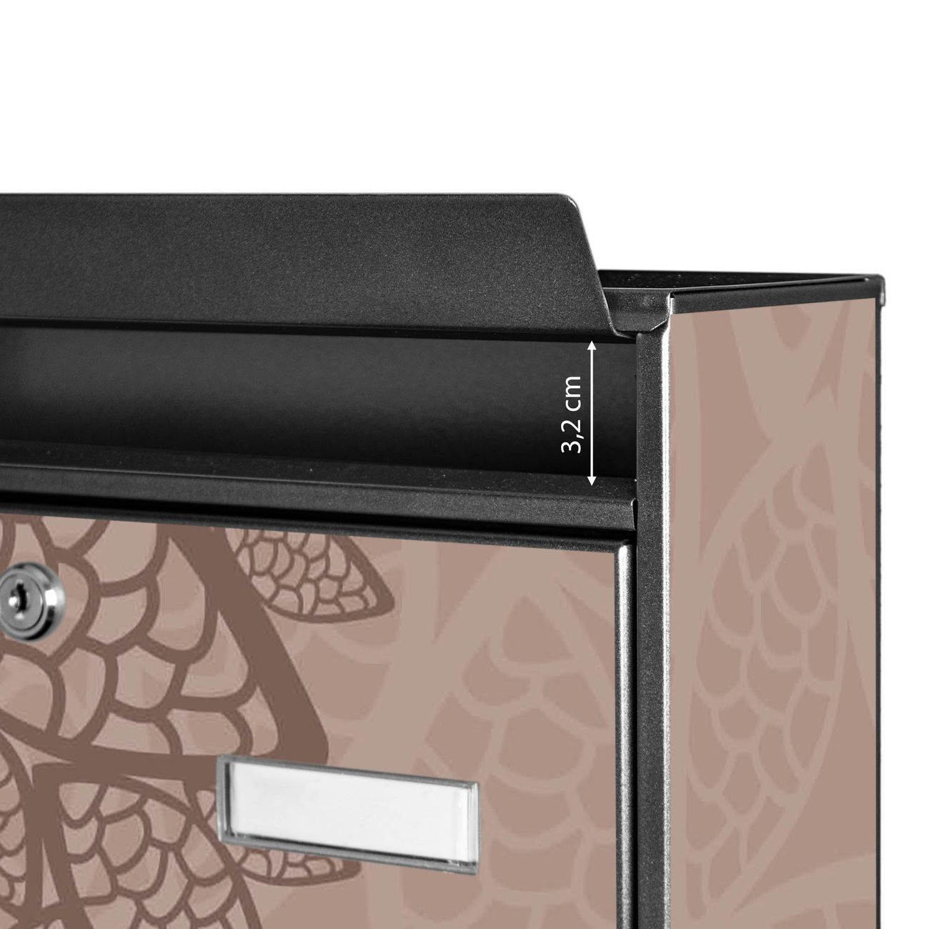 Der Burg Wächter Mail Briefkasten mit Motiv Muster Blätter bietet Ihnen mit seinem Fassungsvermögen genügend Platz auch für große A4 Sendungen. Auf Wunsch können Sie bei uns den passenden Standfuß kaufen und so aus dem Wandbriefkasten einen Standbriefkasten machen. Wir bieten Ihnen ebenfalls Namensschilder, bereits beschriftet oder frei zu beschriften, und verschiedene selbst gestaltete Bitte-Keine-Werbung-Aufkleber.