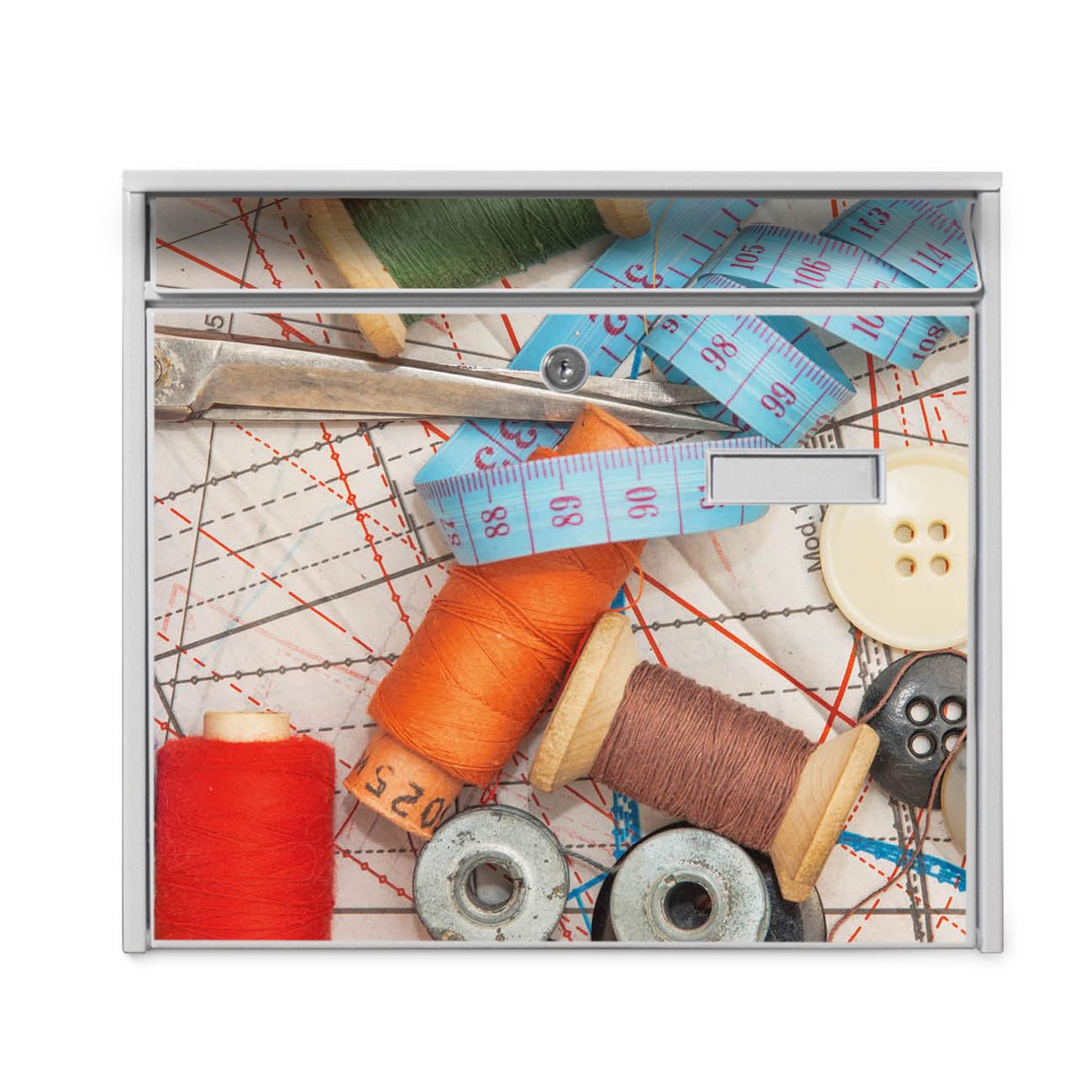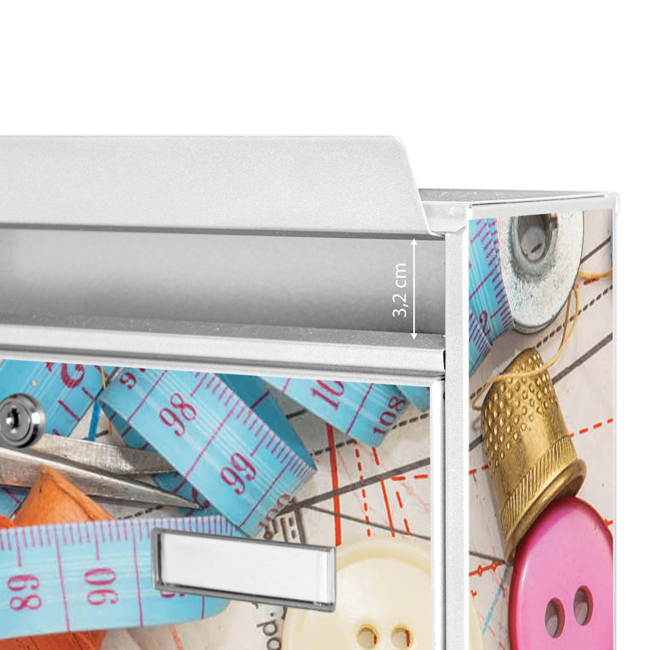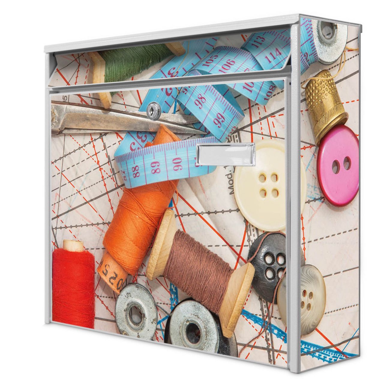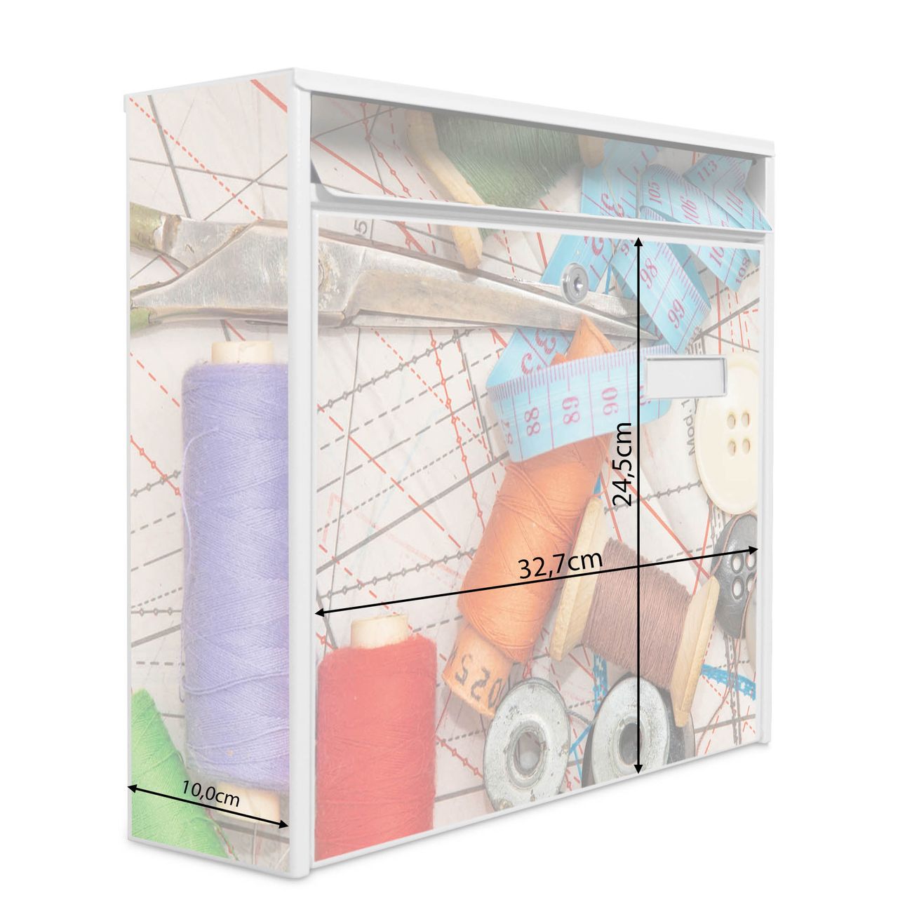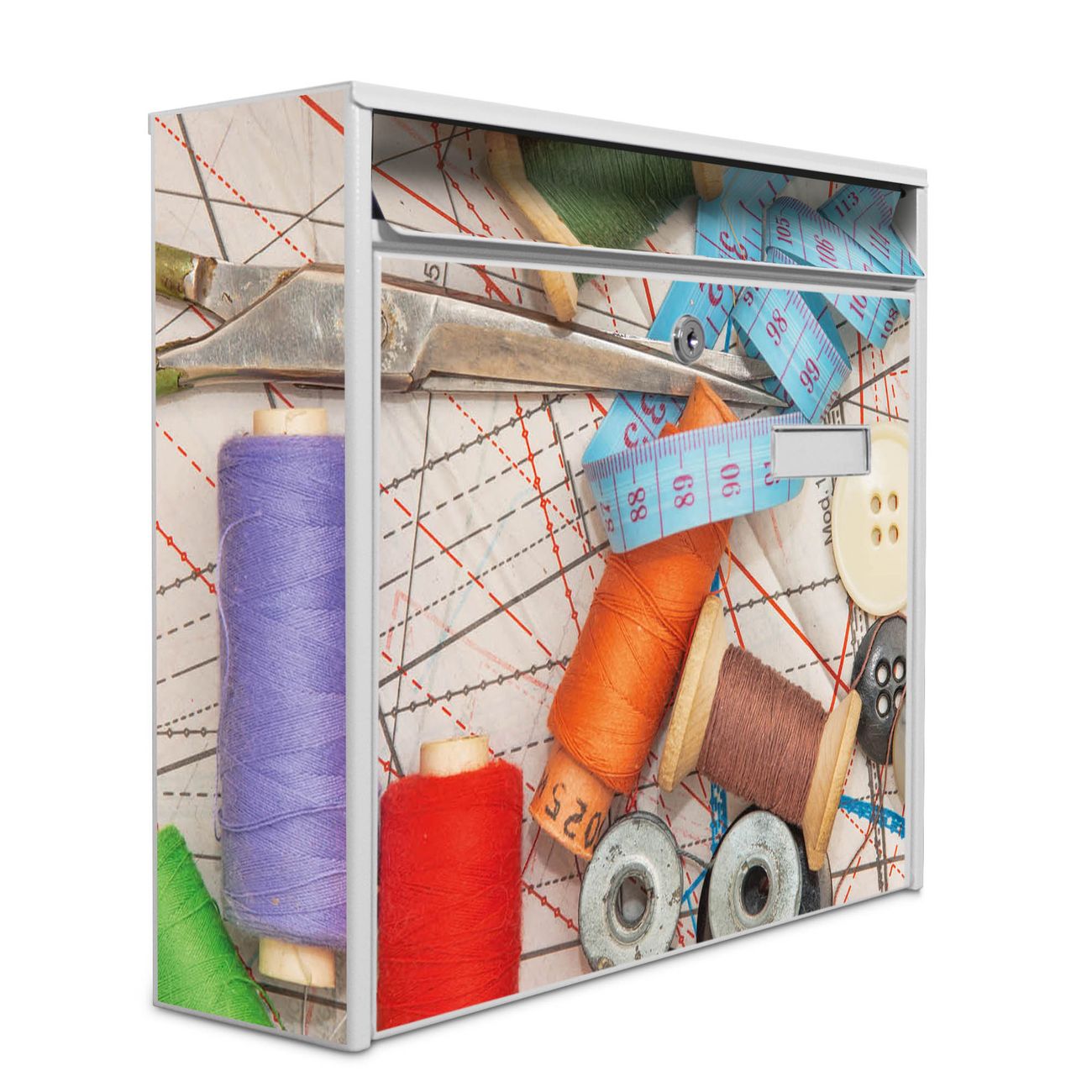 Der Postkasten mit Motiv Nähen hat ein sehr ansprechendes und zeitloses Design. Heben Sie Sich von der tristen grauen Masse ab, ohne auf Funktionalität zu verzichten. Die weite Öffnung ohne scharfe Kanten ermöglicht eine einfache Handhabung beim Entnehmen der Post. Die Größe bietet genügend Platz für Sendungen aller Art, der Einwurf fasst auch größere A4 Sendungen. Ihr Burg-Wächter Motivbriefkasten wird in Sachsen in einer kleinen Manufaktur von Hand veredelt. Die Motivfolie ist lösungsmittelfrei und schutzlaminiert, dies sorgt für einen langen Halt. Wir legen großen Wert auf die Verbindung von Funktionalität und Design.