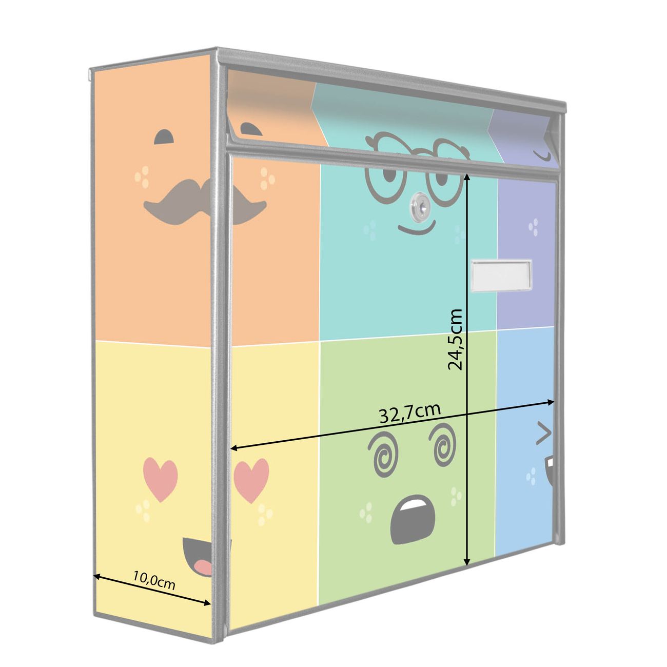 Die Größe des Briefkastens ist 36 x 32 x 10cm (BxHxT) groß. Das Motiv besteht aus einer wetter- und UV-festen Folie, die mit einem Schutzlaminat überzogen ist und Ihren Briefkasten zusätzlich vor Kratzern schützt. Sie erhalten 2 Schlüssel sowie das Montagematerial.