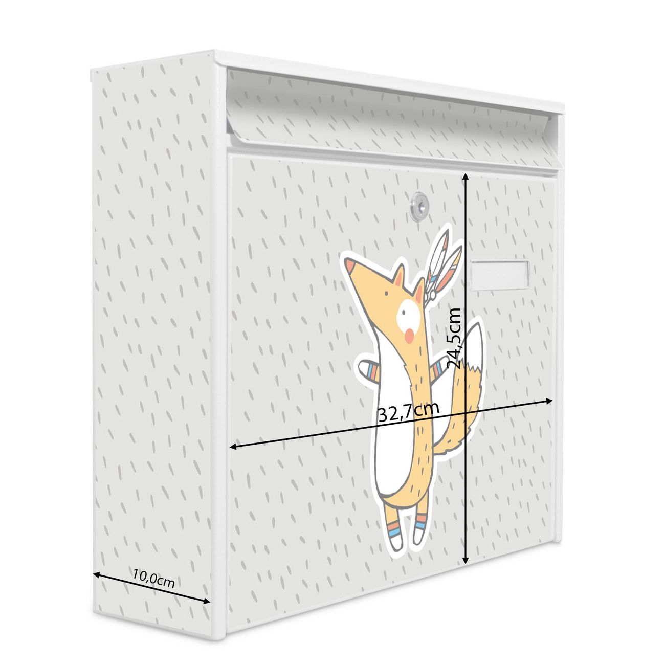 Die Größe des Briefkastens ist 36 x 32 x 10cm (BxHxT) groß. Das Motiv besteht aus einer wetter- und UV-festen Folie, die mit einem Schutzlaminat überzogen ist und Ihren Briefkasten zusätzlich vor Kratzern schützt. Sie erhalten 2 Schlüssel sowie das Montagematerial.