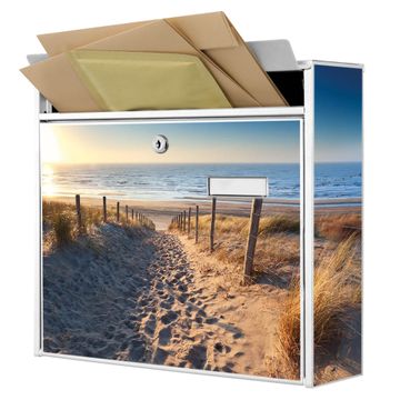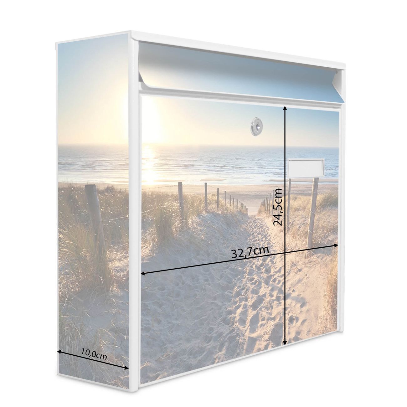Der Burg Wächter Mail Briefkasten mit Motiv Nordseestrand bietet Ihnen mit seinem Fassungsvermögen genügend Platz auch für große A4 Sendungen. Auf Wunsch können Sie bei uns den passenden Standfuß kaufen und so aus dem Wandbriefkasten einen Standbriefkasten machen. Wir bieten Ihnen ebenfalls Namensschilder, bereits beschriftet oder frei zu beschriften, und verschiedene selbst gestaltete Bitte-Keine-Werbung-Aufkleber.
