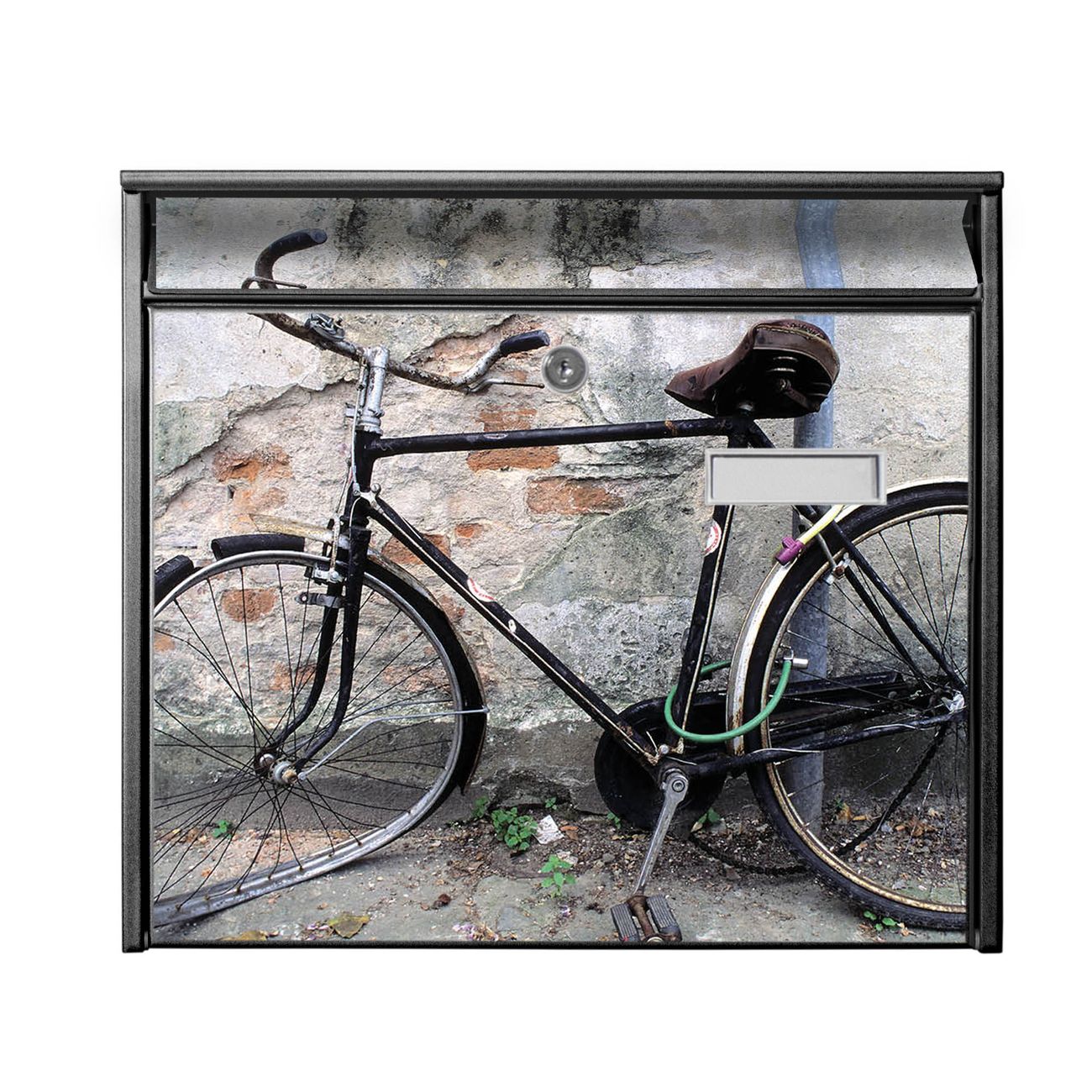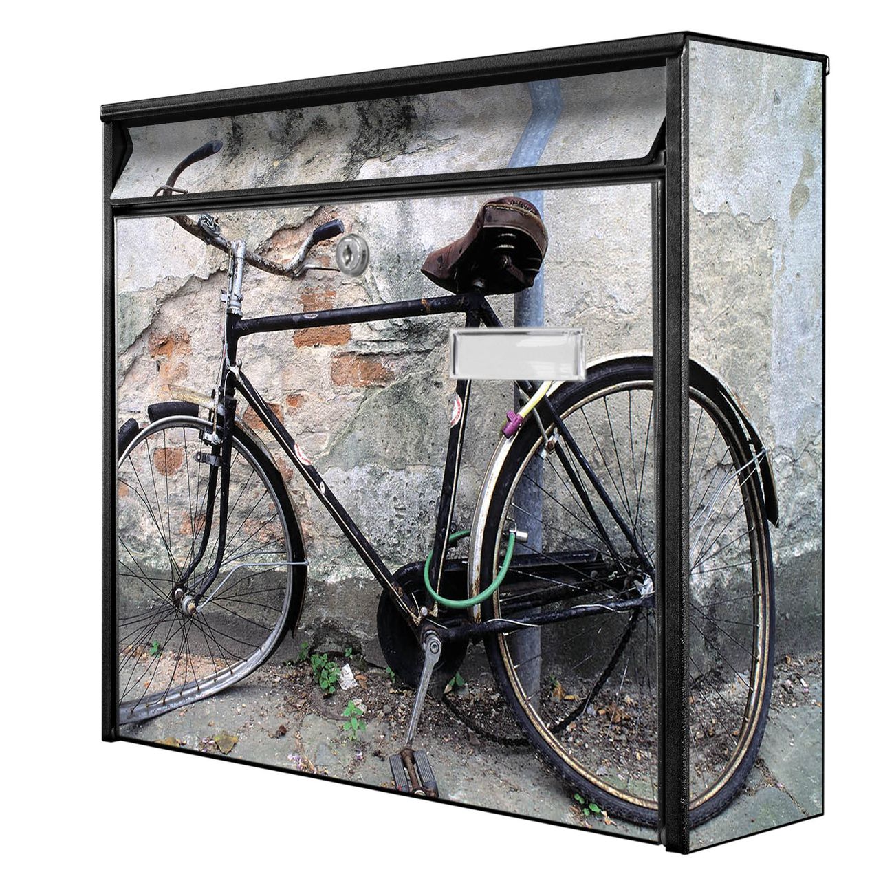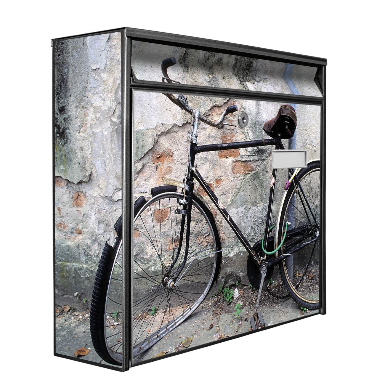 Der Burg Wächter Mail Briefkasten mit Motiv Nostalgie Rad bietet Ihnen mit seinem Fassungsvermögen genügend Platz auch für große A4 Sendungen. Auf Wunsch können Sie bei uns den passenden Standfuß kaufen und so aus dem Wandbriefkasten einen Standbriefkasten machen. Wir bieten Ihnen ebenfalls Namensschilder, bereits beschriftet oder frei zu beschriften, und verschiedene selbst gestaltete Bitte-Keine-Werbung-Aufkleber.