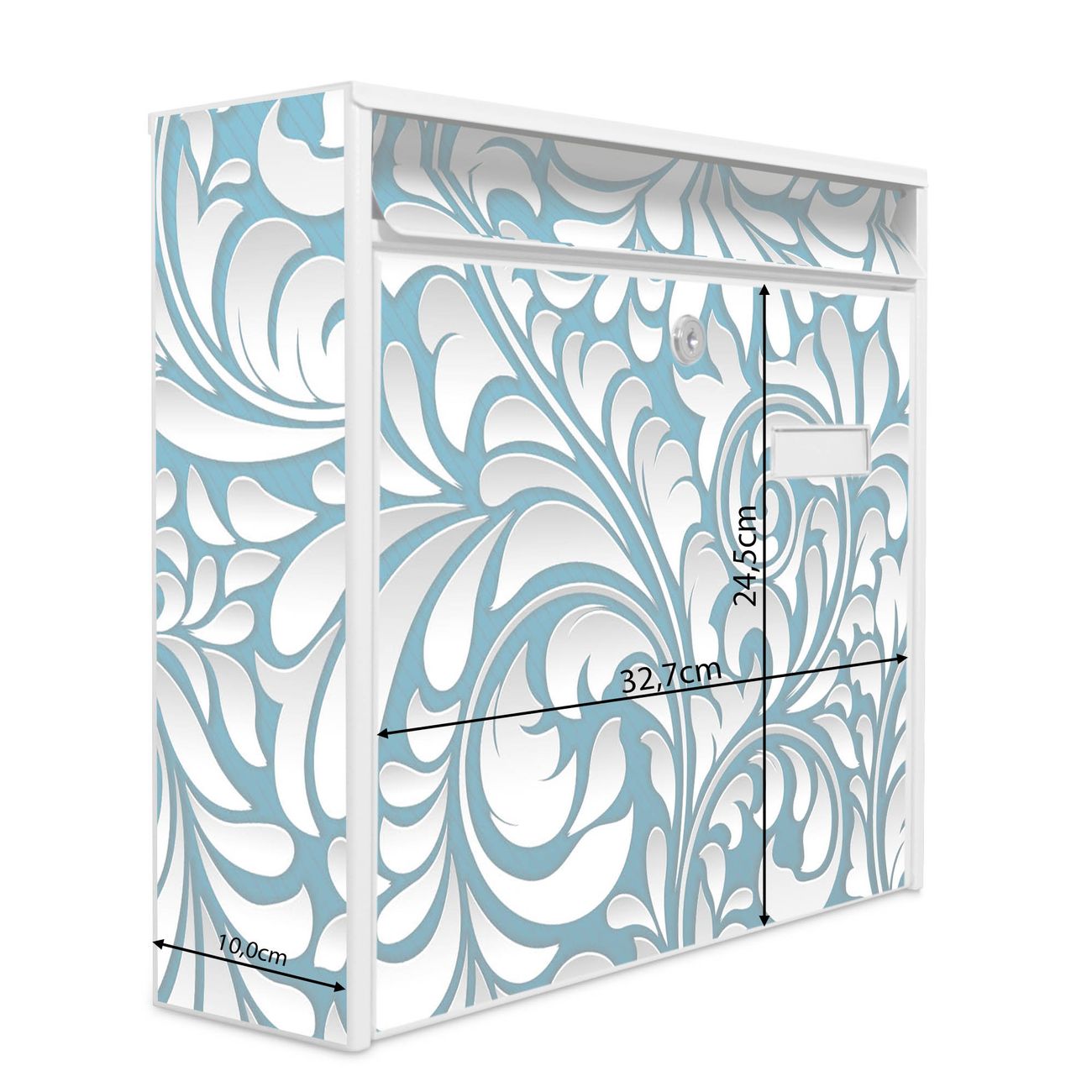 Die Größe des Briefkastens ist 36 x 32 x 10cm (BxHxT) groß. Das Motiv besteht aus einer wetter- und UV-festen Folie, die mit einem Schutzlaminat überzogen ist und Ihren Briefkasten zusätzlich vor Kratzern schützt. Sie erhalten 2 Schlüssel sowie das Montagematerial.