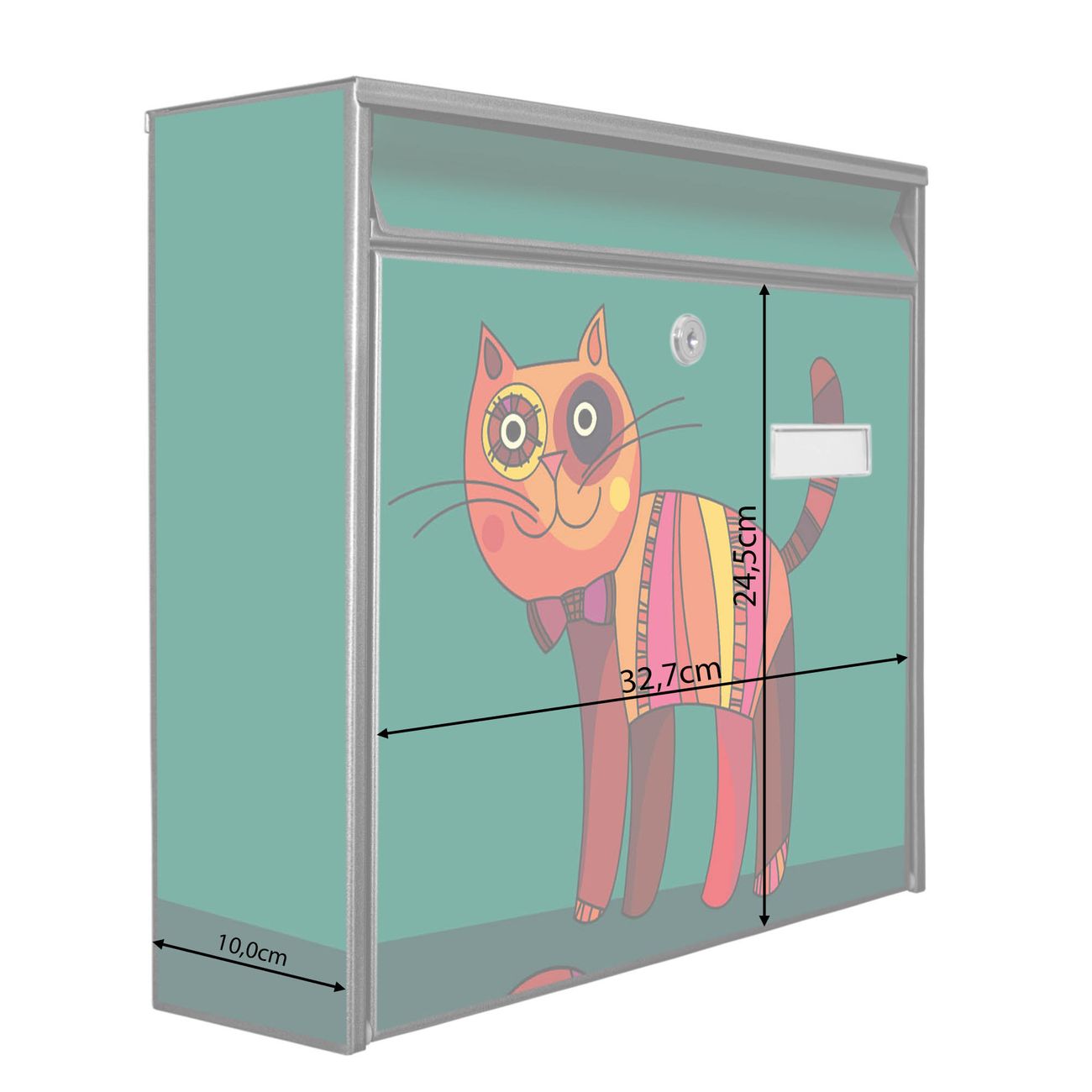 Die Größe des Briefkastens ist 36 x 32 x 10cm (BxHxT) groß. Das Motiv besteht aus einer wetter- und UV-festen Folie, die mit einem Schutzlaminat überzogen ist und Ihren Briefkasten zusätzlich vor Kratzern schützt. Sie erhalten 2 Schlüssel sowie das Montagematerial.