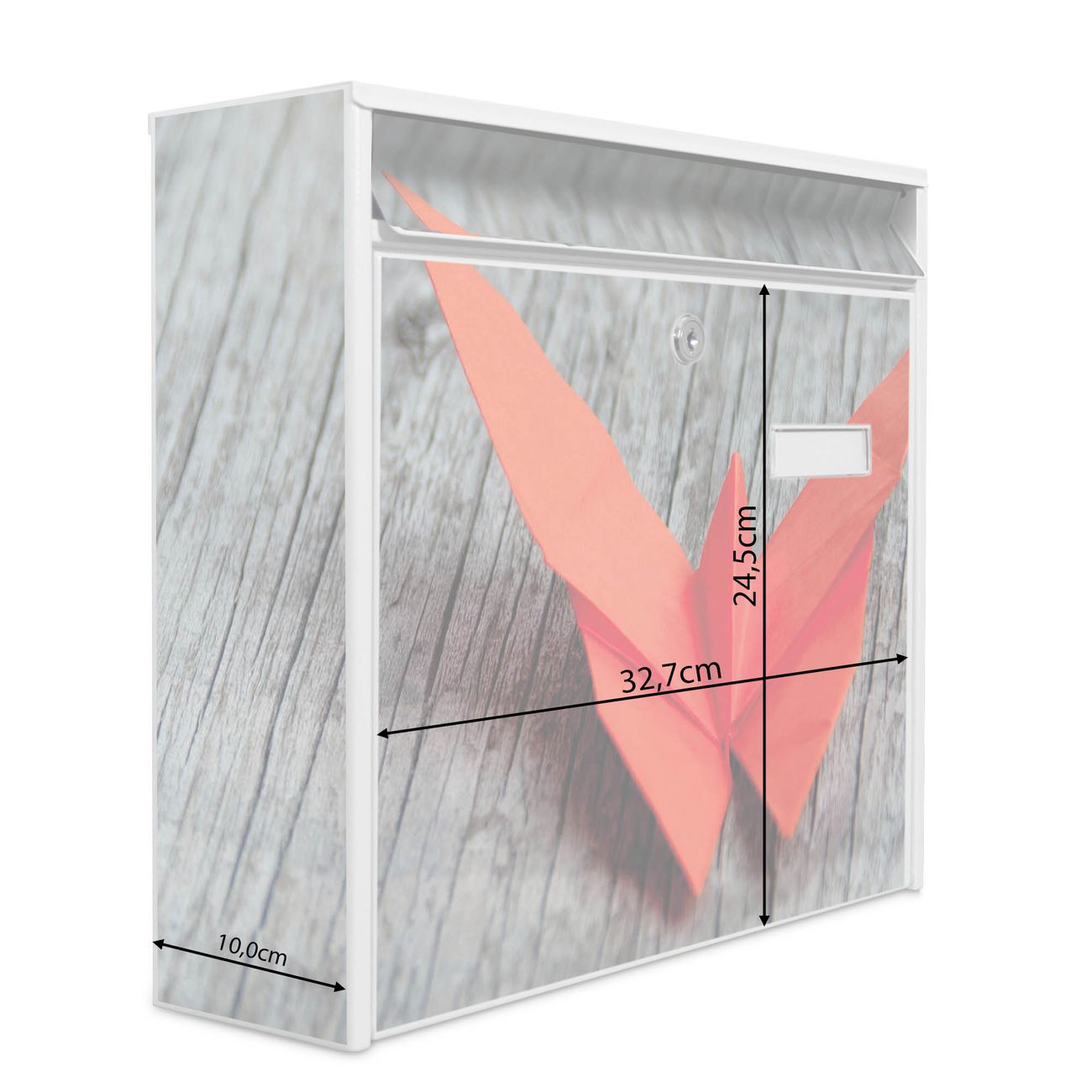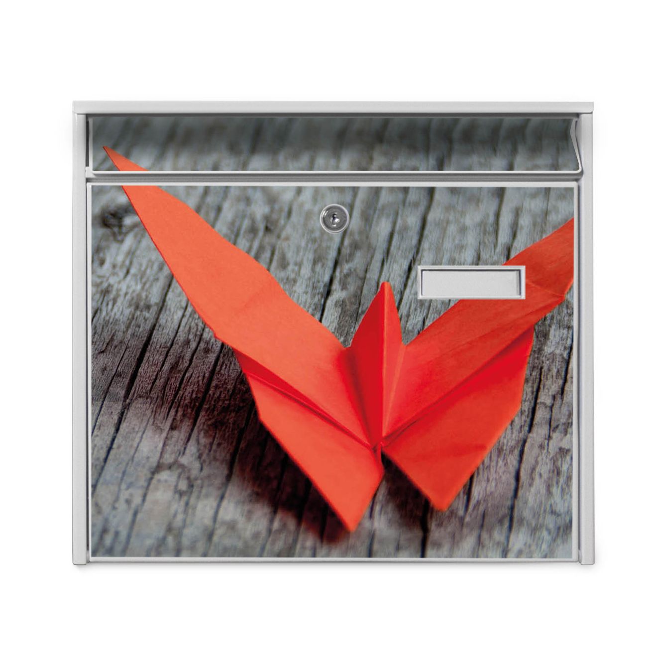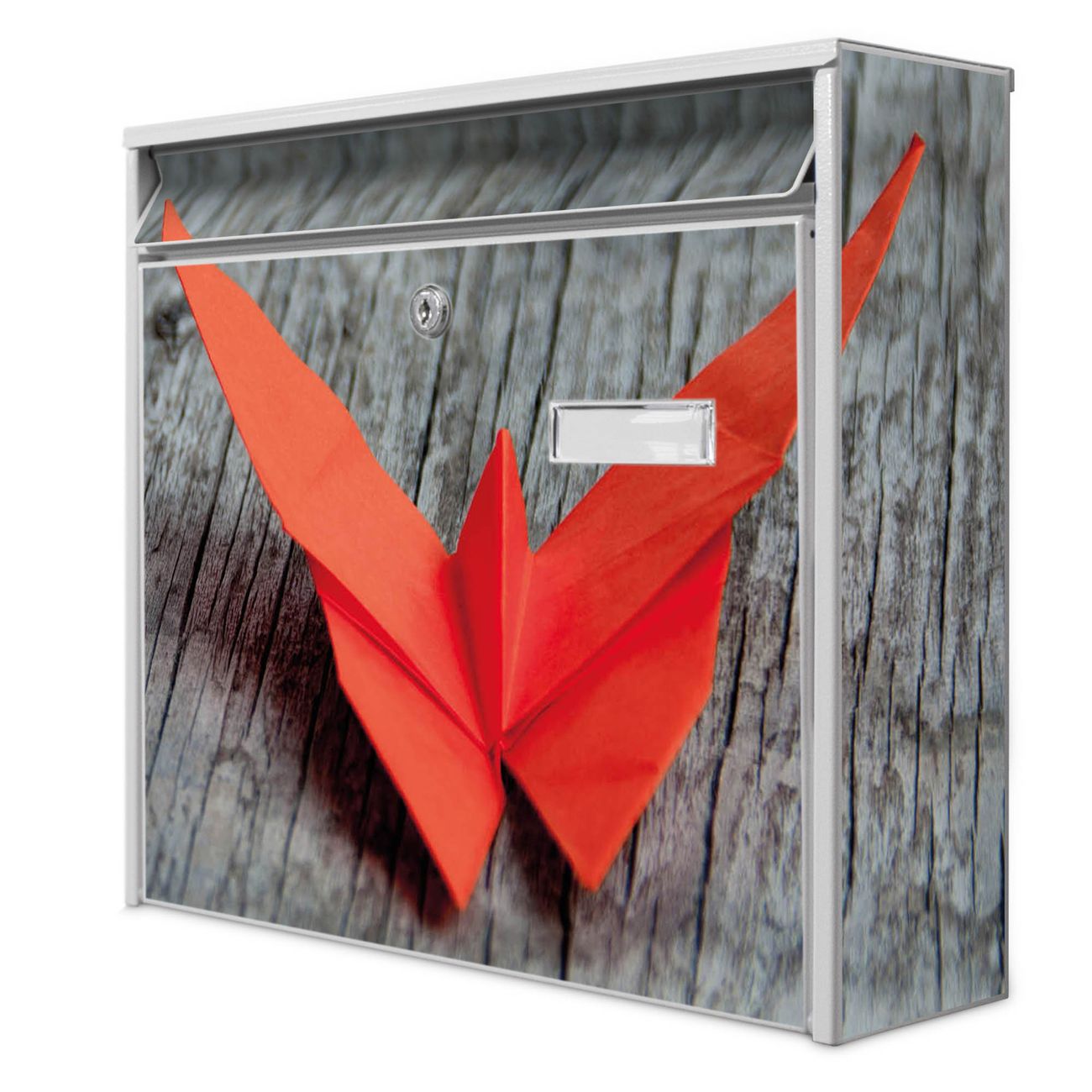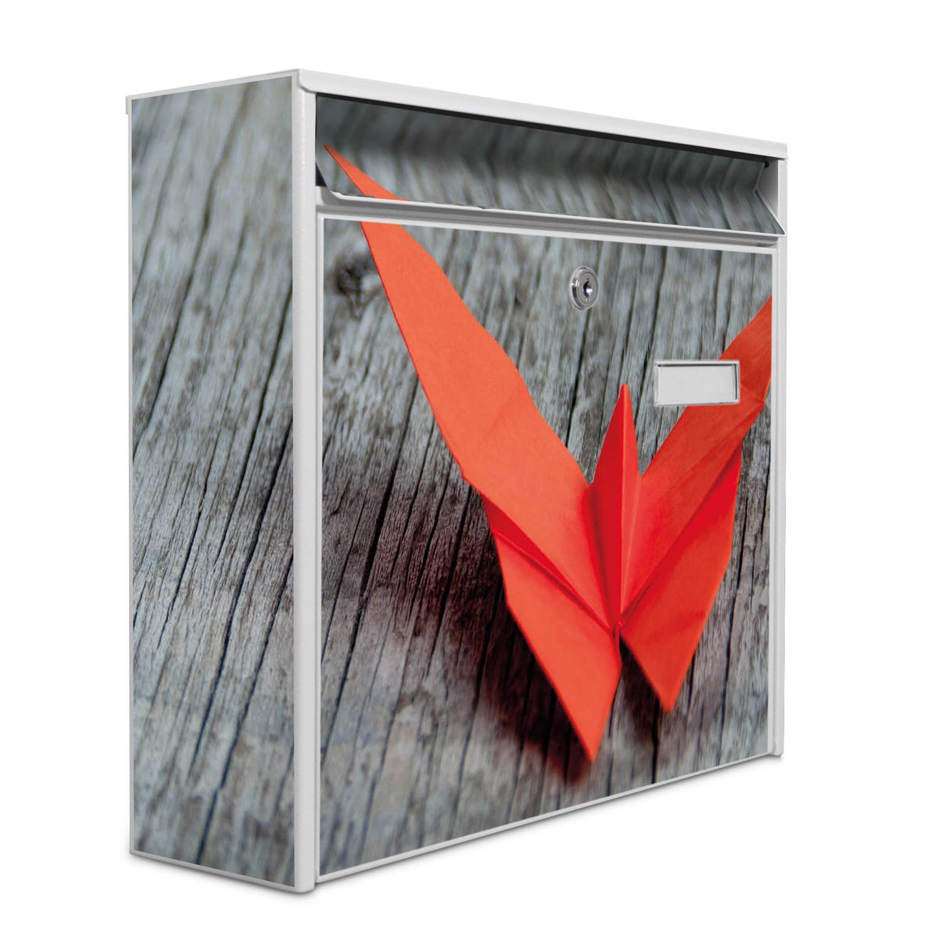 Der Burg Wächter Mail Briefkasten mit Motiv Origami Schmetterling bietet Ihnen mit seinem Fassungsvermögen genügend Platz auch für große A4 Sendungen. Auf Wunsch können Sie bei uns den passenden Standfuß kaufen und so aus dem Wandbriefkasten einen Standbriefkasten machen. Wir bieten Ihnen ebenfalls Namensschilder, bereits beschriftet oder frei zu beschriften, und verschiedene selbst gestaltete Bitte-Keine-Werbung-Aufkleber.