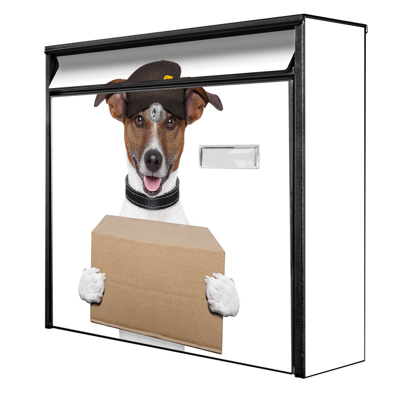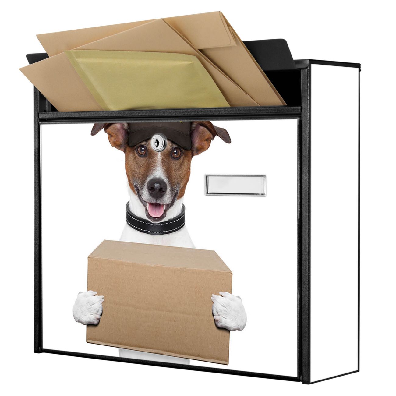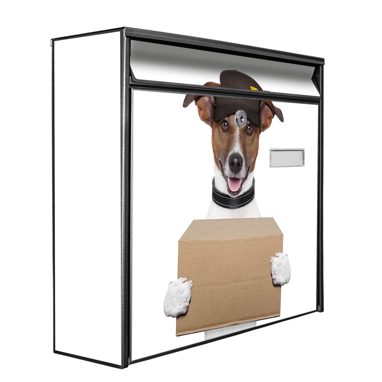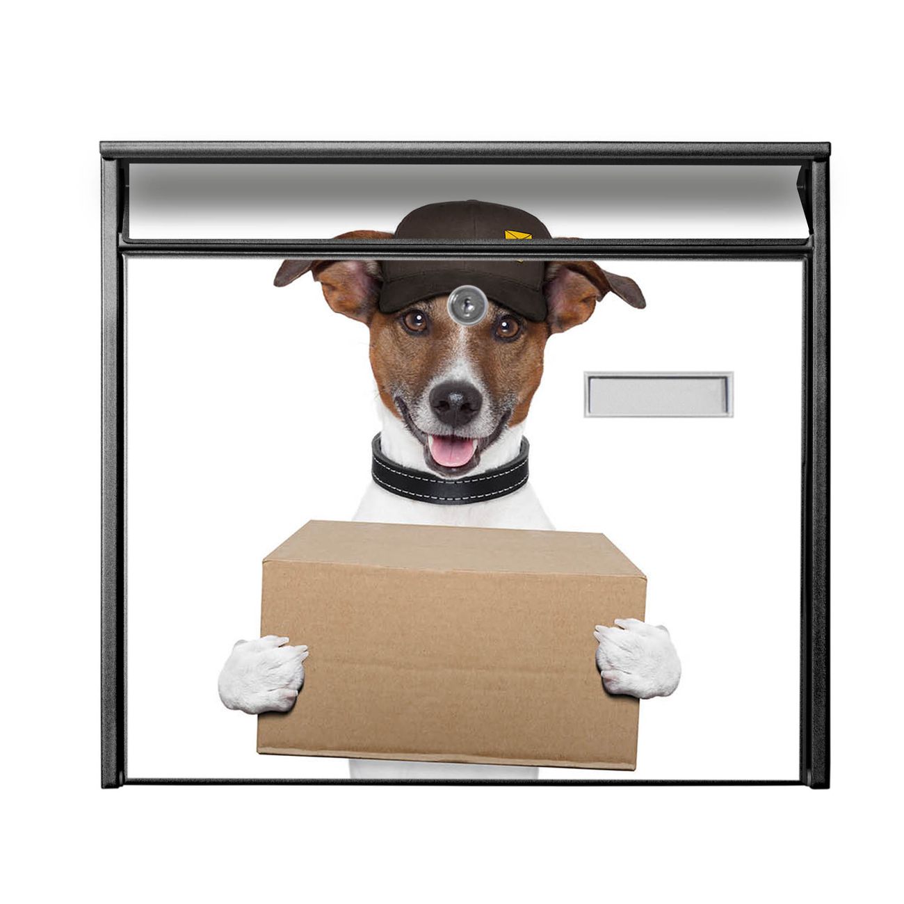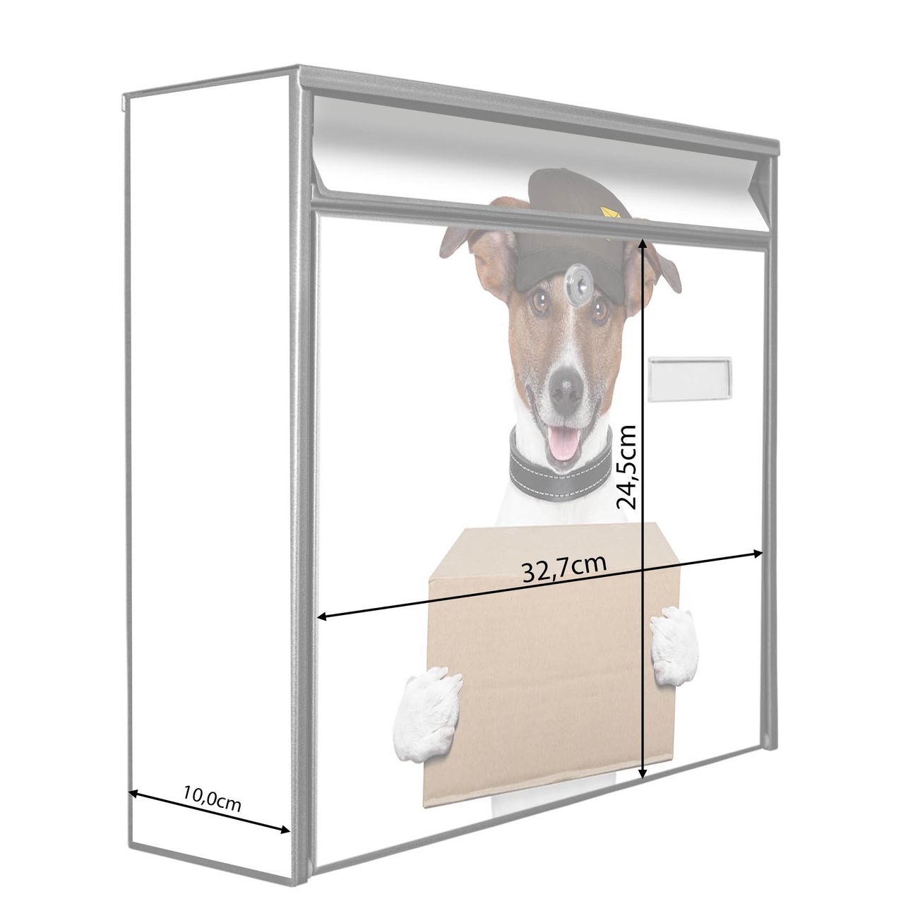 Der Burg Wächter Mail Briefkasten mit Motiv Paketdienst Jack Russel bietet Ihnen mit seinem Fassungsvermögen genügend Platz auch für große A4 Sendungen. Auf Wunsch können Sie bei uns den passenden Standfuß kaufen und so aus dem Wandbriefkasten einen Standbriefkasten machen. Wir bieten Ihnen ebenfalls Namensschilder, bereits beschriftet oder frei zu beschriften, und verschiedene selbst gestaltete Bitte-Keine-Werbung-Aufkleber.