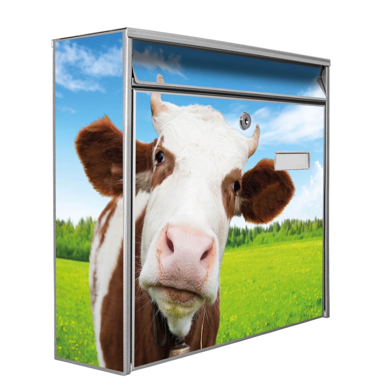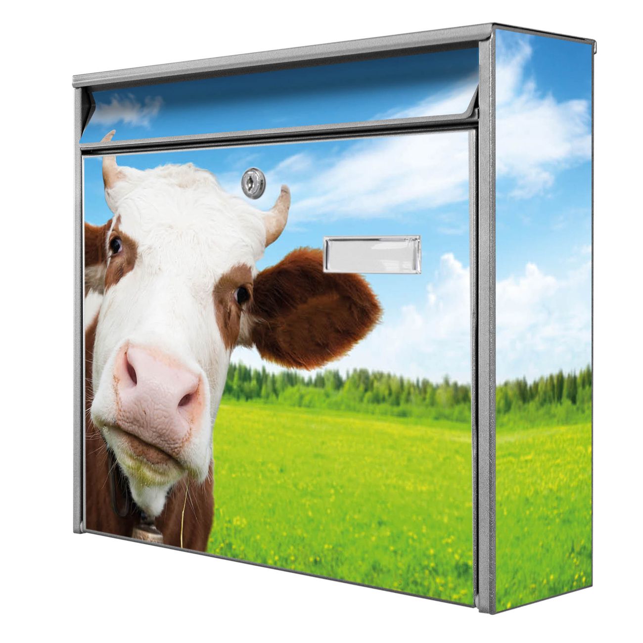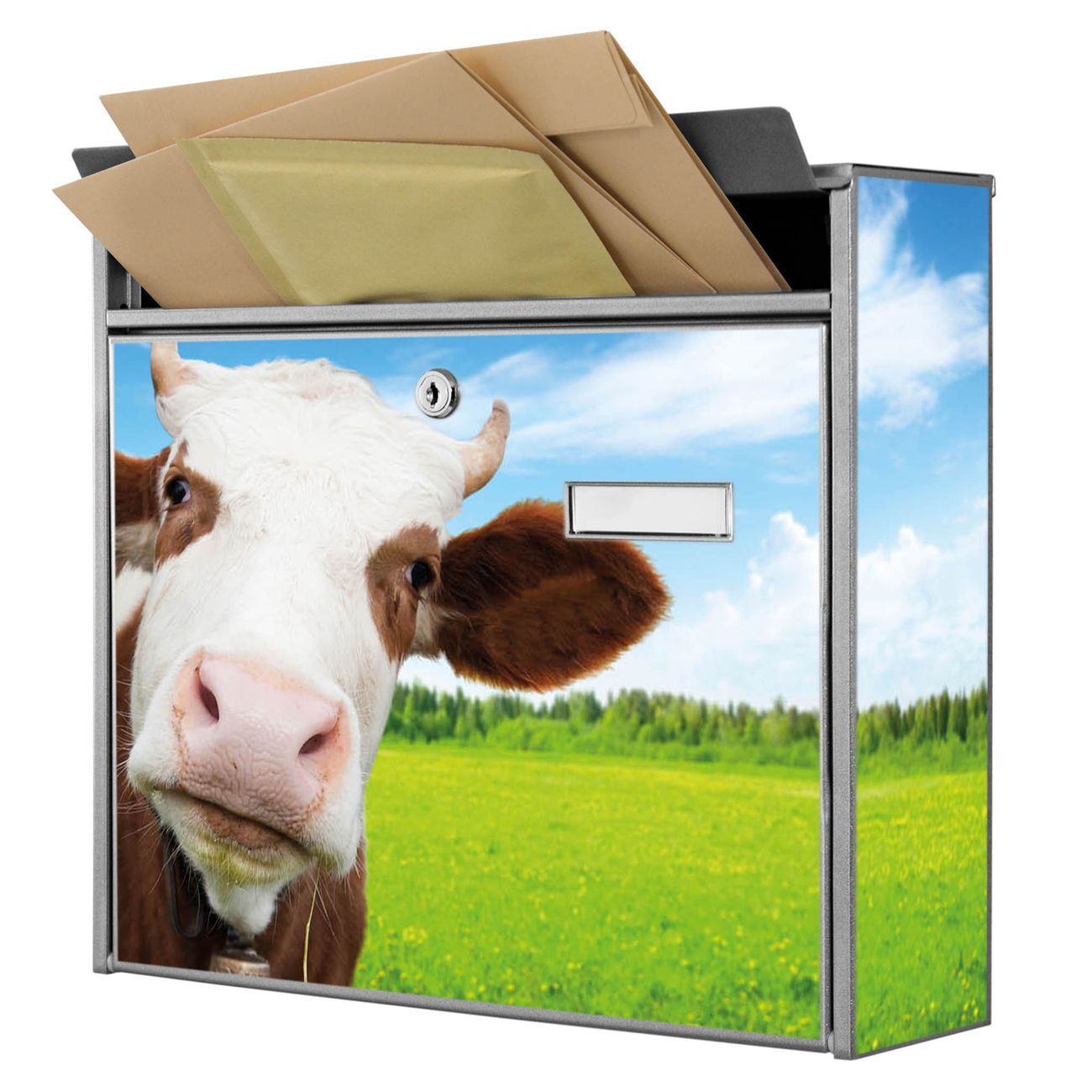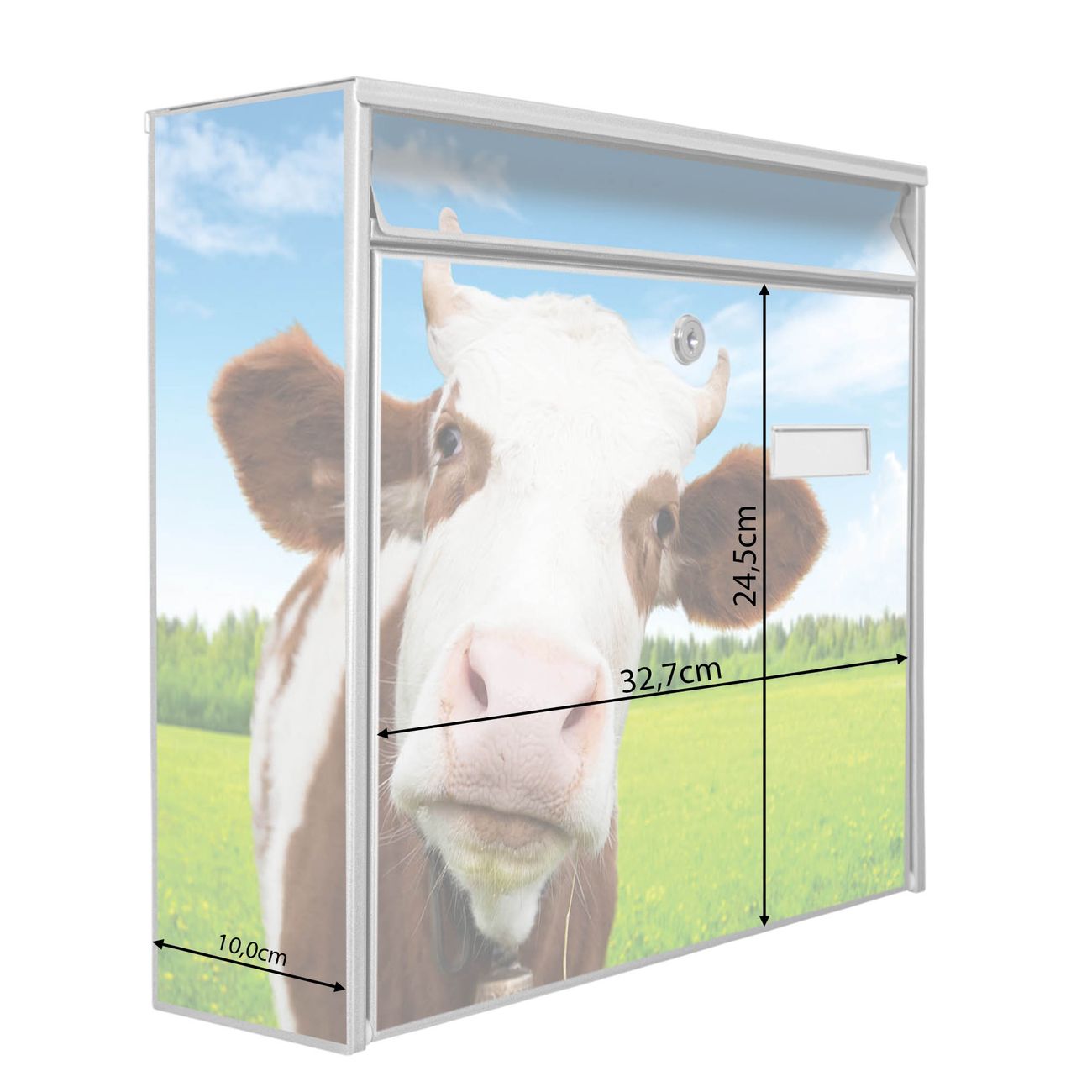 Die Größe des Briefkastens ist 36 x 32 x 10cm (BxHxT) groß. Das Motiv besteht aus einer wetter- und UV-festen Folie, die mit einem Schutzlaminat überzogen ist und Ihren Briefkasten zusätzlich vor Kratzern schützt. Sie erhalten 2 Schlüssel sowie das Montagematerial.