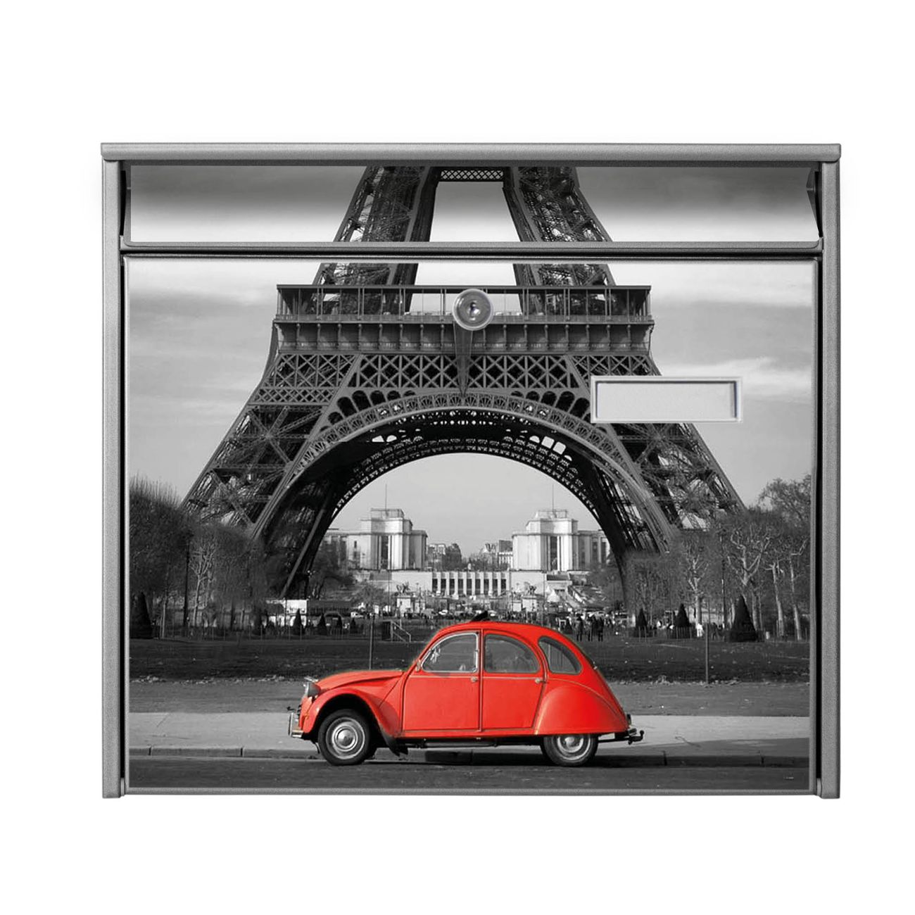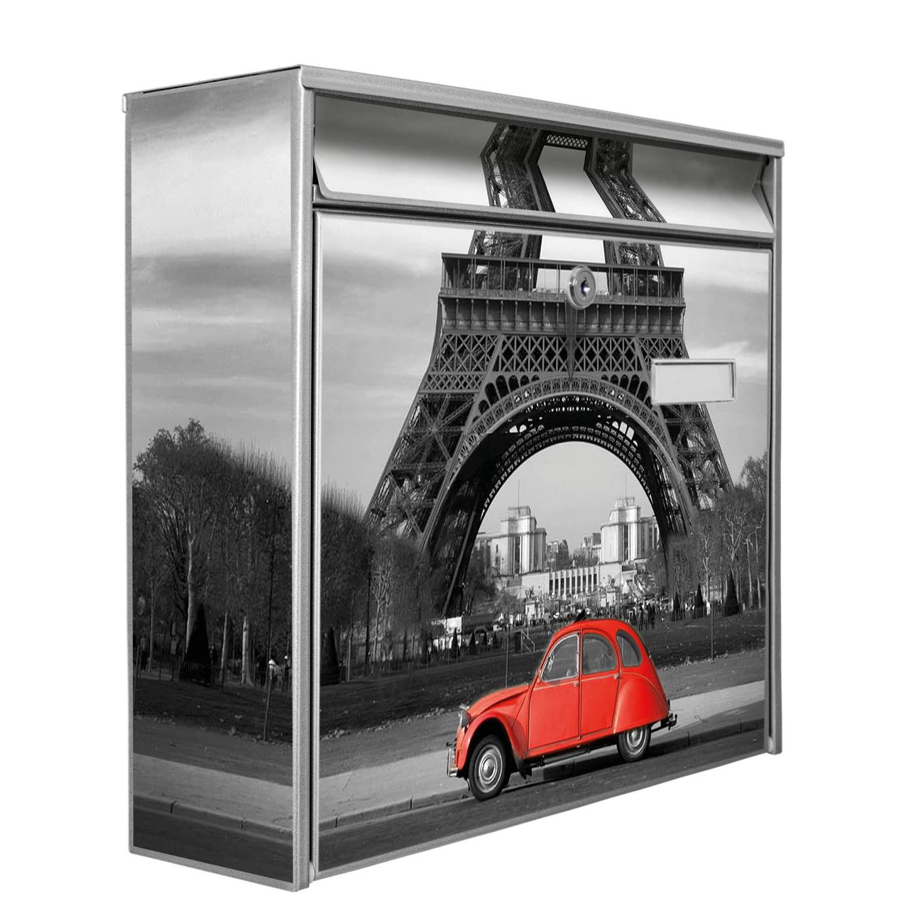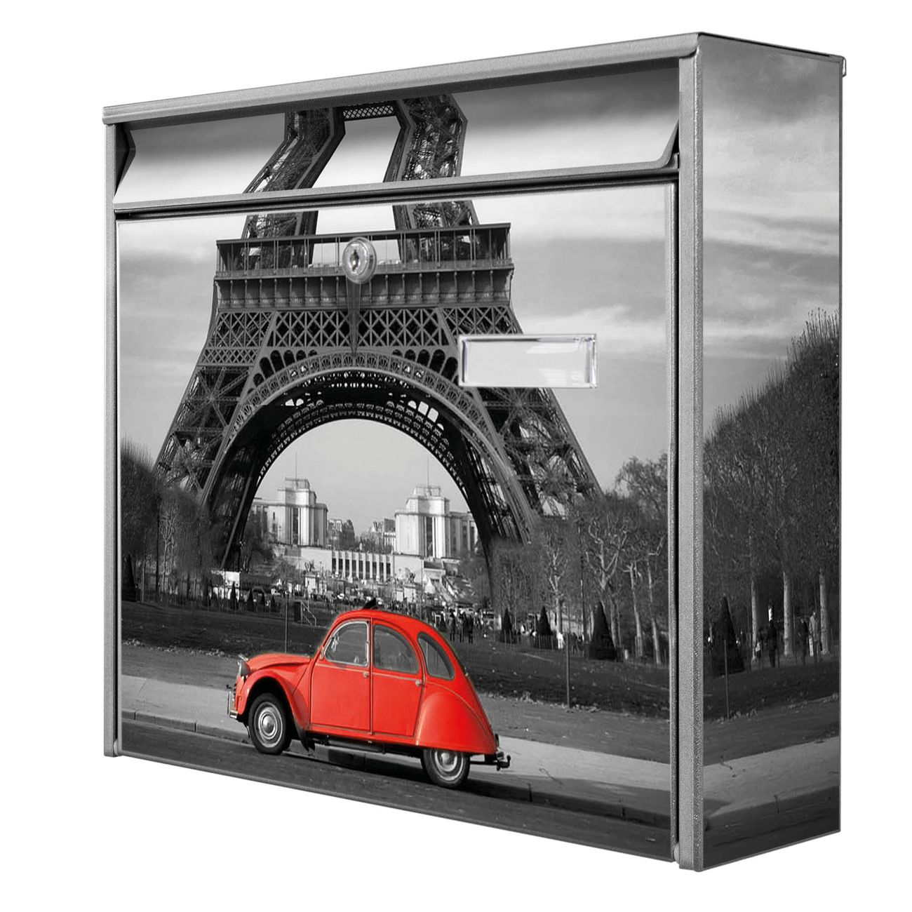 Der Burg Wächter Mail Briefkasten mit Motiv Paris bietet Ihnen mit seinem Fassungsvermögen genügend Platz auch für große A4 Sendungen. Auf Wunsch können Sie bei uns den passenden Standfuß kaufen und so aus dem Wandbriefkasten einen Standbriefkasten machen. Wir bieten Ihnen ebenfalls Namensschilder, bereits beschriftet oder frei zu beschriften, und verschiedene selbst gestaltete Bitte-Keine-Werbung-Aufkleber.