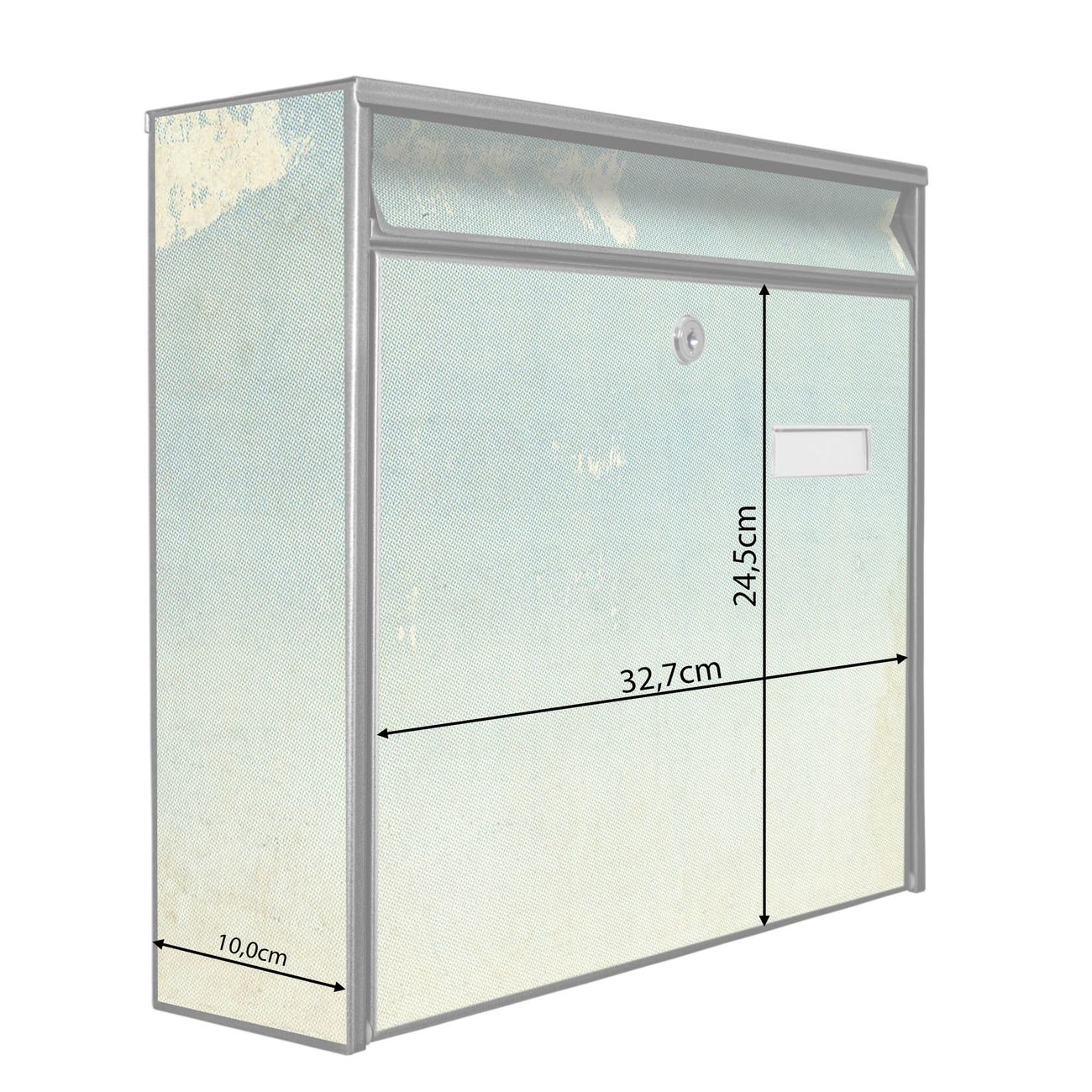 Die Größe des Briefkastens ist 36 x 32 x 10cm (BxHxT) groß. Das Motiv besteht aus einer wetter- und UV-festen Folie, die mit einem Schutzlaminat überzogen ist und Ihren Briefkasten zusätzlich vor Kratzern schützt. Sie erhalten 2 Schlüssel sowie das Montagematerial.