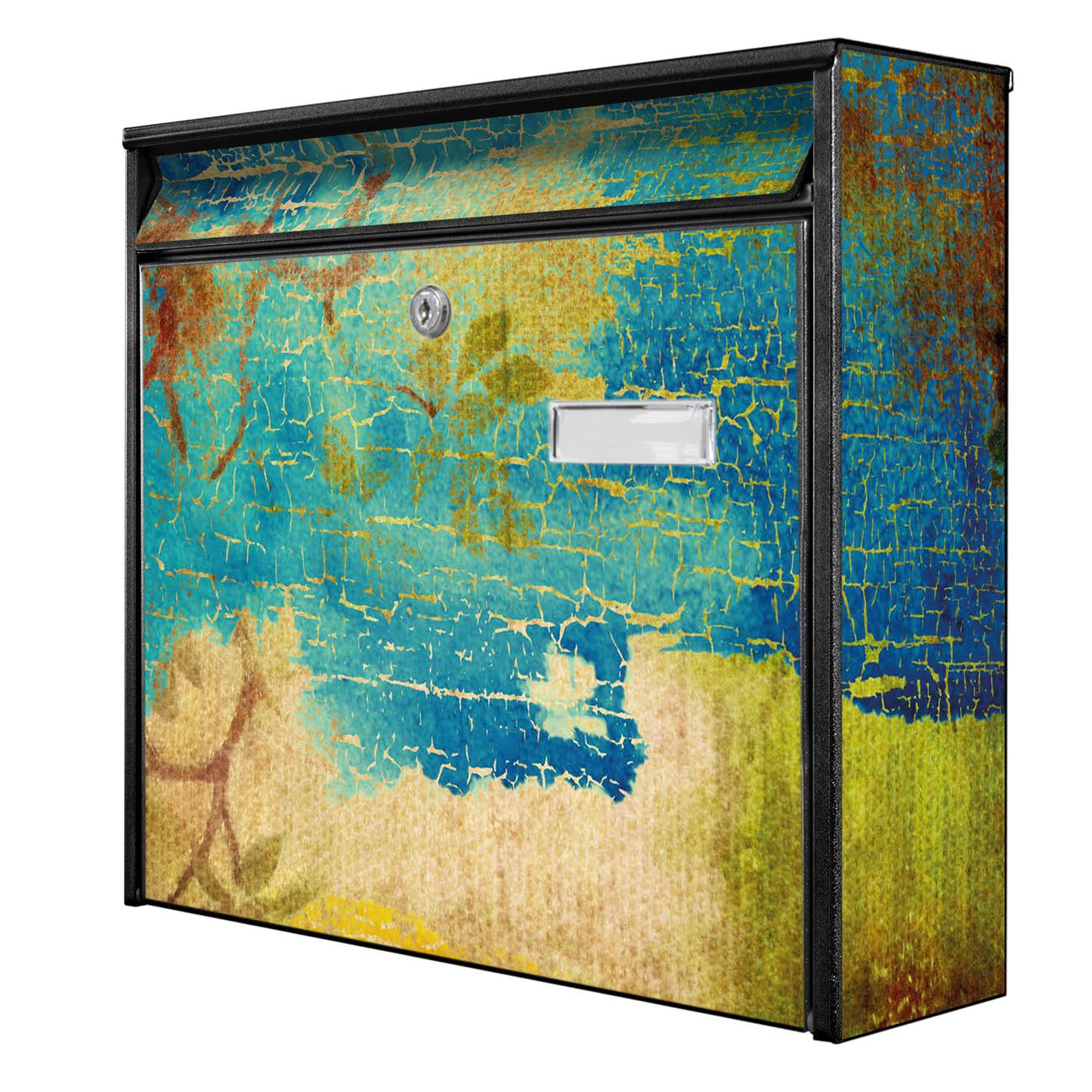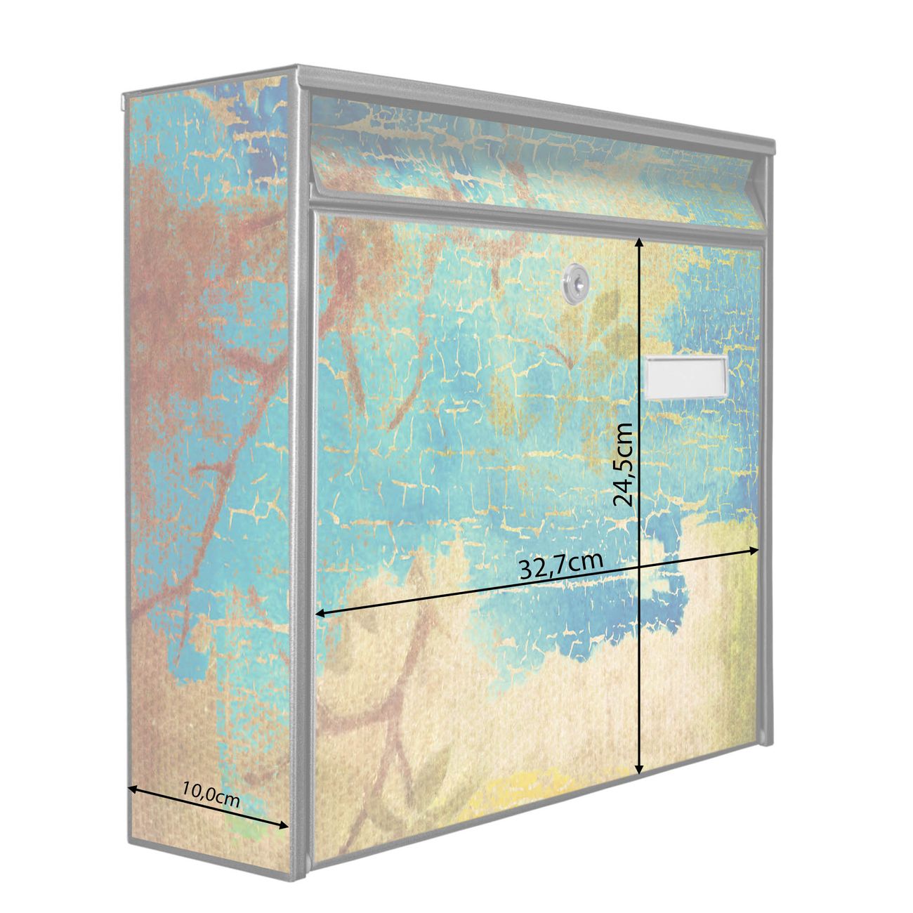 Die Größe des Briefkastens ist 36 x 32 x 10cm (BxHxT) groß. Das Motiv besteht aus einer wetter- und UV-festen Folie, die mit einem Schutzlaminat überzogen ist und Ihren Briefkasten zusätzlich vor Kratzern schützt. Sie erhalten 2 Schlüssel sowie das Montagematerial.
