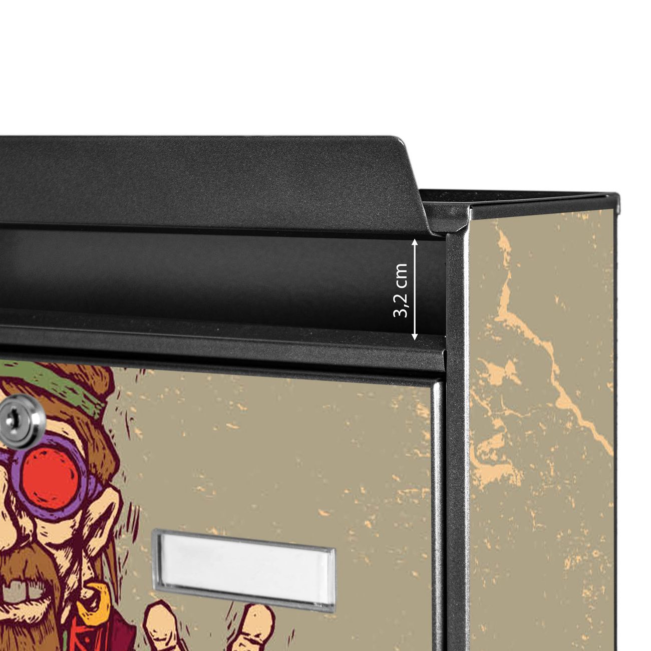 Die Größe des Briefkastens ist 36 x 32 x 10cm (BxHxT) groß. Das Motiv besteht aus einer wetter- und UV-festen Folie, die mit einem Schutzlaminat überzogen ist und Ihren Briefkasten zusätzlich vor Kratzern schützt. Sie erhalten 2 Schlüssel sowie das Montagematerial.