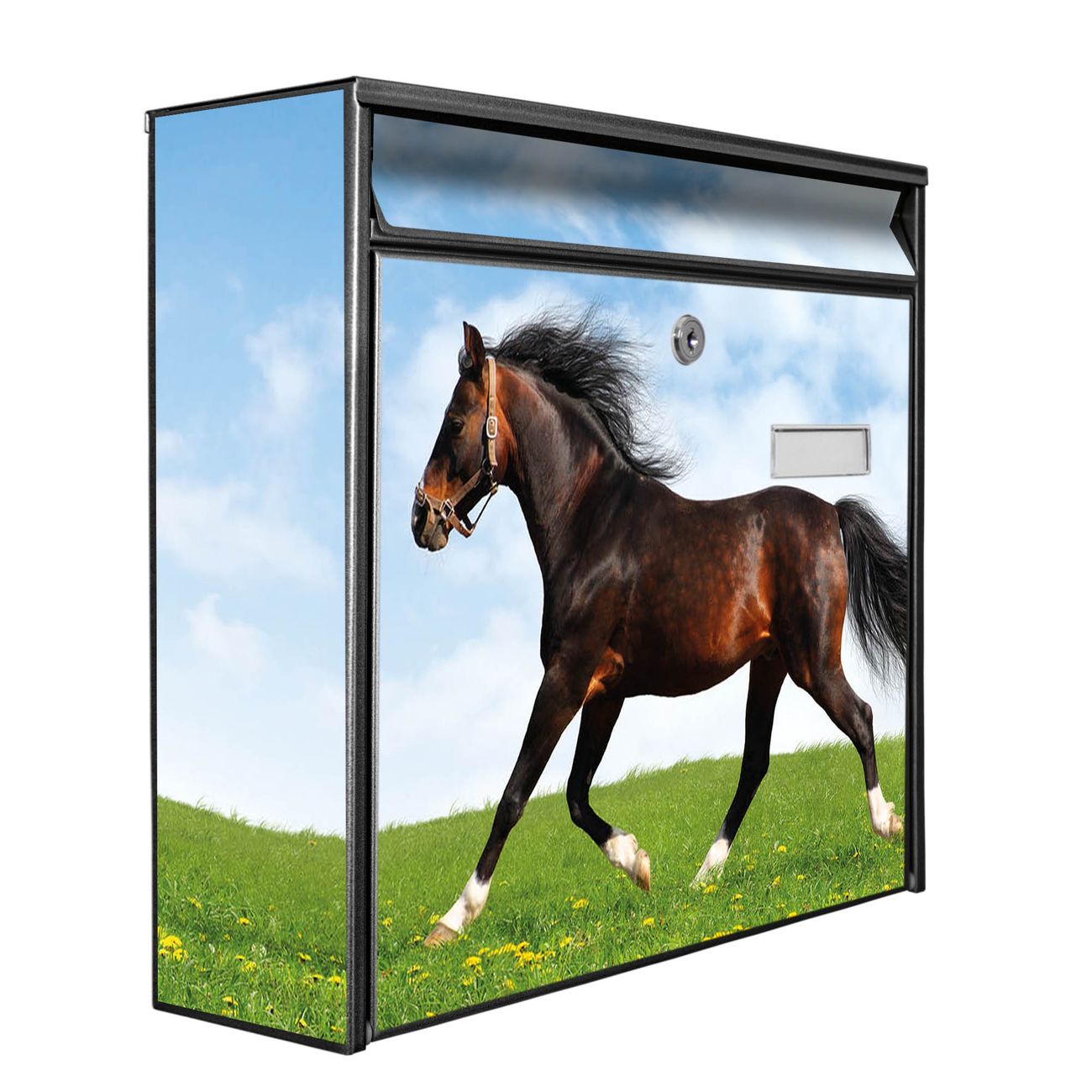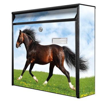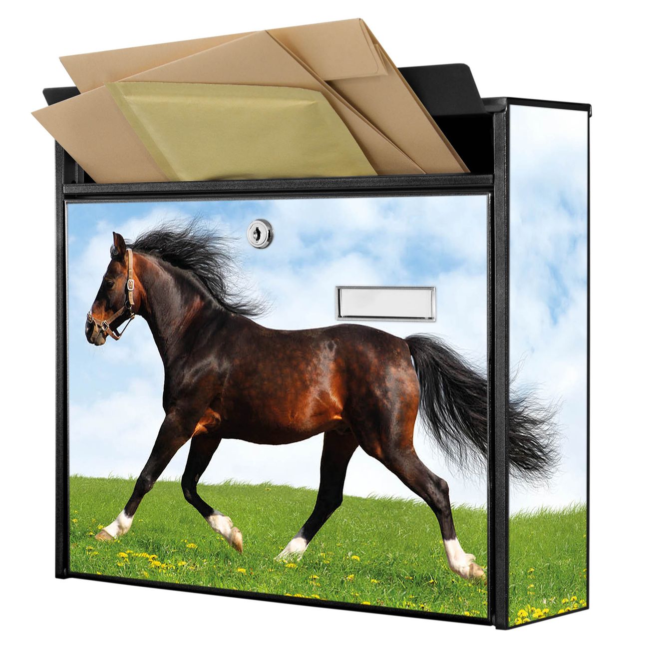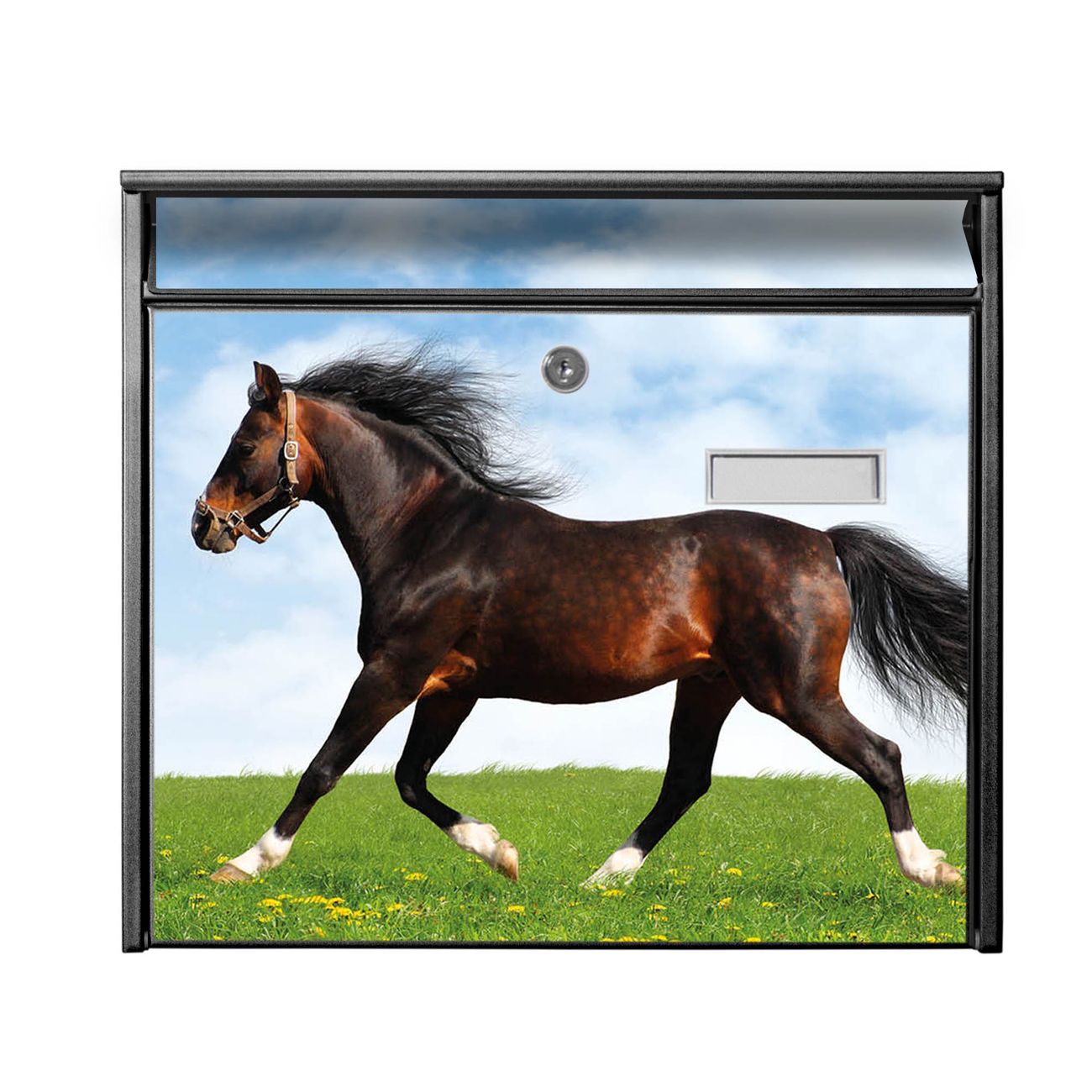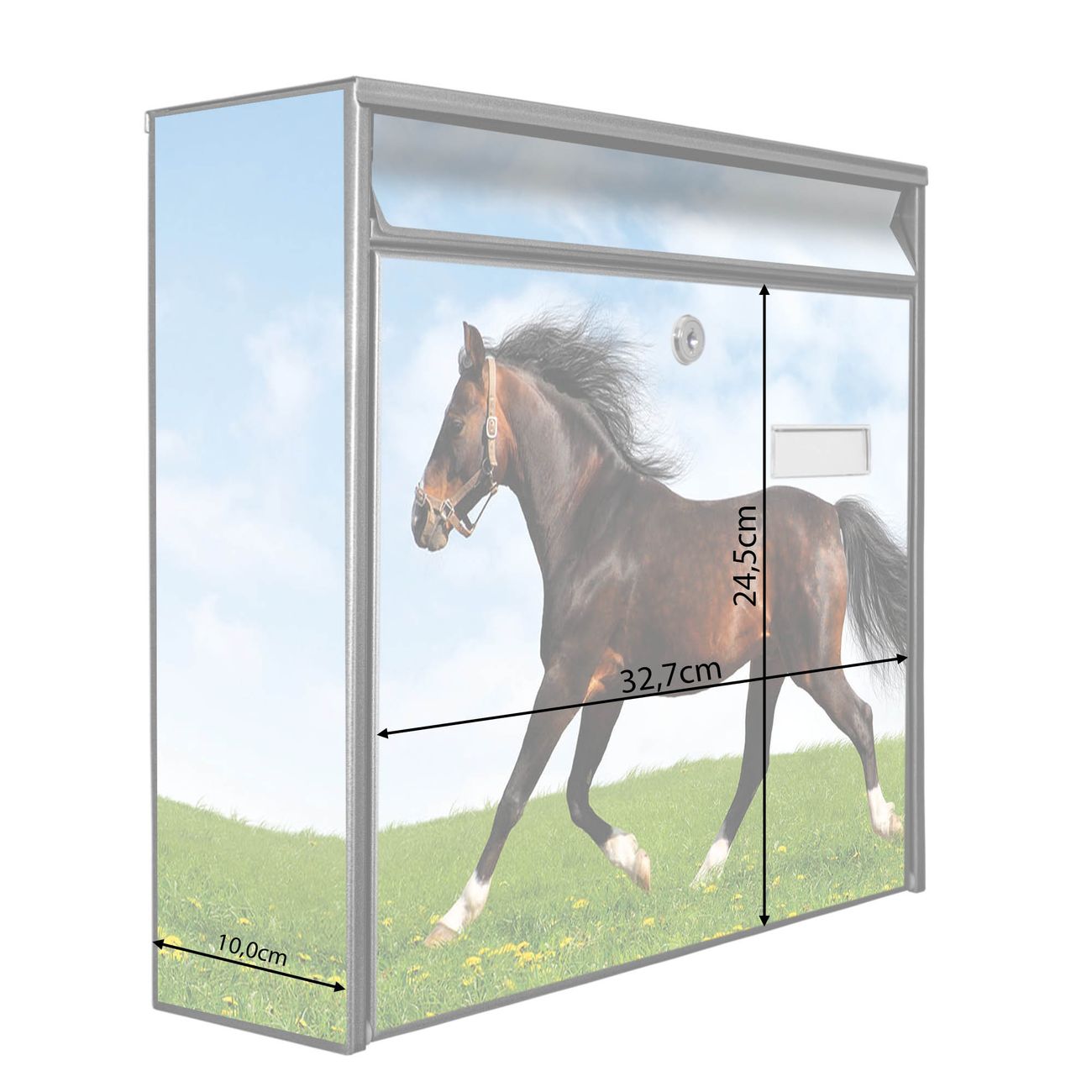 Der Burg Wächter Mail Briefkasten mit Motiv Pferd bietet Ihnen mit seinem Fassungsvermögen genügend Platz auch für große A4 Sendungen. Auf Wunsch können Sie bei uns den passenden Standfuß kaufen und so aus dem Wandbriefkasten einen Standbriefkasten machen. Wir bieten Ihnen ebenfalls Namensschilder, bereits beschriftet oder frei zu beschriften, und verschiedene selbst gestaltete Bitte-Keine-Werbung-Aufkleber.