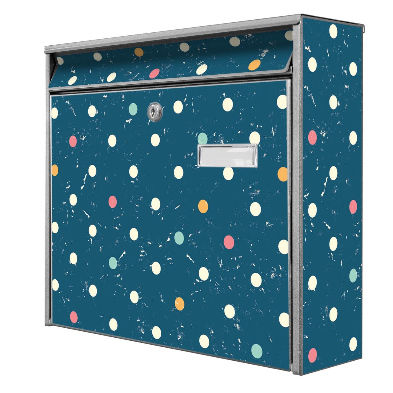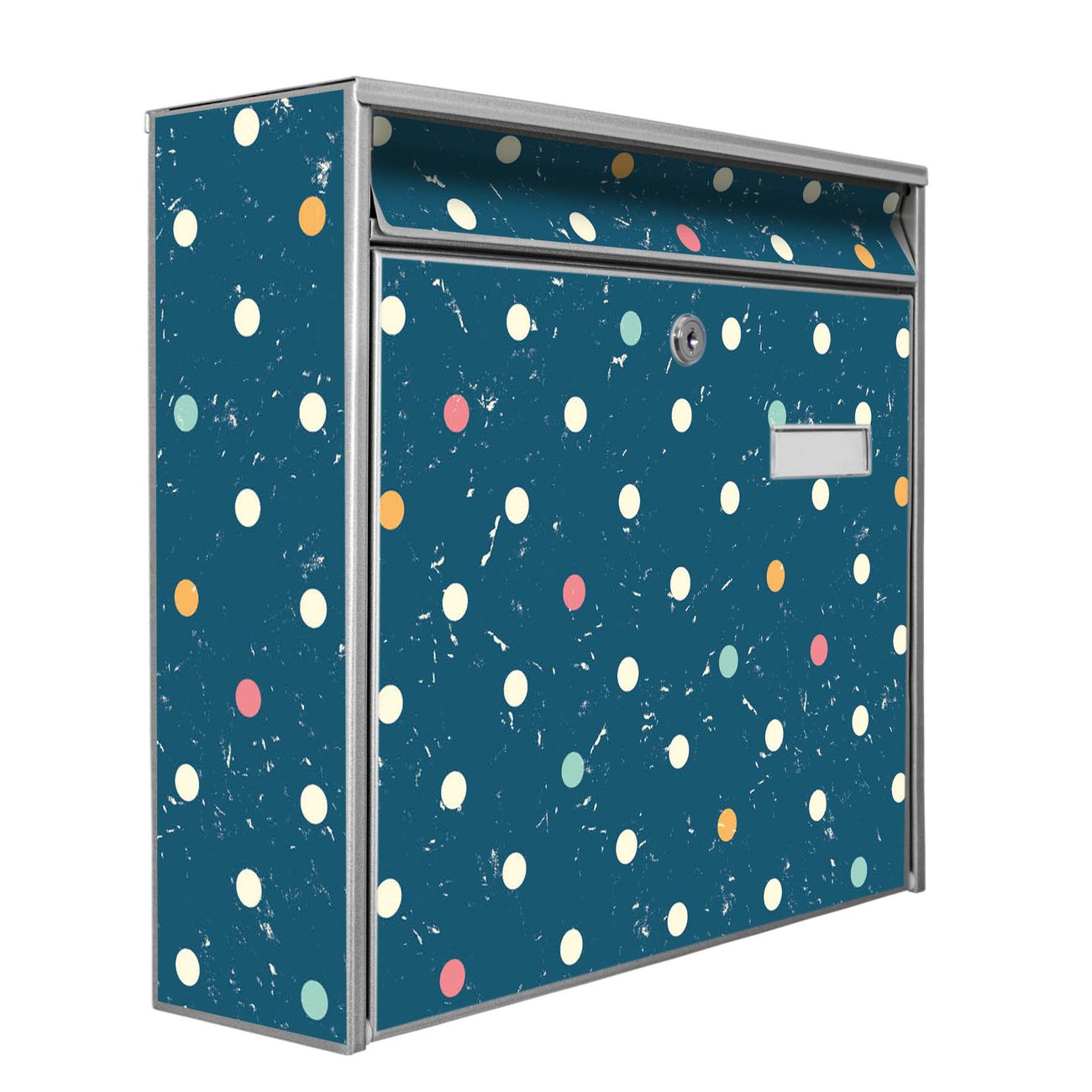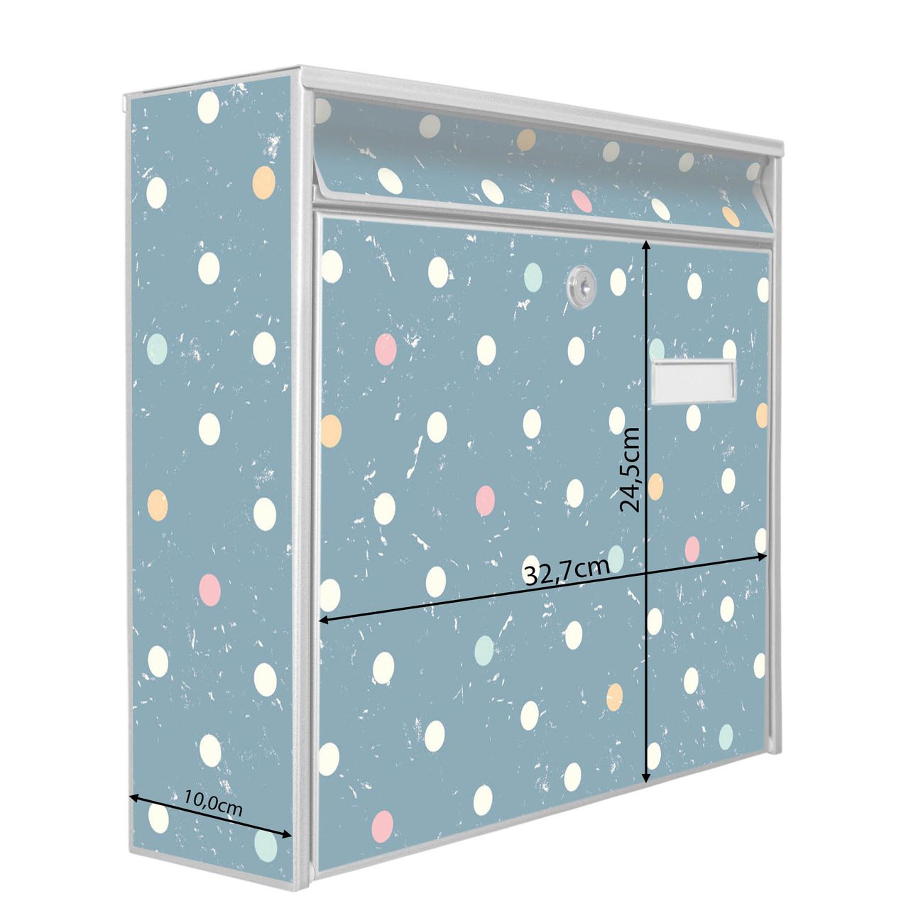 Der Burg Wächter Mail Briefkasten mit Motiv Punkte auf Blau bietet Ihnen mit seinem Fassungsvermögen genügend Platz auch für große A4 Sendungen. Auf Wunsch können Sie bei uns den passenden Standfuß kaufen und so aus dem Wandbriefkasten einen Standbriefkasten machen. Wir bieten Ihnen ebenfalls Namensschilder, bereits beschriftet oder frei zu beschriften, und verschiedene selbst gestaltete Bitte-Keine-Werbung-Aufkleber.