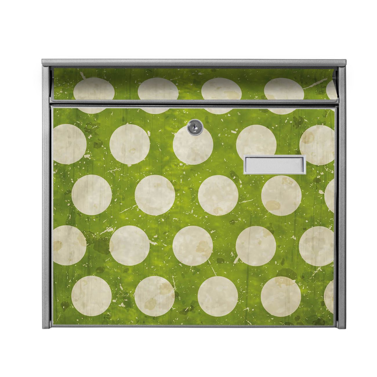 Der Burg Wächter Mail Briefkasten mit Motiv Punkte Grün Vintage bietet Ihnen mit seinem Fassungsvermögen genügend Platz auch für große A4 Sendungen. Auf Wunsch können Sie bei uns den passenden Standfuß kaufen und so aus dem Wandbriefkasten einen Standbriefkasten machen. Wir bieten Ihnen ebenfalls Namensschilder, bereits beschriftet oder frei zu beschriften, und verschiedene selbst gestaltete Bitte-Keine-Werbung-Aufkleber.