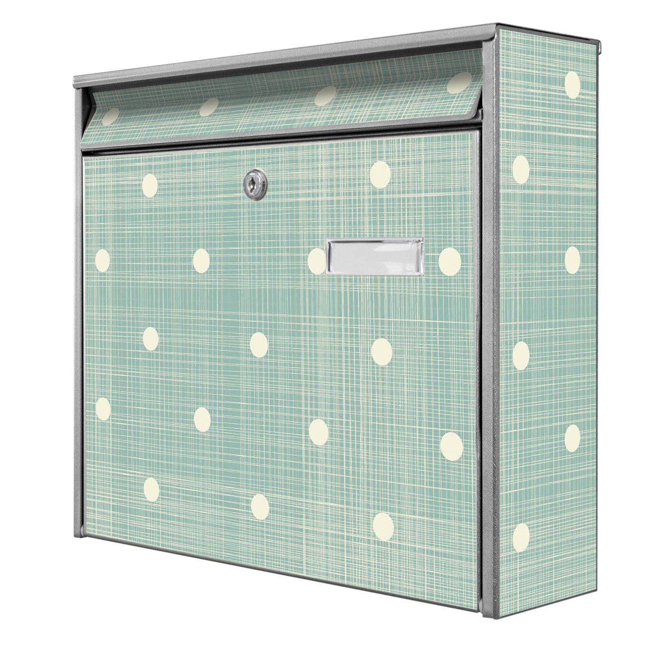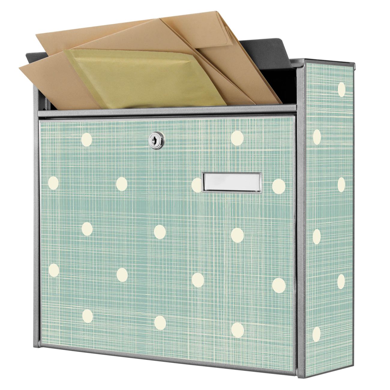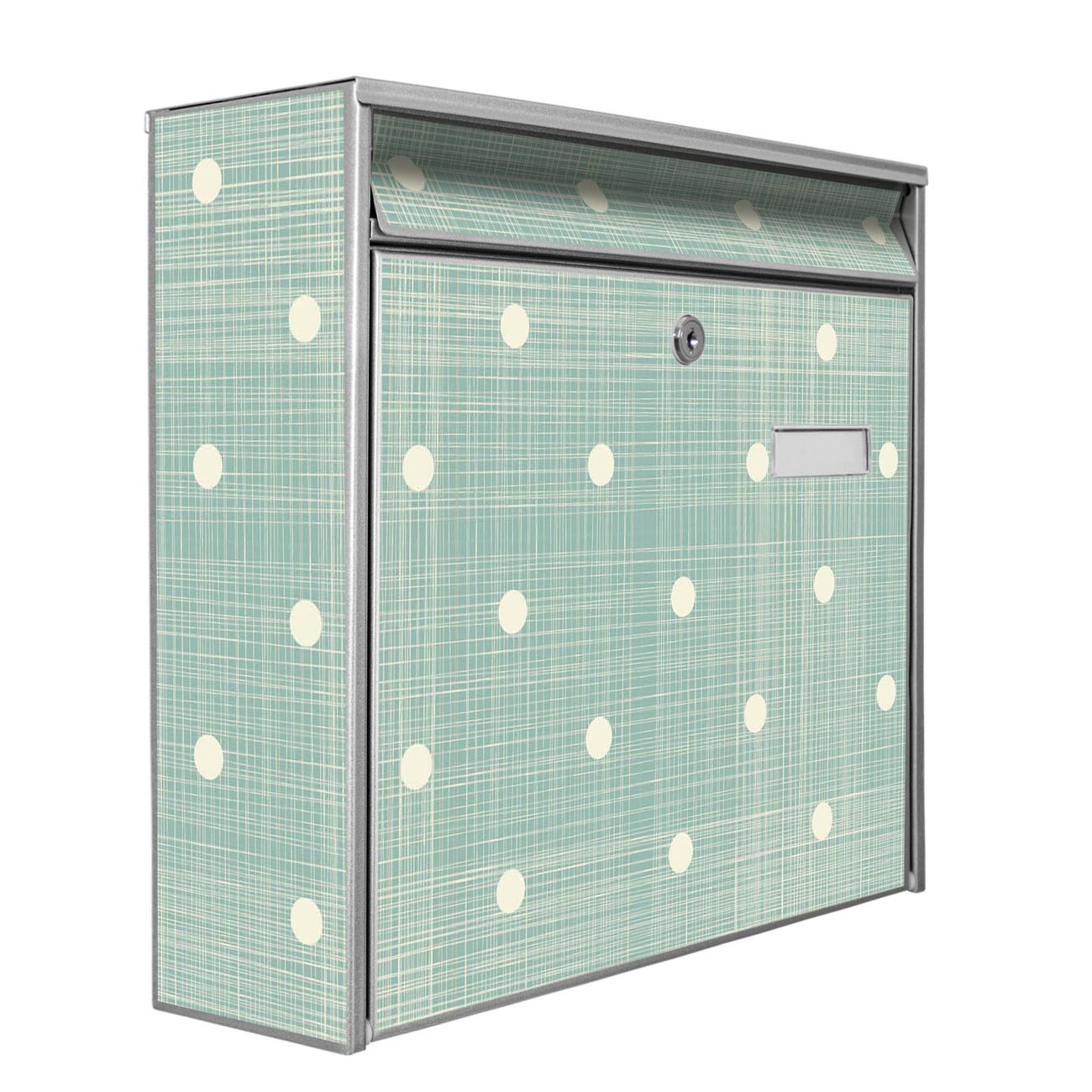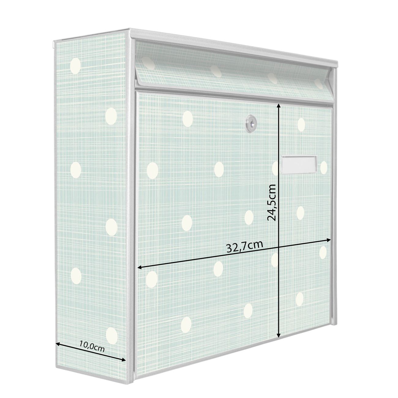 Der Burg Wächter Mail Briefkasten mit Motiv Punkte Lindgrün bietet Ihnen mit seinem Fassungsvermögen genügend Platz auch für große A4 Sendungen. Auf Wunsch können Sie bei uns den passenden Standfuß kaufen und so aus dem Wandbriefkasten einen Standbriefkasten machen. Wir bieten Ihnen ebenfalls Namensschilder, bereits beschriftet oder frei zu beschriften, und verschiedene selbst gestaltete Bitte-Keine-Werbung-Aufkleber.