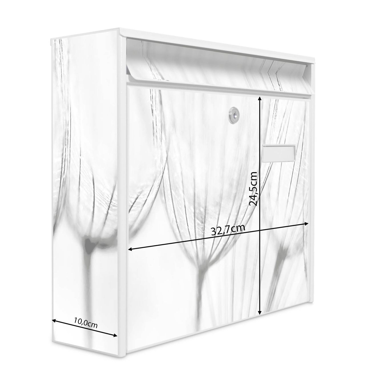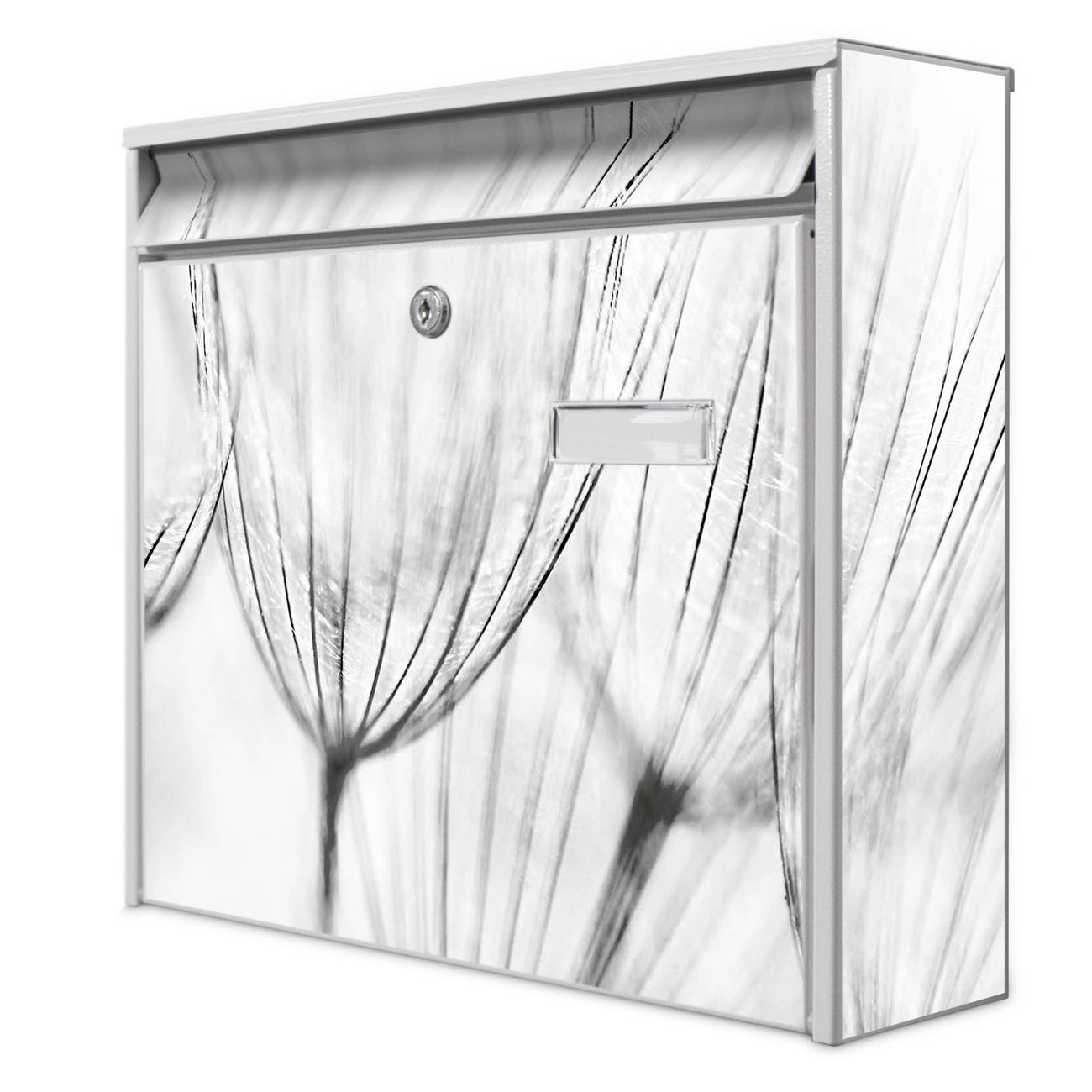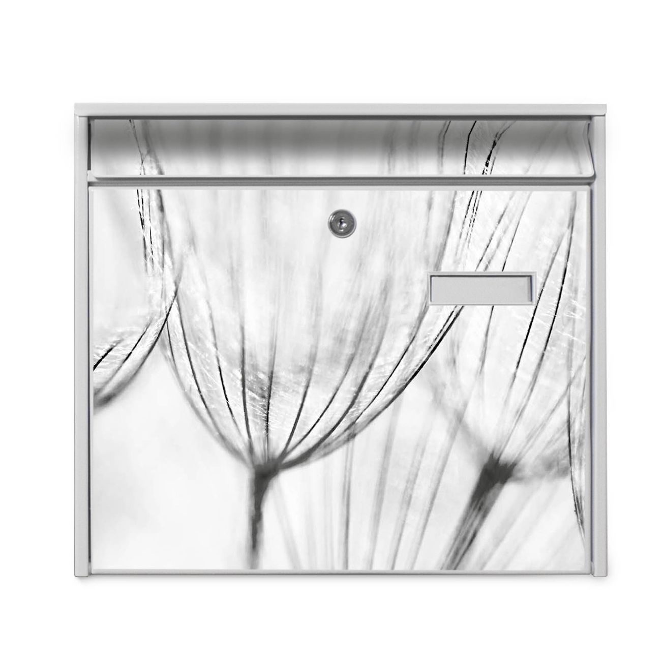 Der Burg Wächter Mail Briefkasten mit Motiv Pusteblumen SW bietet Ihnen mit seinem Fassungsvermögen genügend Platz auch für große A4 Sendungen. Auf Wunsch können Sie bei uns den passenden Standfuß kaufen und so aus dem Wandbriefkasten einen Standbriefkasten machen. Wir bieten Ihnen ebenfalls Namensschilder, bereits beschriftet oder frei zu beschriften, und verschiedene selbst gestaltete Bitte-Keine-Werbung-Aufkleber.