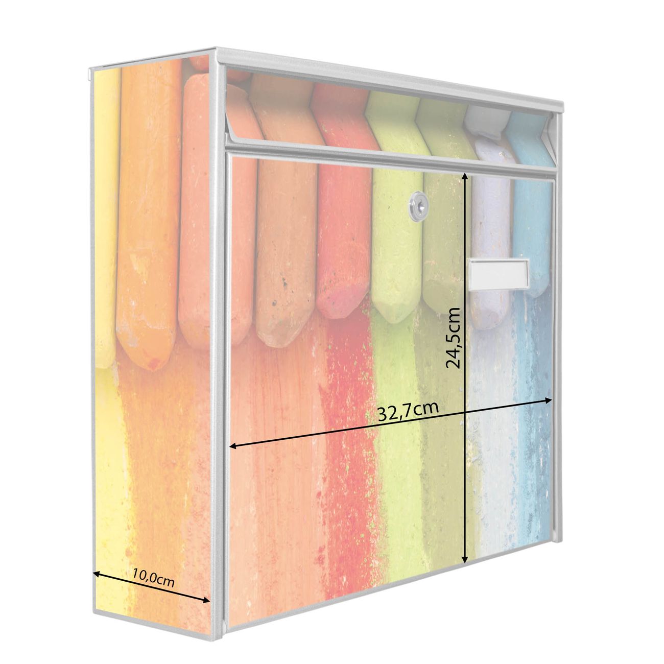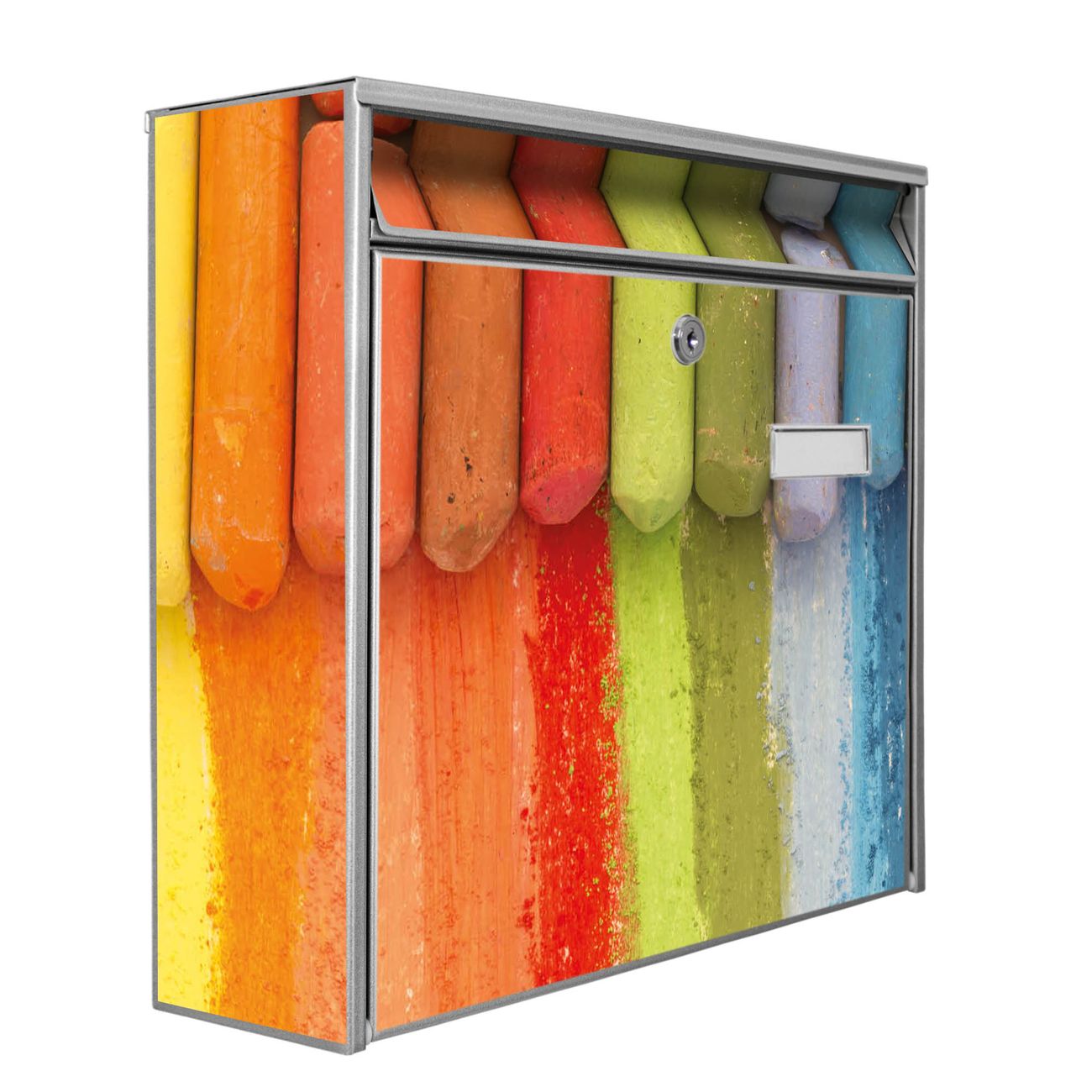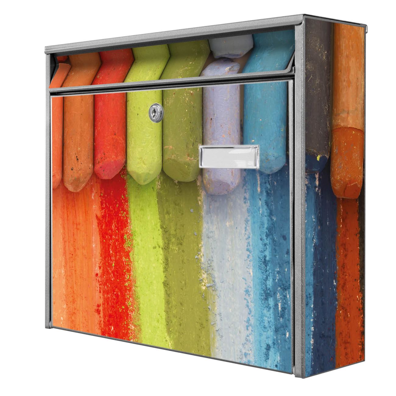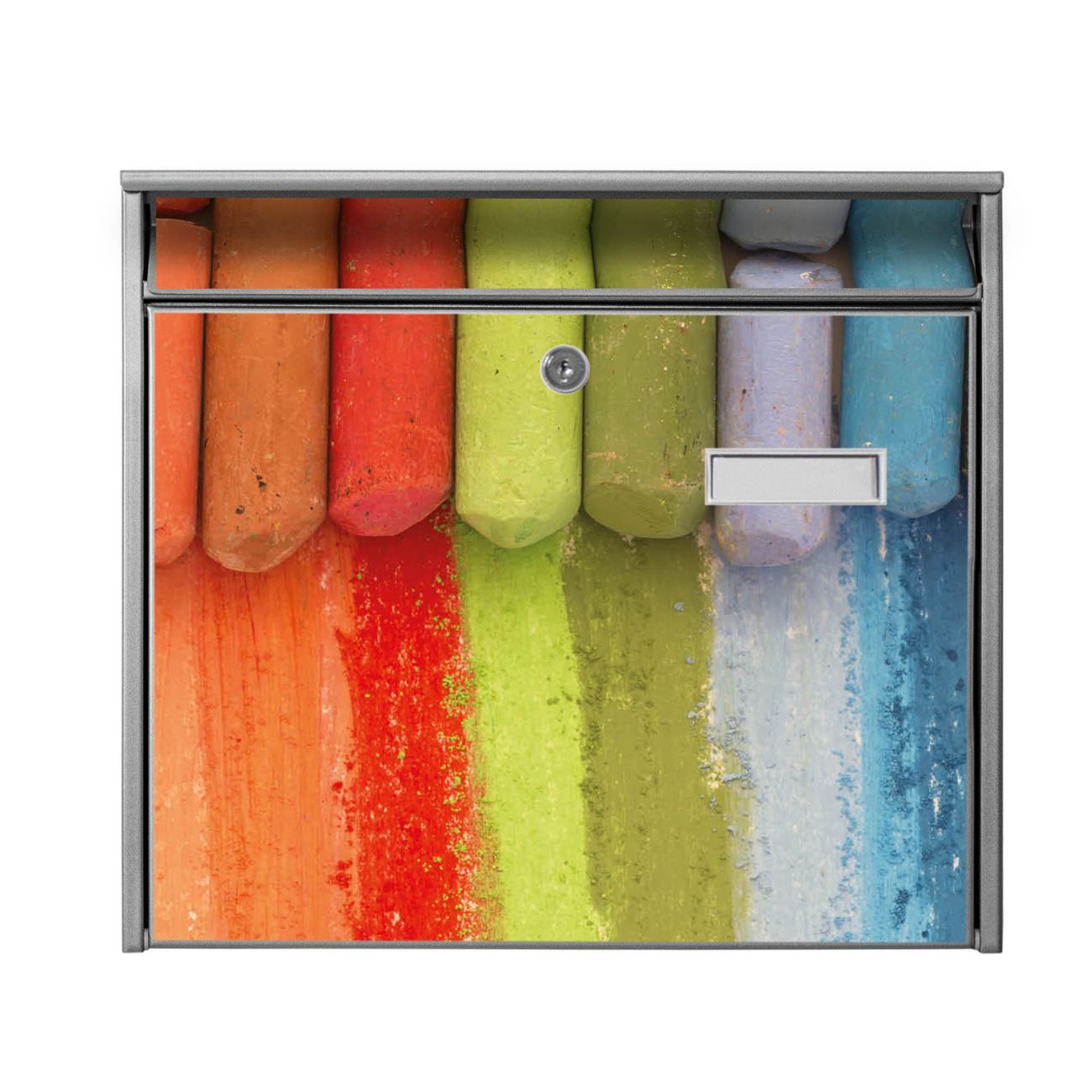 Der Burg Wächter Mail Briefkasten mit Motiv Regenbogenkreide bietet Ihnen mit seinem Fassungsvermögen genügend Platz auch für große A4 Sendungen. Auf Wunsch können Sie bei uns den passenden Standfuß kaufen und so aus dem Wandbriefkasten einen Standbriefkasten machen. Wir bieten Ihnen ebenfalls Namensschilder, bereits beschriftet oder frei zu beschriften, und verschiedene selbst gestaltete Bitte-Keine-Werbung-Aufkleber.