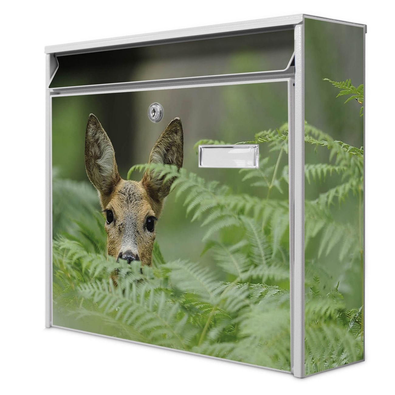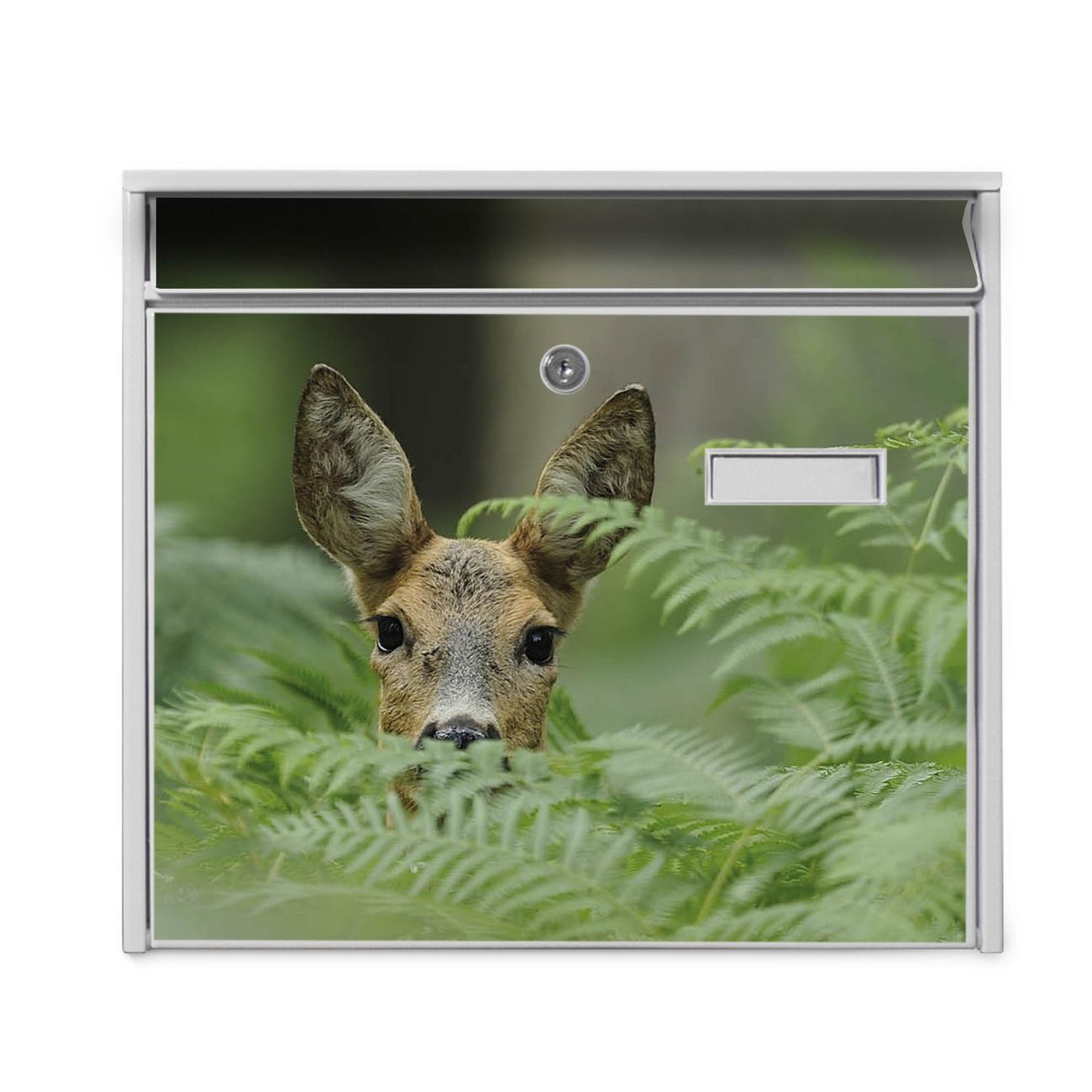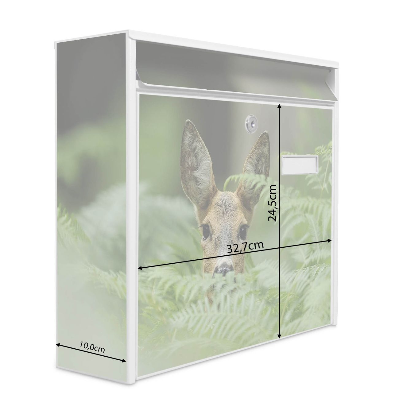 Der Burg Wächter Mail Briefkasten mit Motiv Reh bietet Ihnen mit seinem Fassungsvermögen genügend Platz auch für große A4 Sendungen. Auf Wunsch können Sie bei uns den passenden Standfuß kaufen und so aus dem Wandbriefkasten einen Standbriefkasten machen. Wir bieten Ihnen ebenfalls Namensschilder, bereits beschriftet oder frei zu beschriften, und verschiedene selbst gestaltete Bitte-Keine-Werbung-Aufkleber.