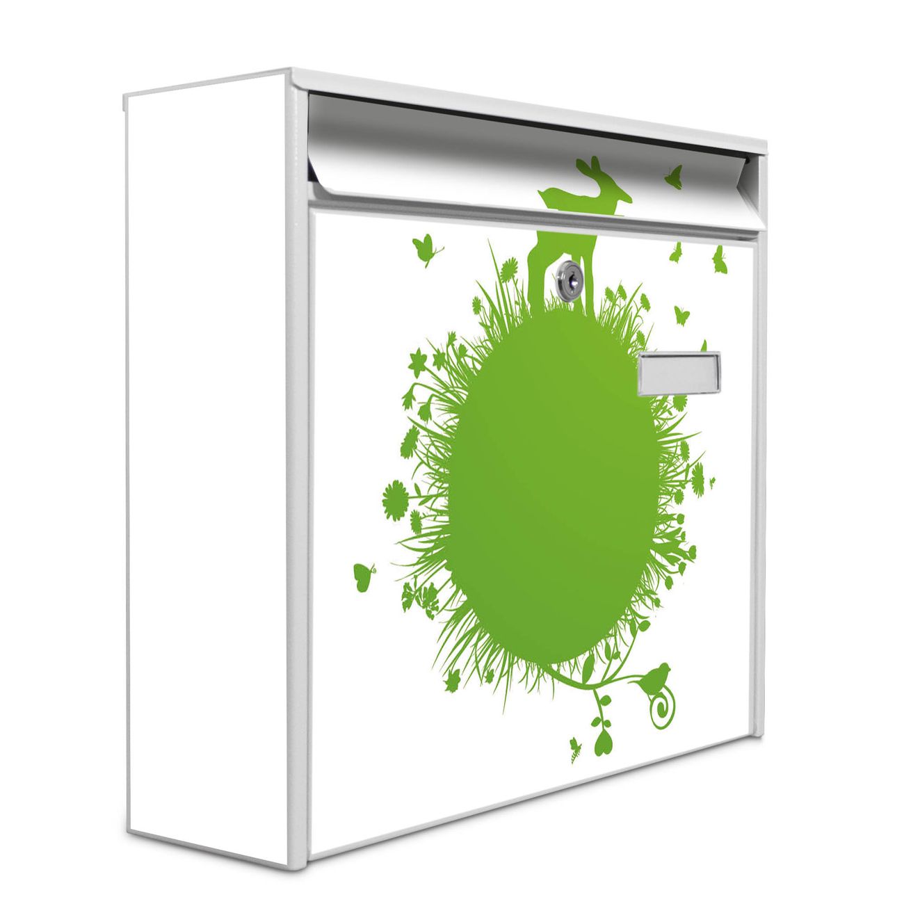 Der Burg Wächter Mail Briefkasten mit Motiv Rehkitz bietet Ihnen mit seinem Fassungsvermögen genügend Platz auch für große A4 Sendungen. Auf Wunsch können Sie bei uns den passenden Standfuß kaufen und so aus dem Wandbriefkasten einen Standbriefkasten machen. Wir bieten Ihnen ebenfalls Namensschilder, bereits beschriftet oder frei zu beschriften, und verschiedene selbst gestaltete Bitte-Keine-Werbung-Aufkleber.