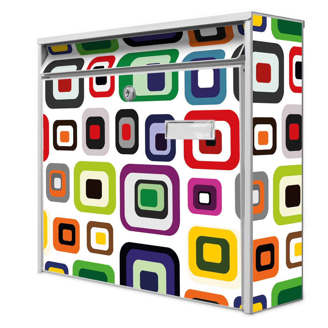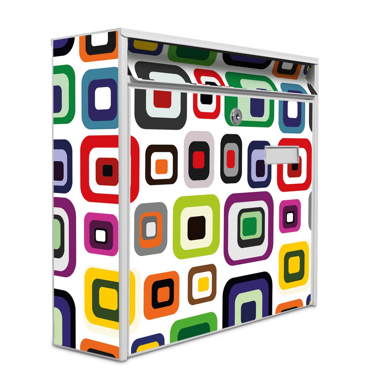 Die Größe des Briefkastens ist 36 x 32 x 10cm (BxHxT) groß. Das Motiv besteht aus einer wetter- und UV-festen Folie, die mit einem Schutzlaminat überzogen ist und Ihren Briefkasten zusätzlich vor Kratzern schützt. Sie erhalten 2 Schlüssel sowie das Montagematerial.